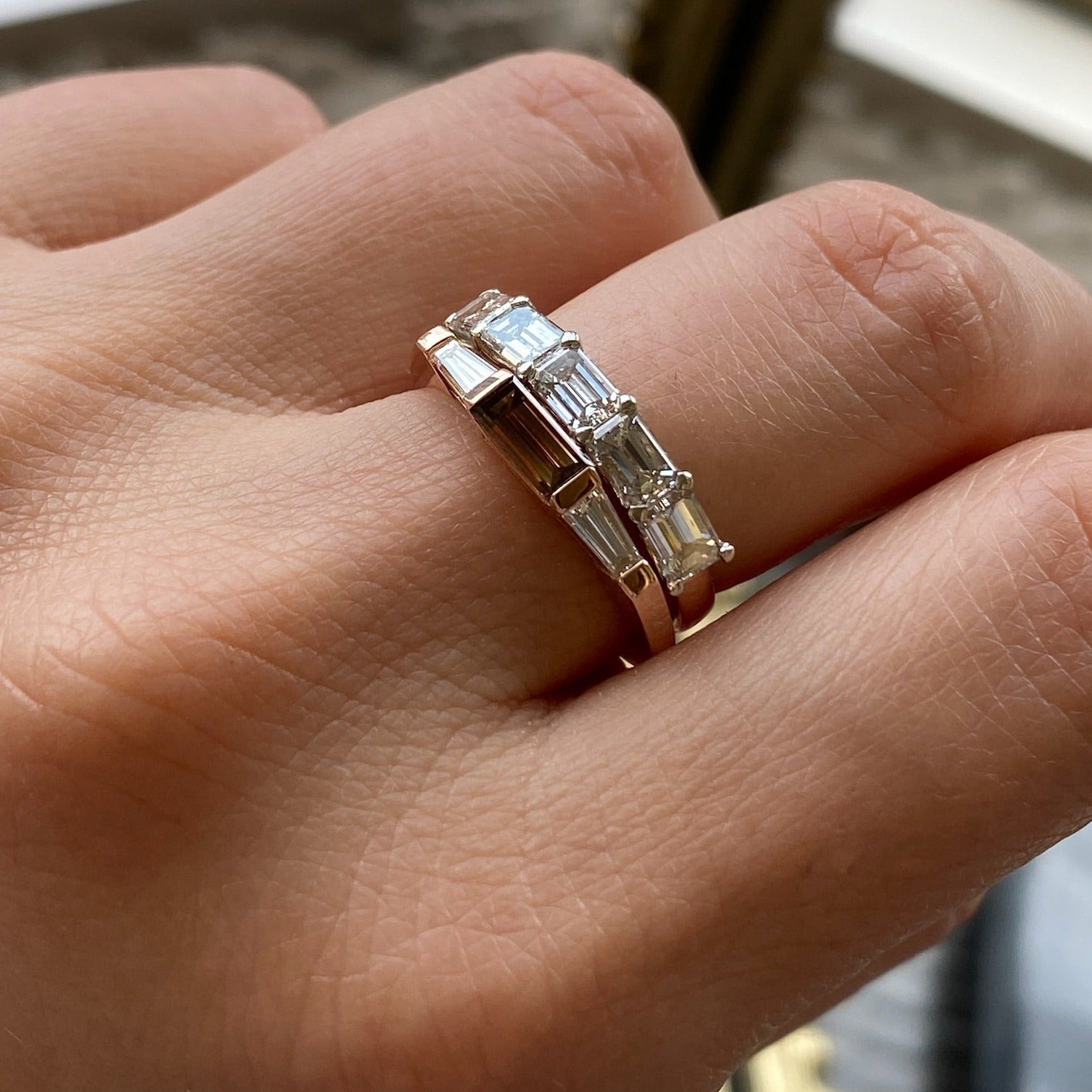 A chocolate brown natural diamond weighing 0.45 carats and flanked by a pair of sparkling white taper diamonds on a pink gold background.