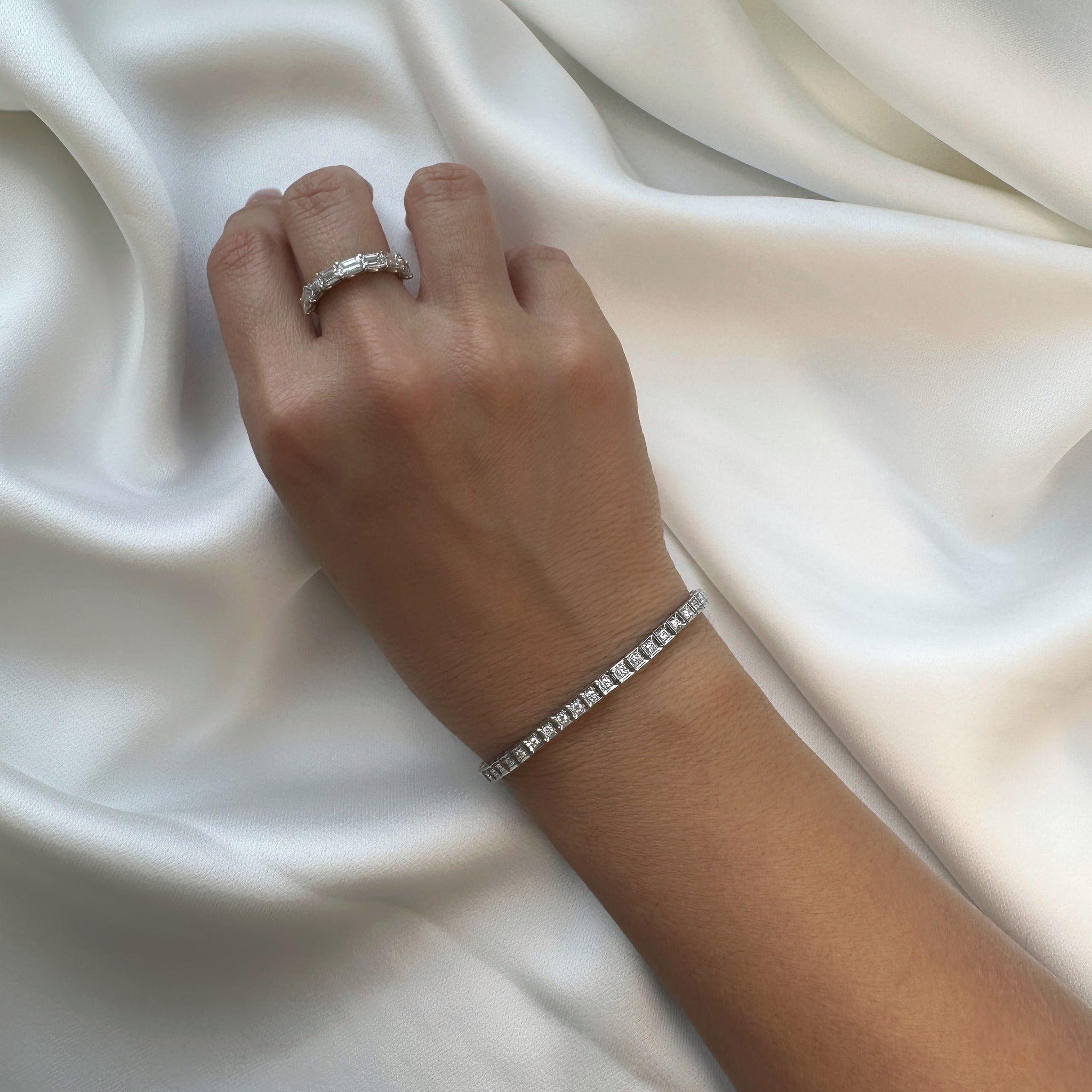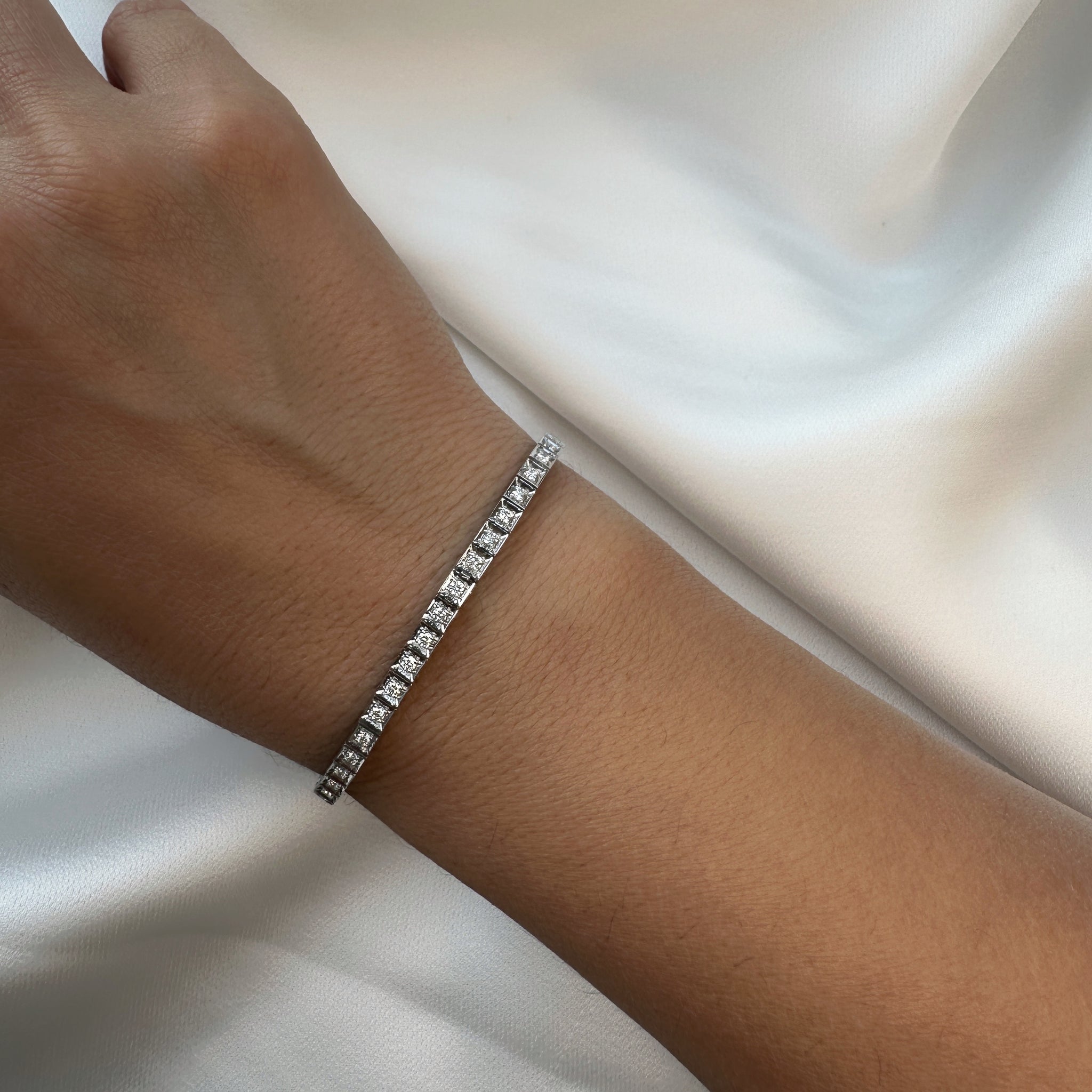 A tennis bracelet featuring sparkling round diamonds set in square gold links, adding a touch of elegance.