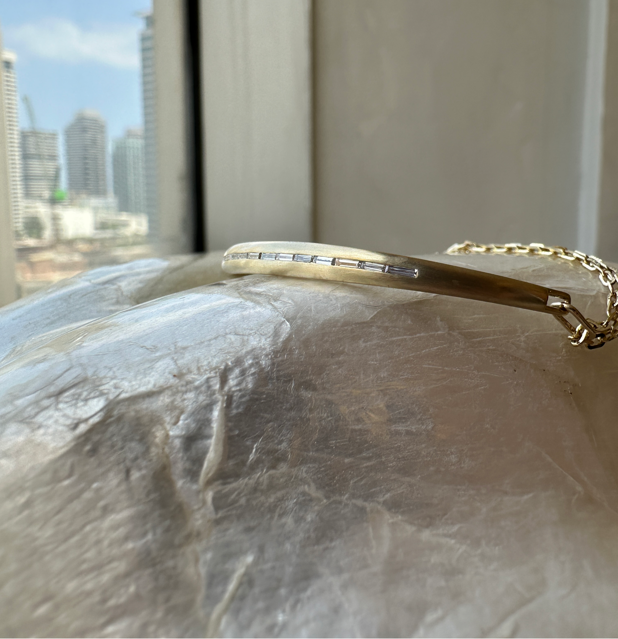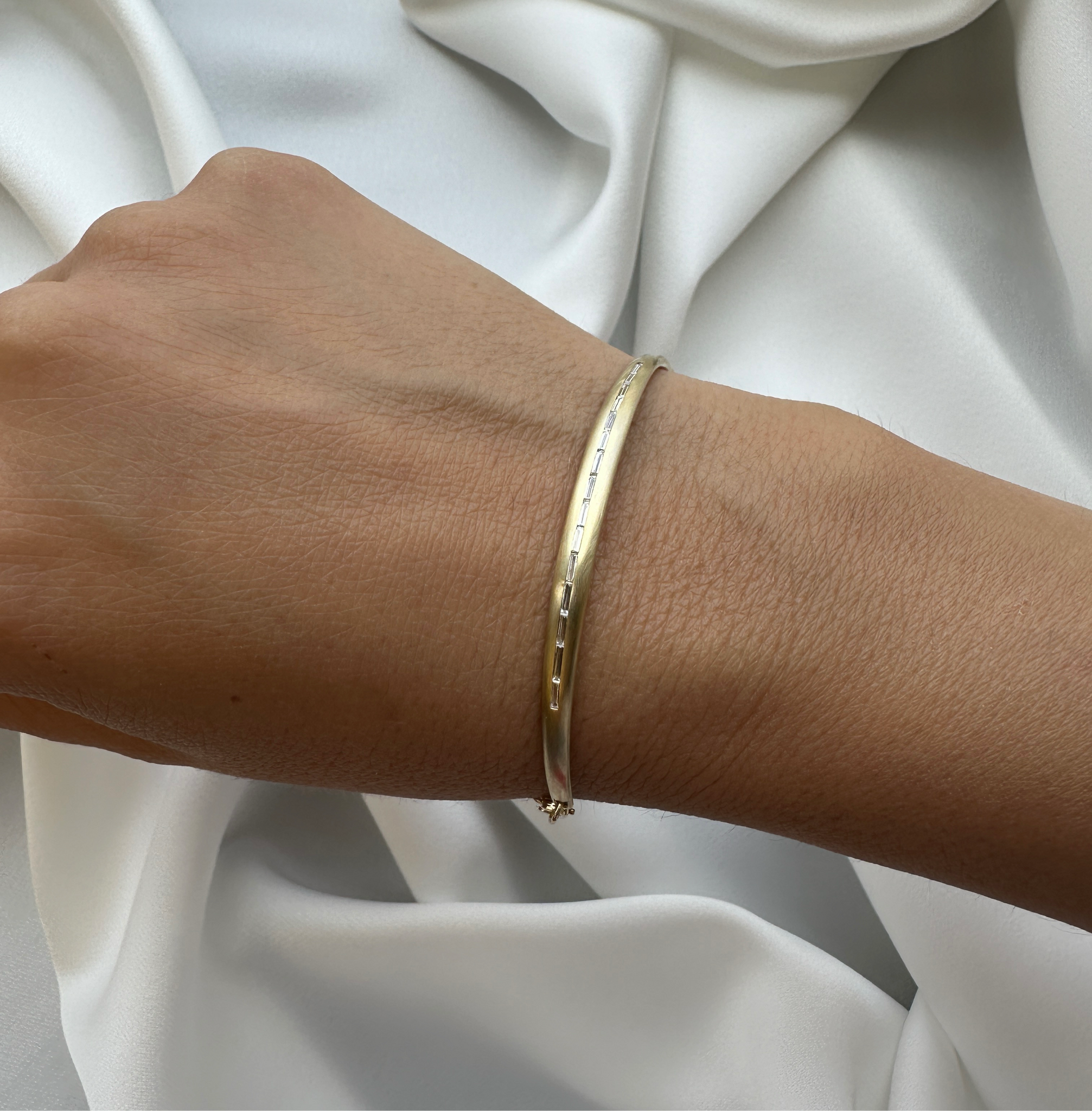 A bracelet that combines a rigid bangle with gold links. Designed with perfect, flattering proportions to enhance your bracelet collection. We selected exceptionally rare natural needle baguettes for a subtle yet distinctive presence.