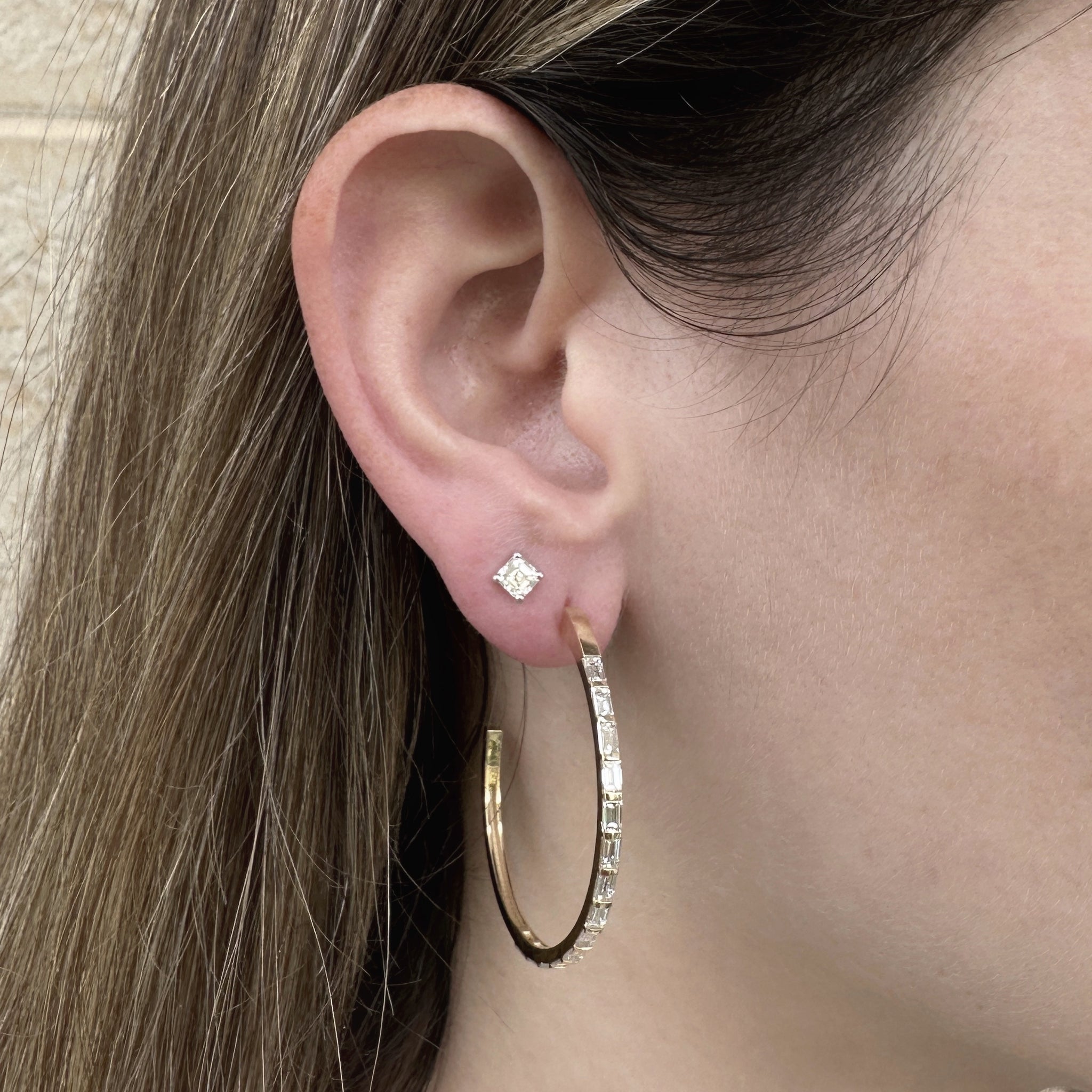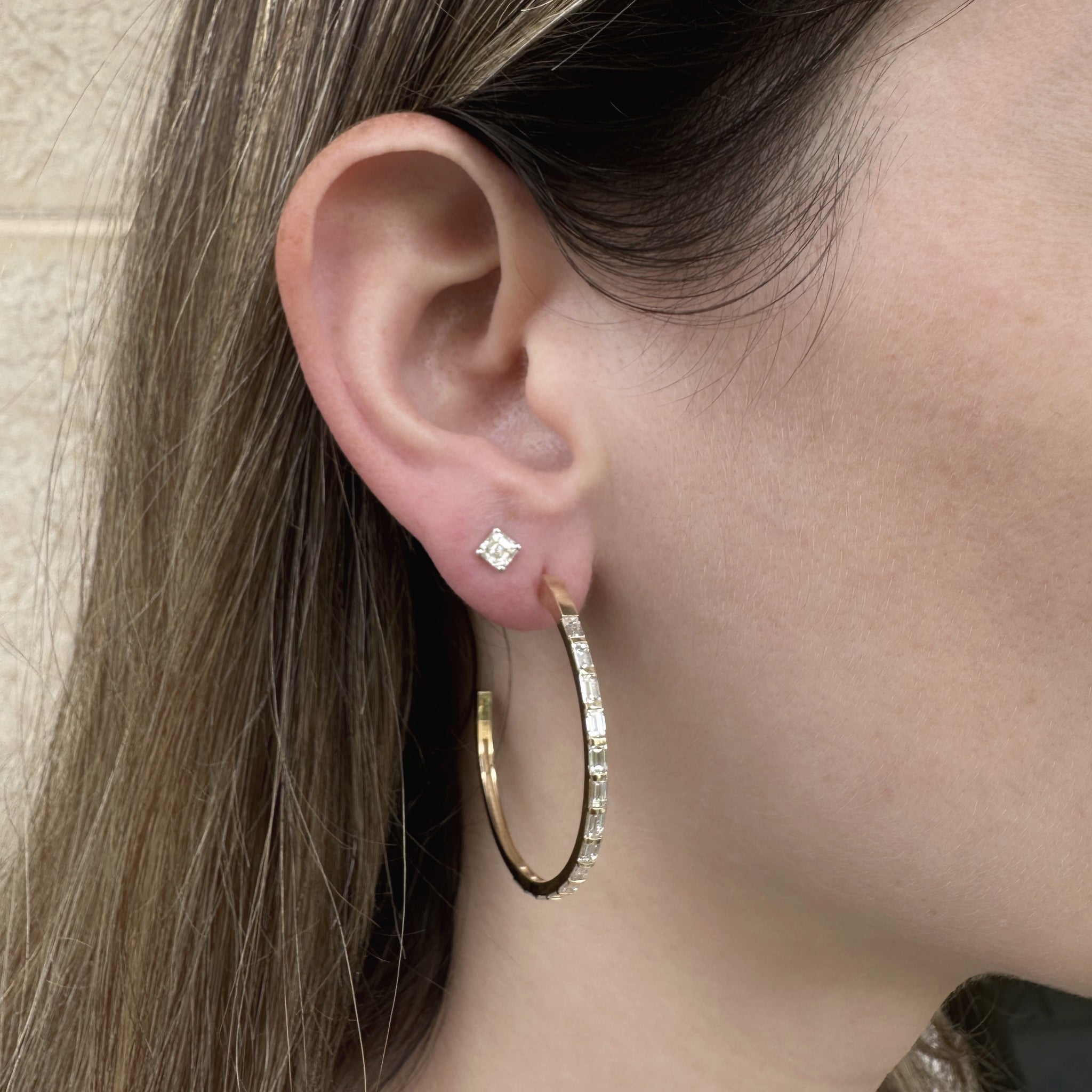 Gold Baguette Hoops, our large version. A pair of beautiful, elegant hoop earrings of a 3 cm diameter. Made of 14K gold and set with 28 high-quality baguette-cut diamonds.