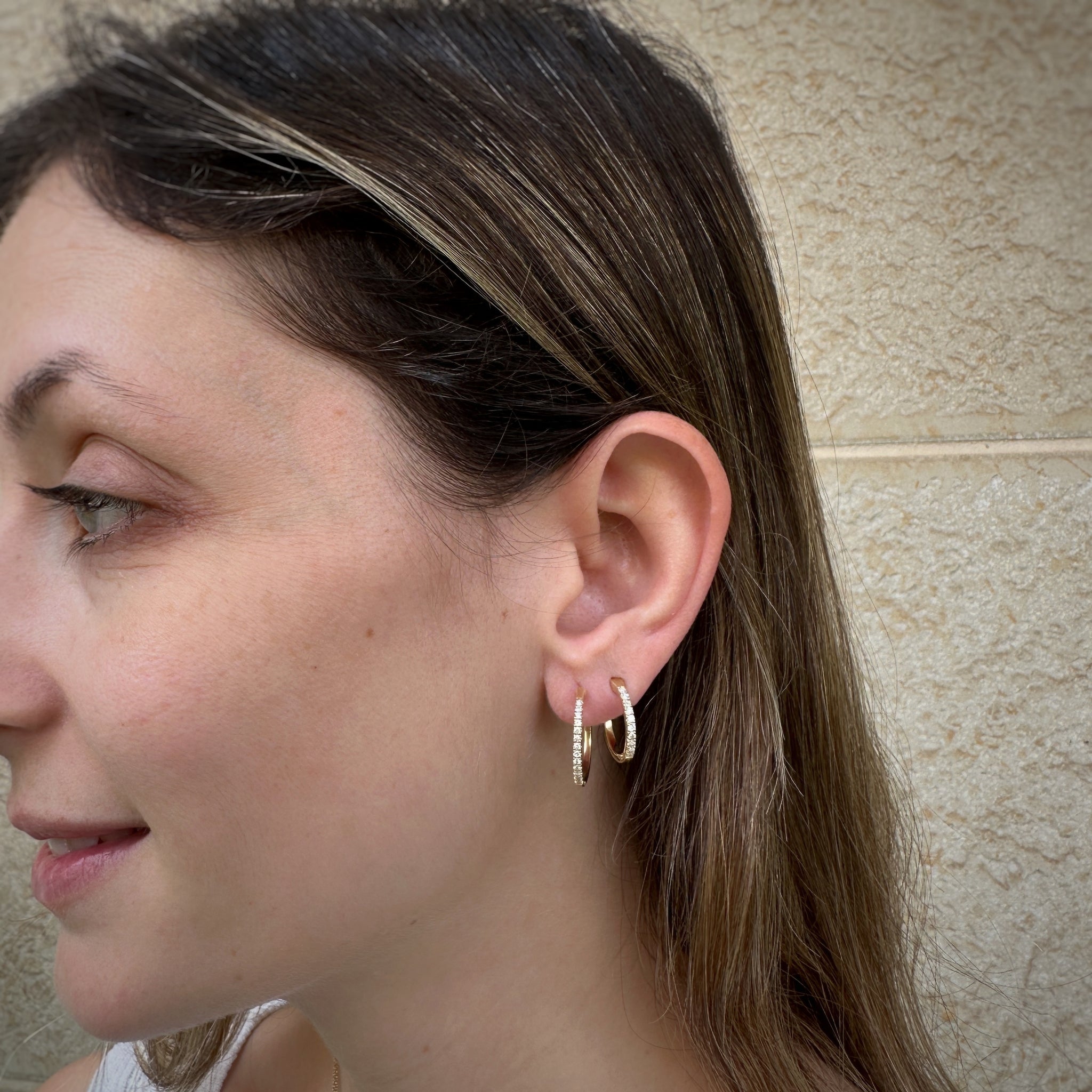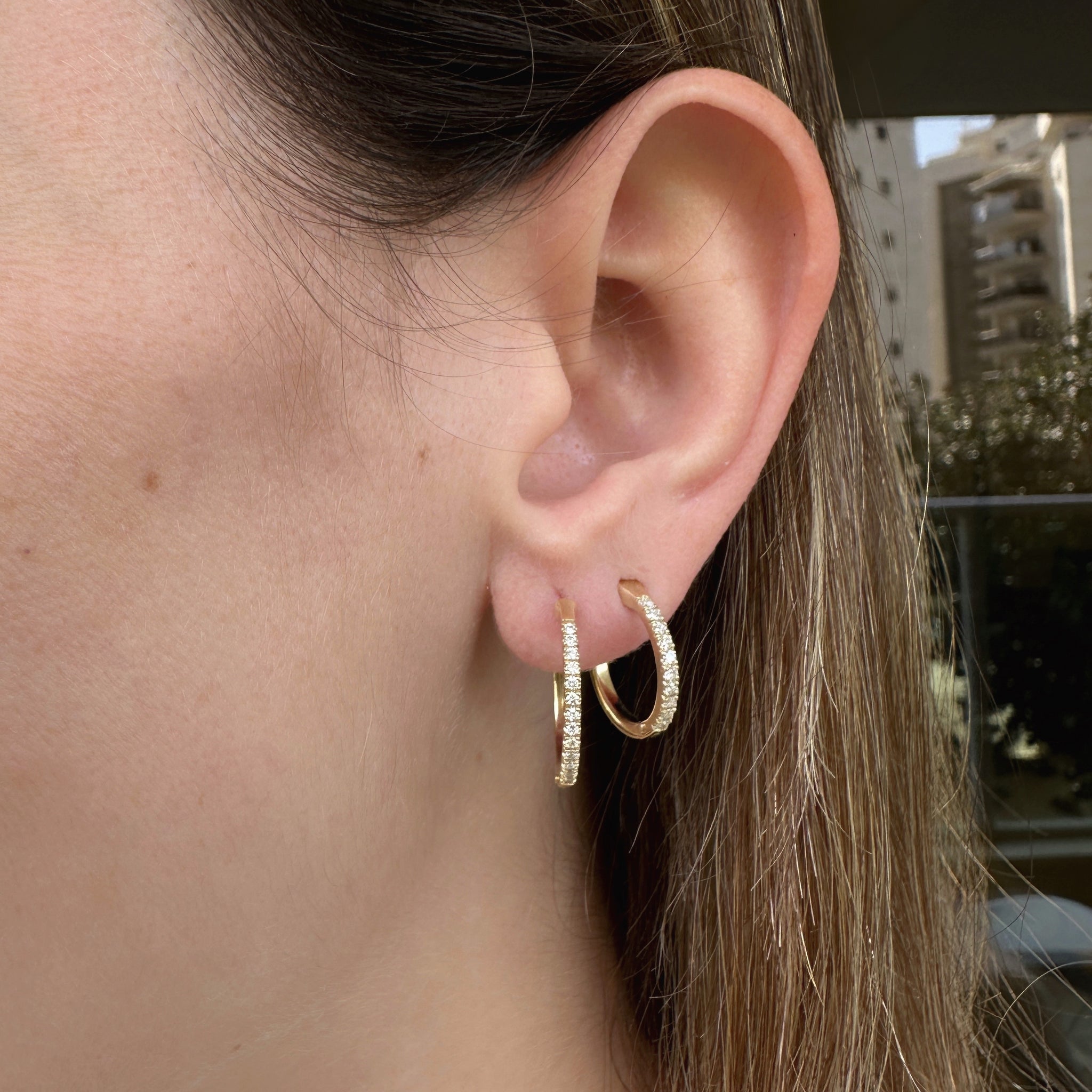 Classic gold hoops are always the right choice, set with sparkling round diamonds. The hoops are 1.5 cm diameter, lightweight, so you will never have to take them off.