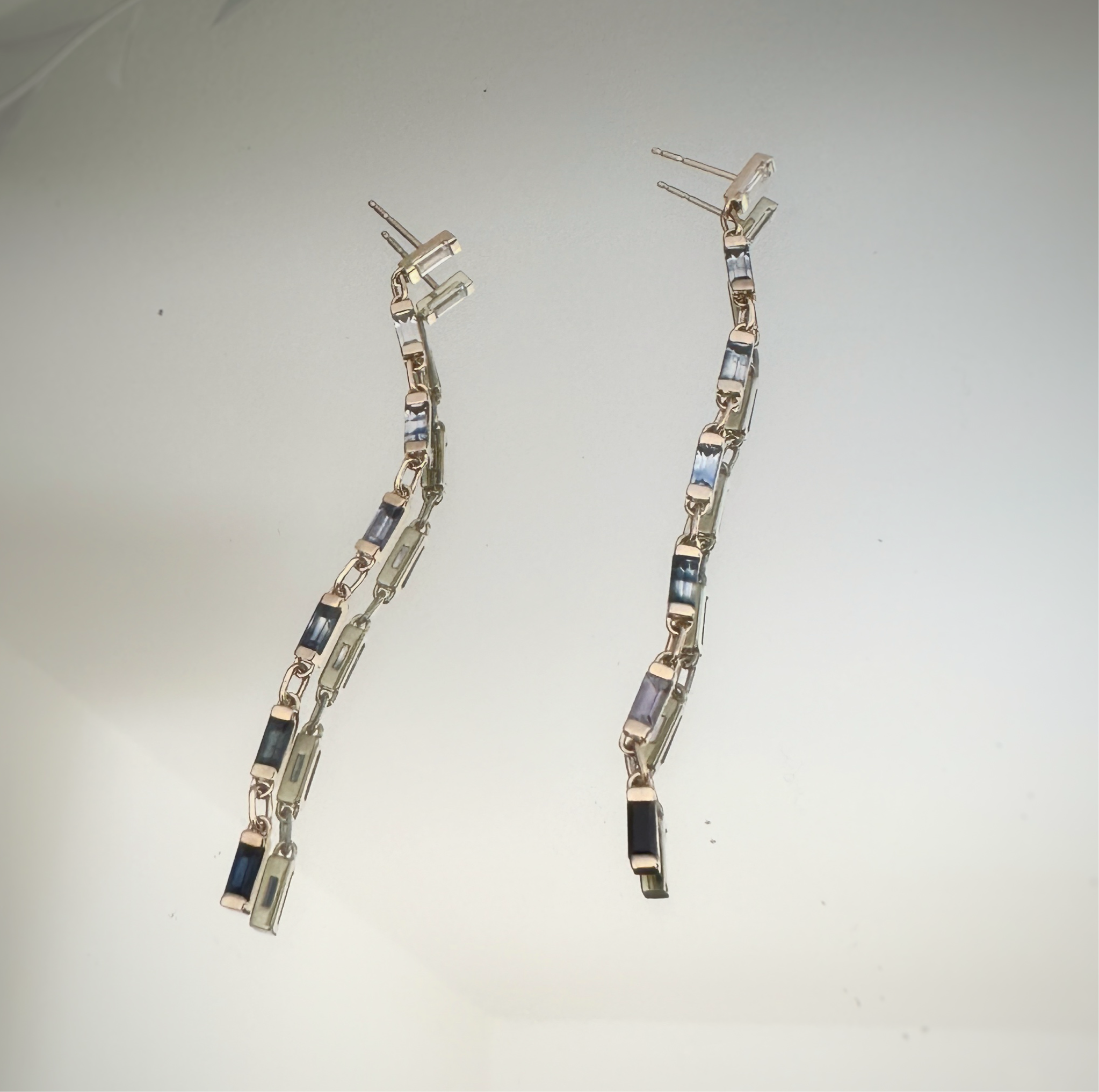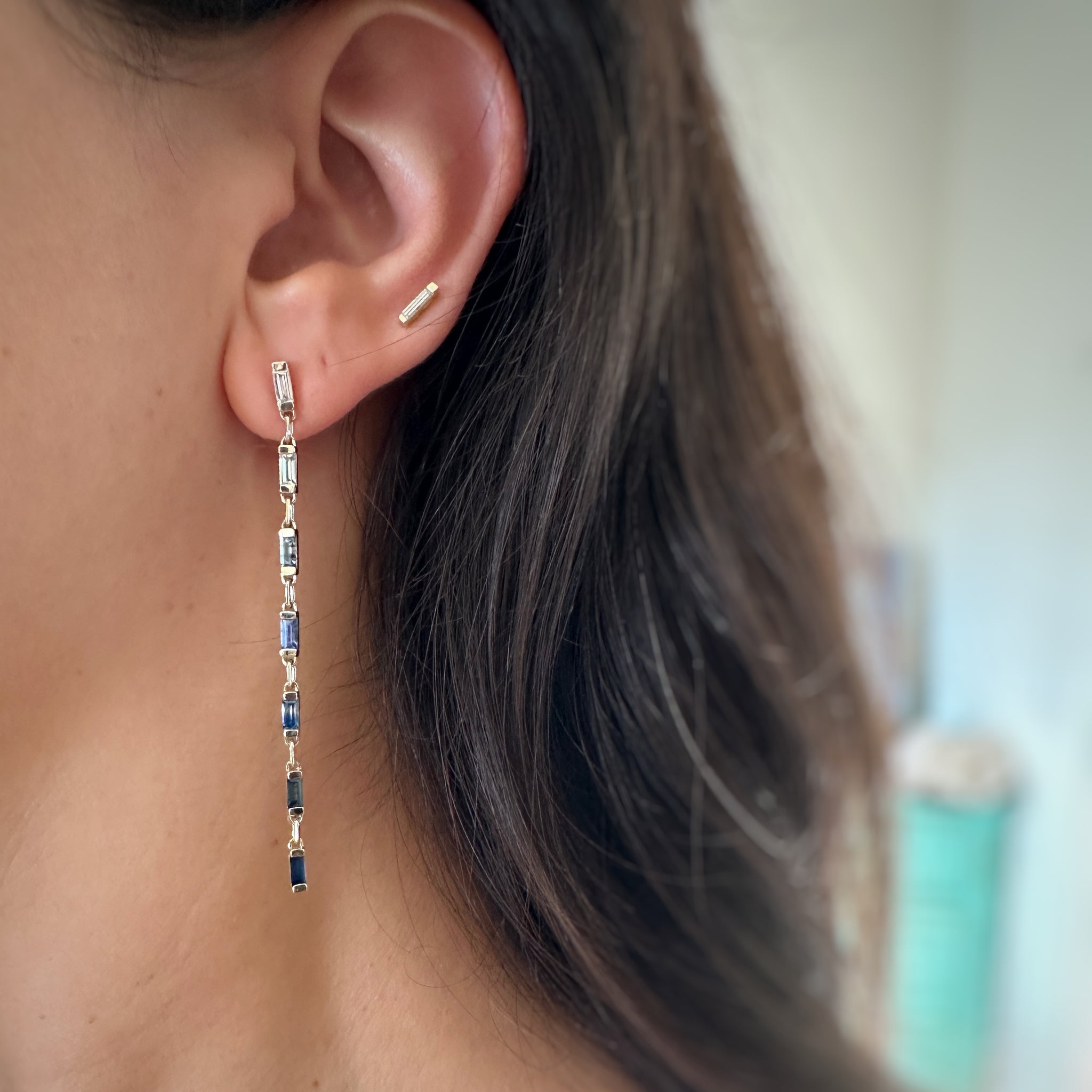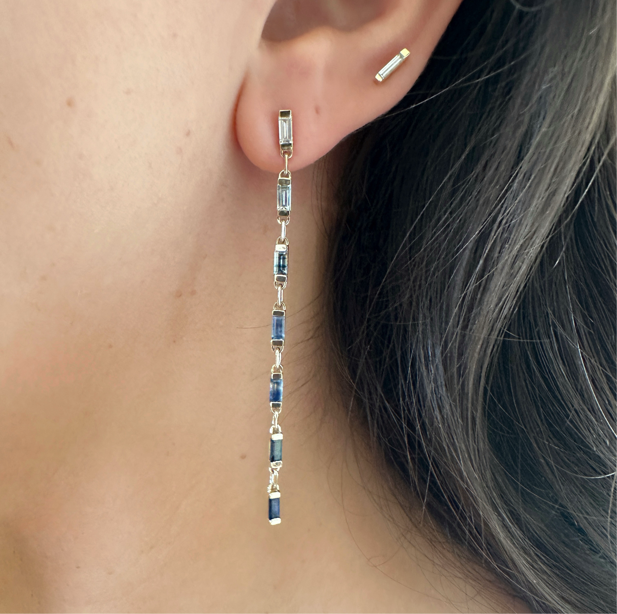 Unique drop earrings featuring baguette diamonds and natural sapphires in mesmerizing, changing shades of blue. Each earring is slightly different from the other.