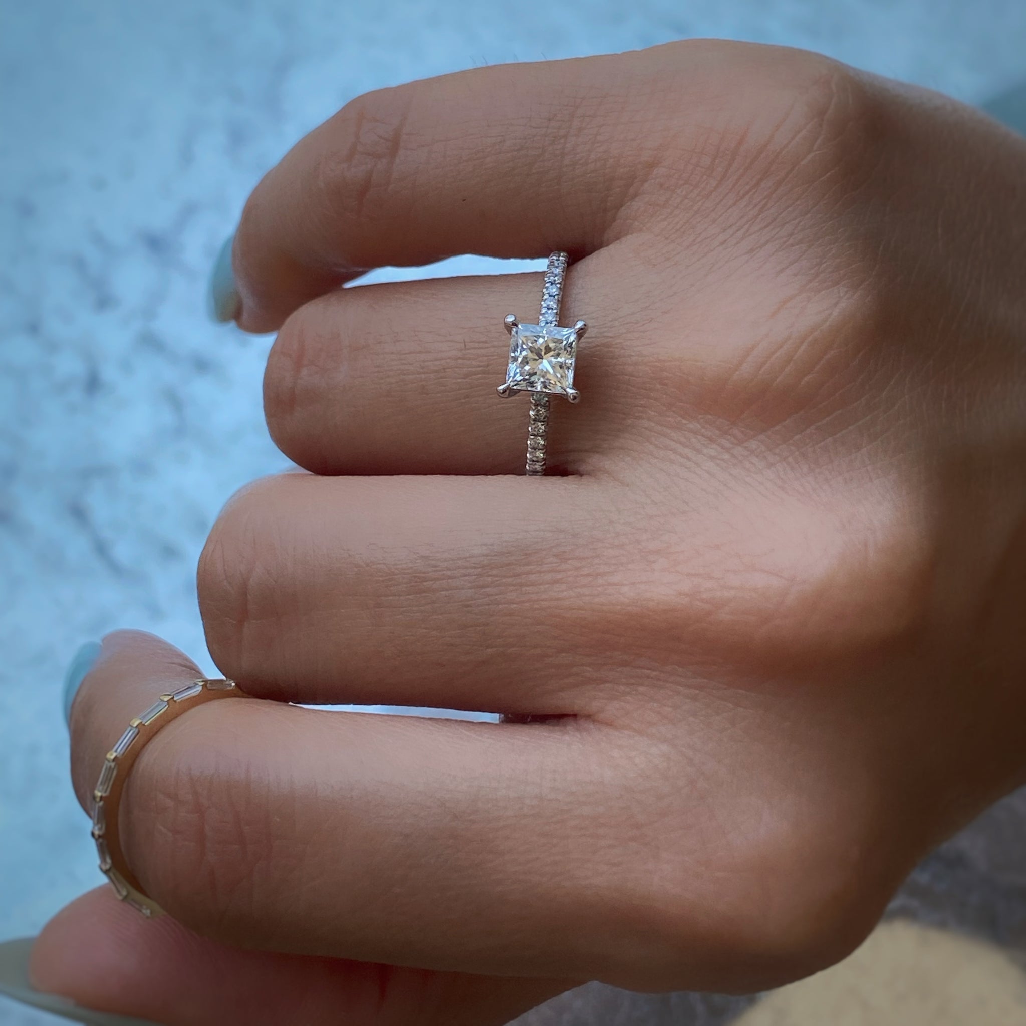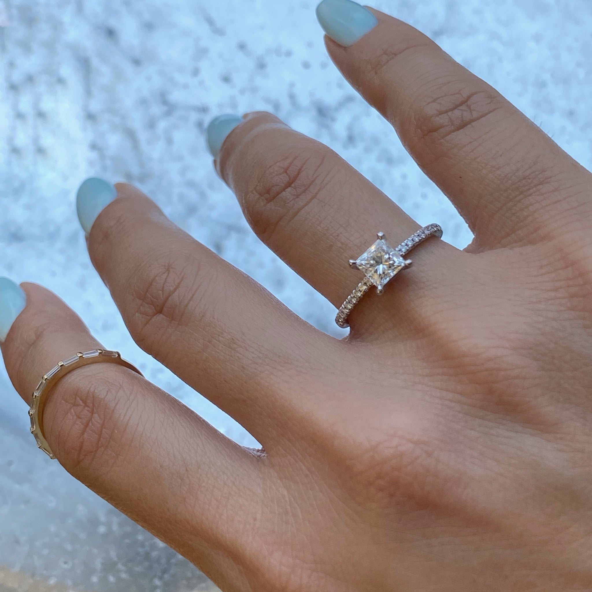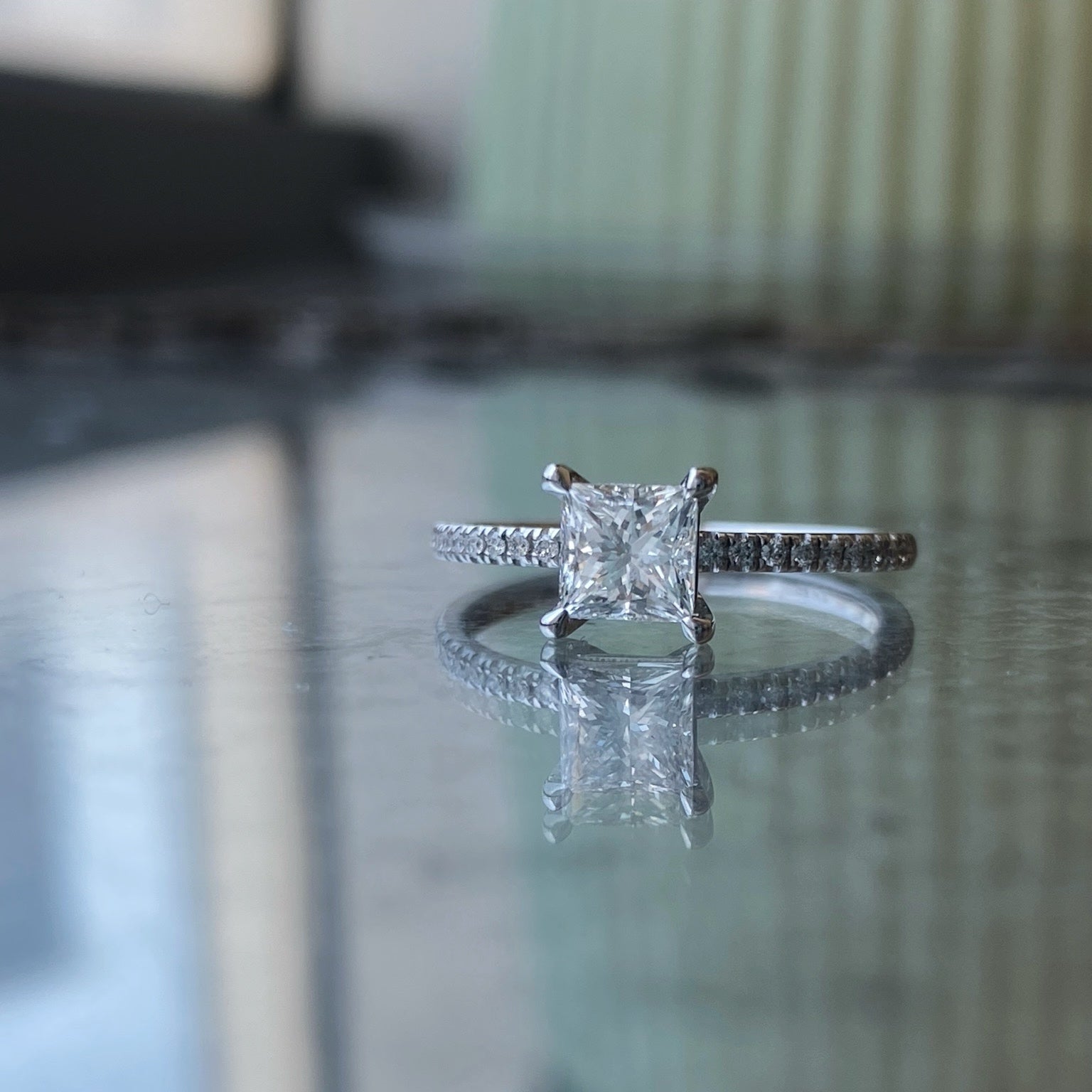A princess cut diamond in a ring studded with small sparkling diamonds. An elegant and luxurious ring with a clean and modern look.
