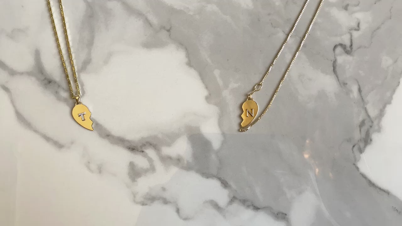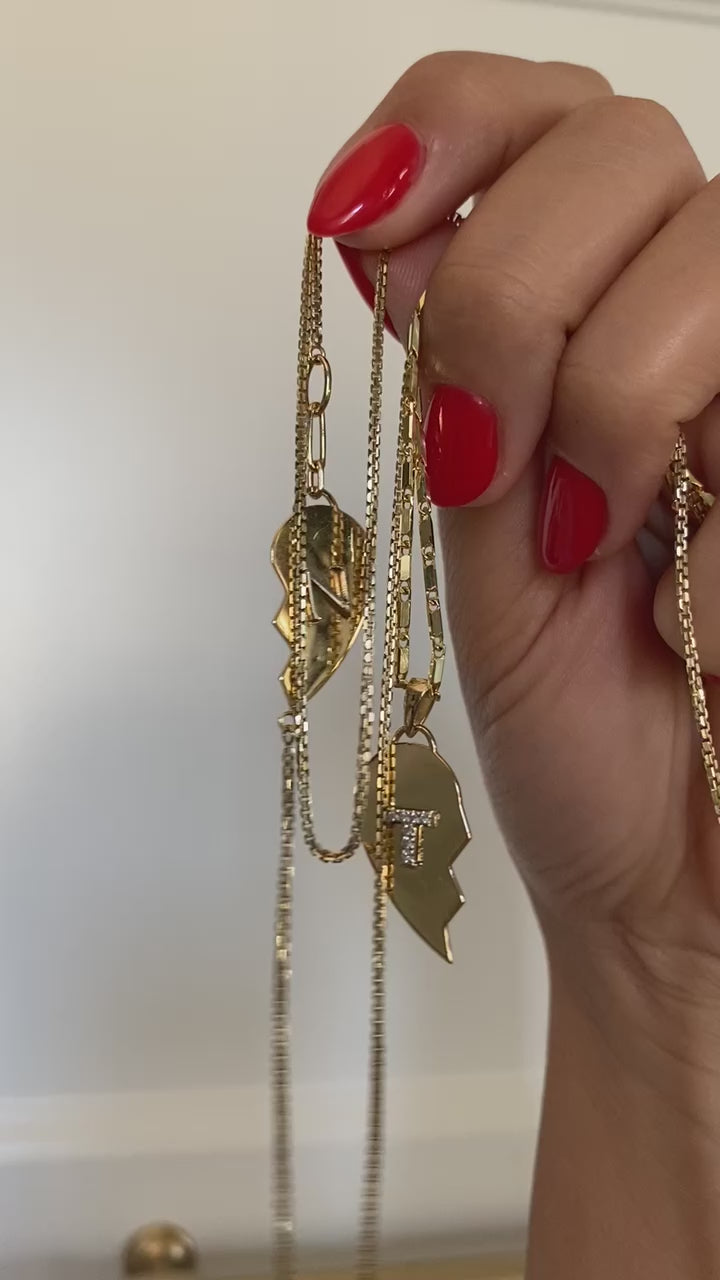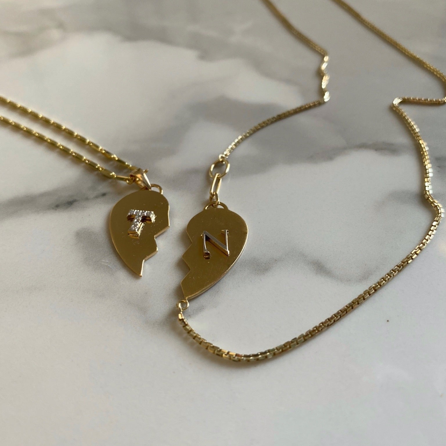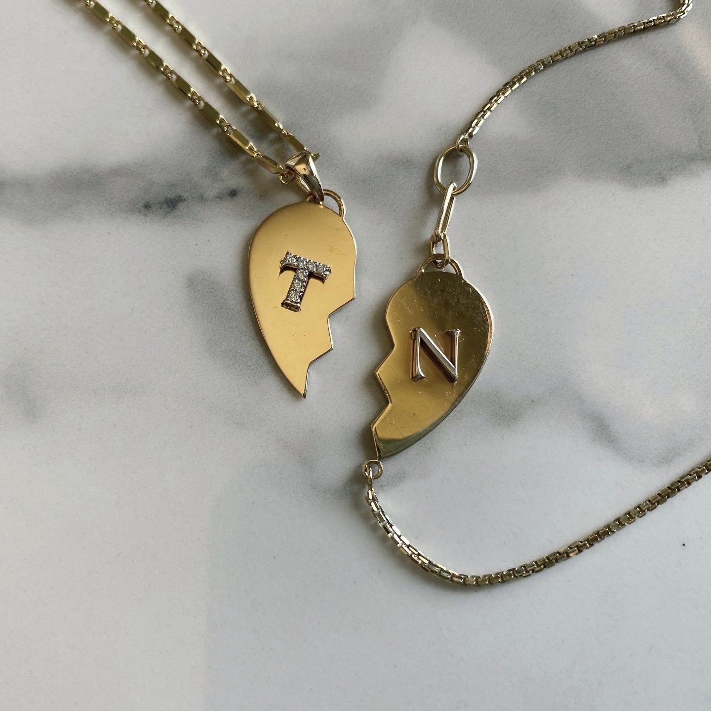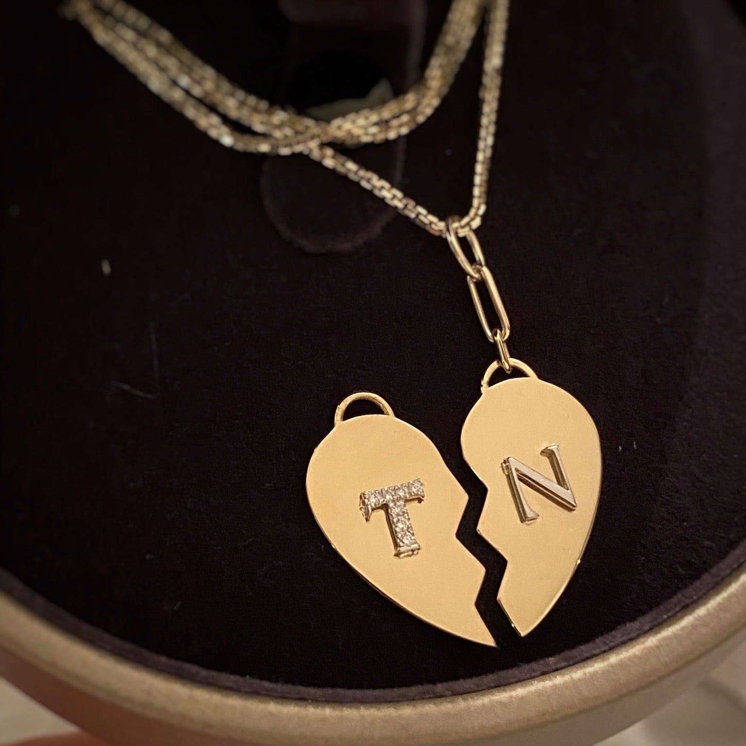 A timeless classic. Sleek, shiny gold split heart pendant, set with a diamond letter that gives you butterflies —always close to your heart.