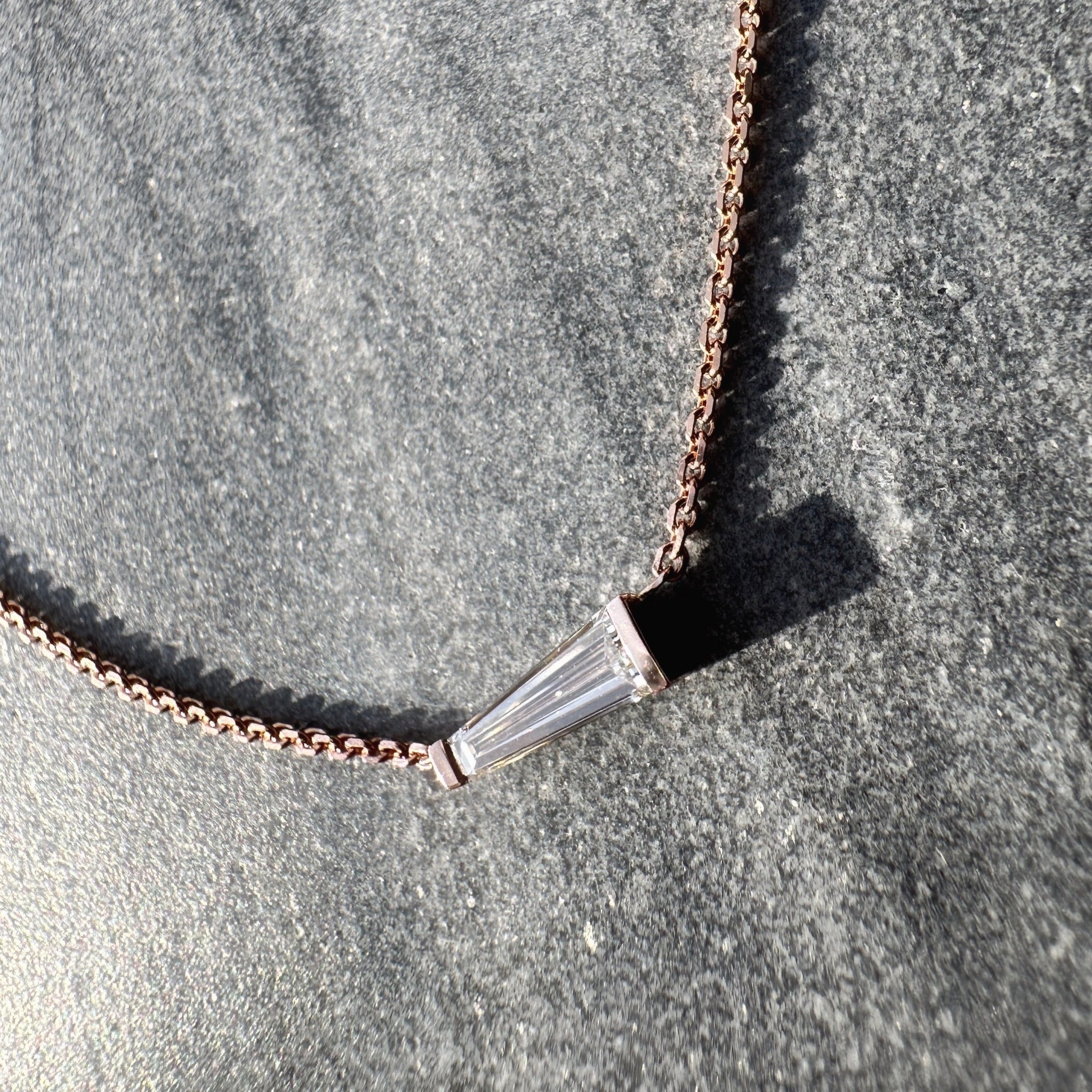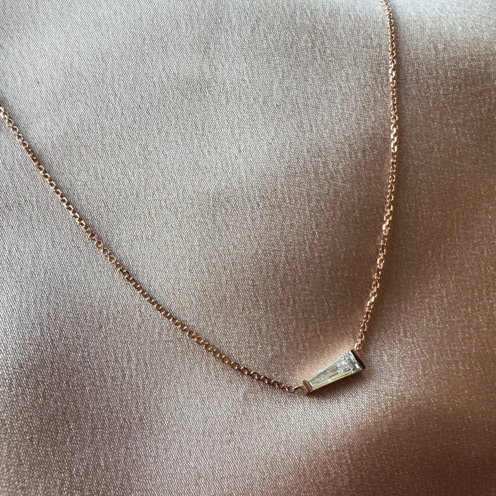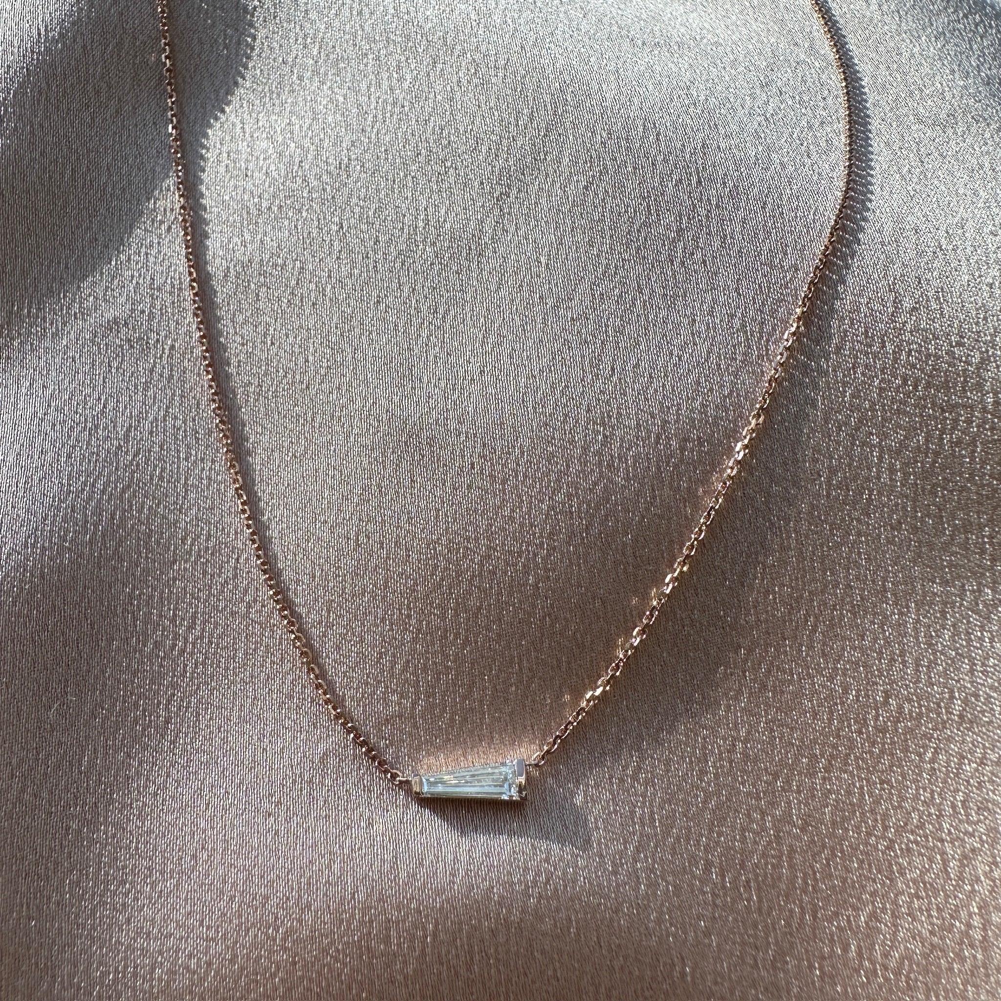 A skinny elongated Tapered Baguette Set horizontally in a delicate golden setting. One of a kind, ultra unique necklace.