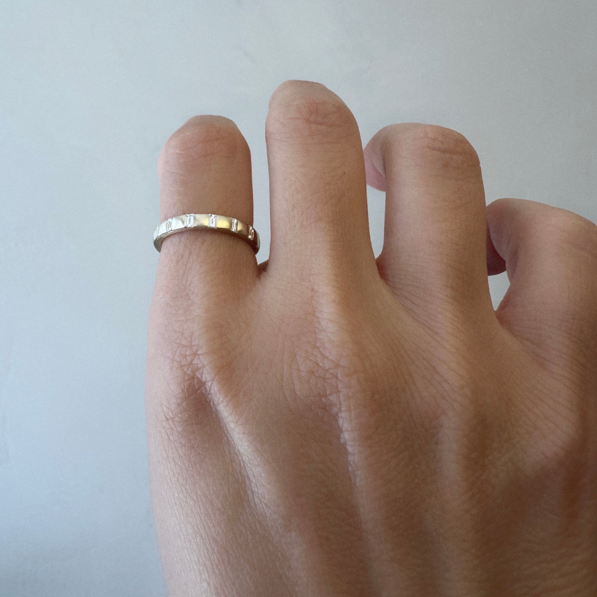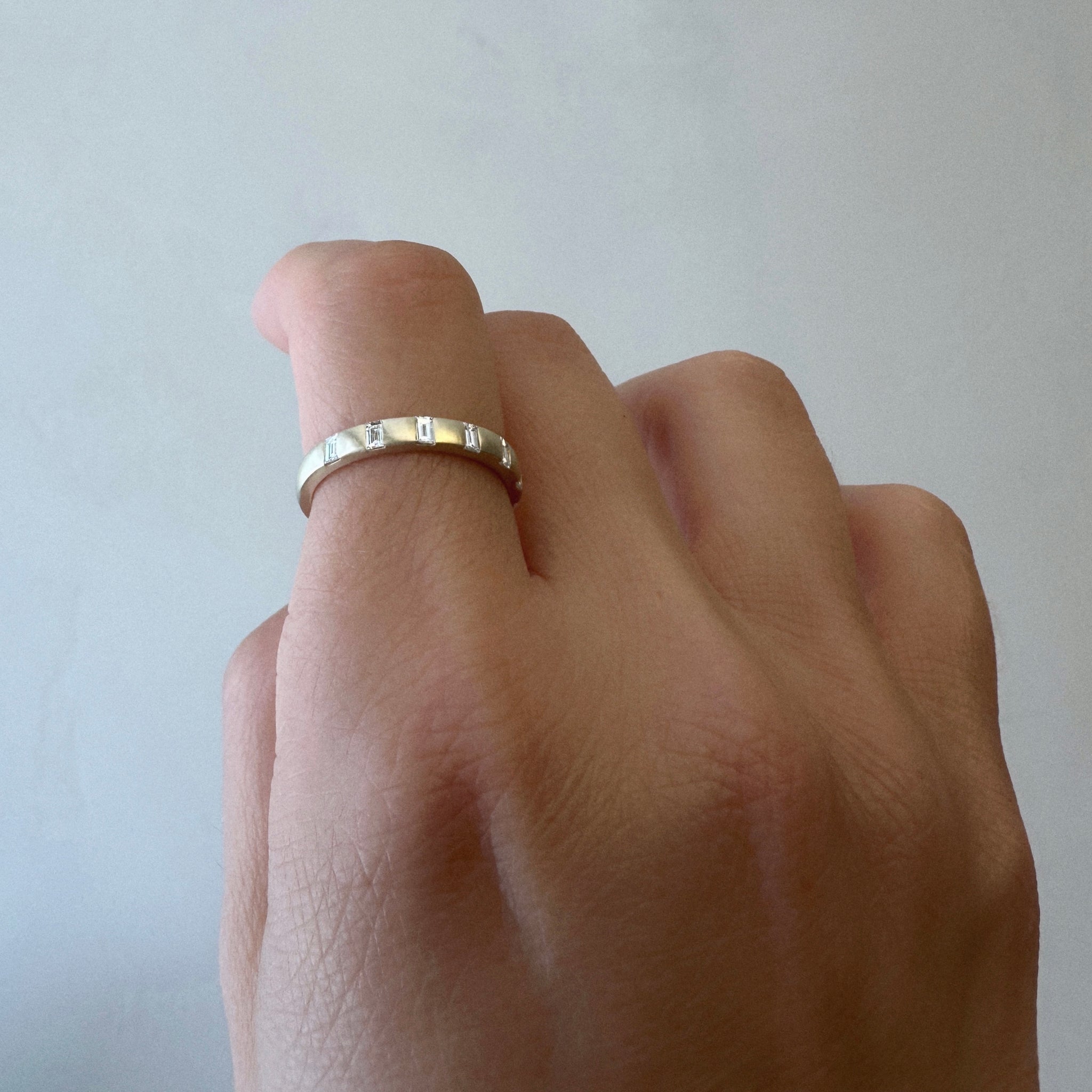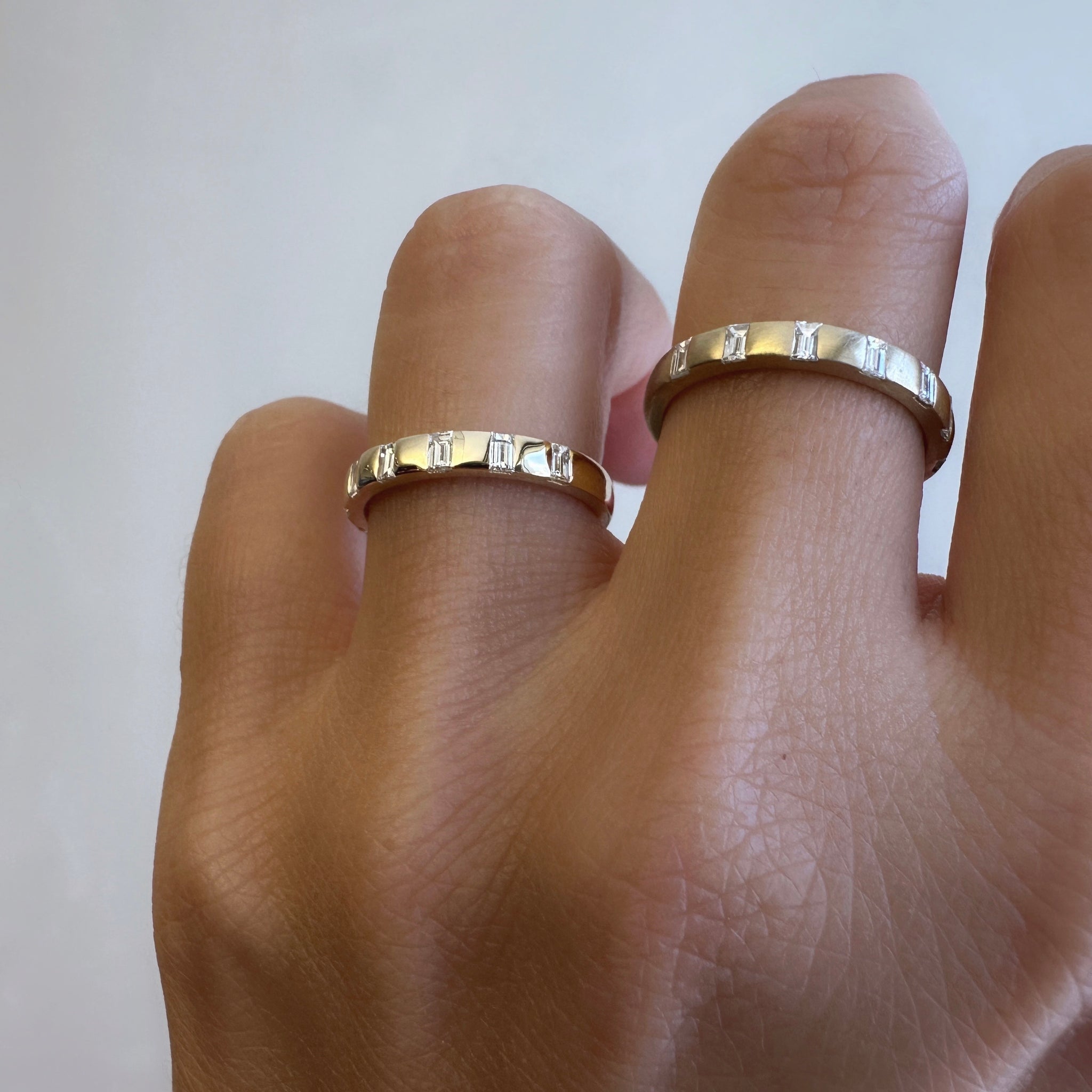 A minimalist gold ring set with 7 sparkling baguette diamonds. Perfect and eye-catching on its own, or stacked with others for extra volume.