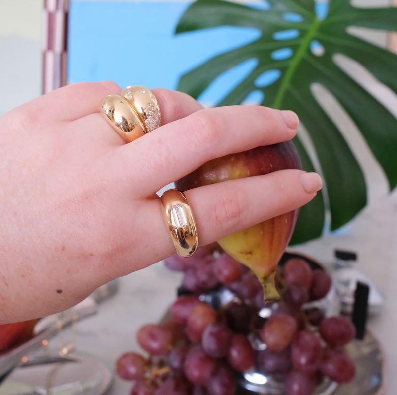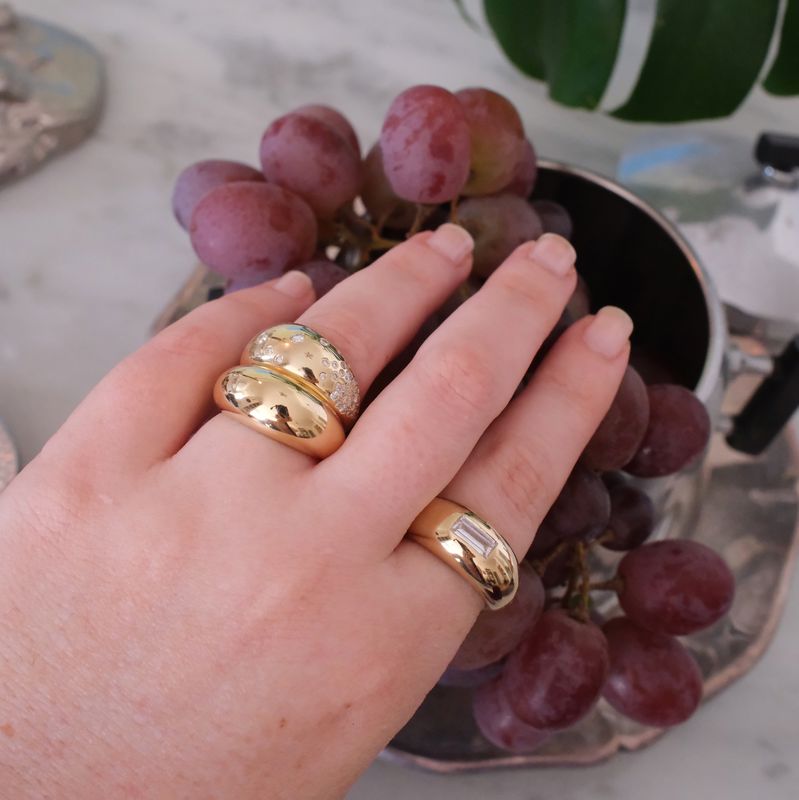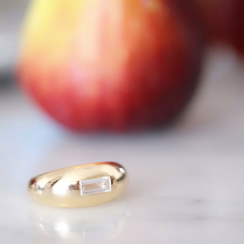 A gold dome ring, set with a stunning Baguette Diamond. A bold and beautiful addition to your ring collection.