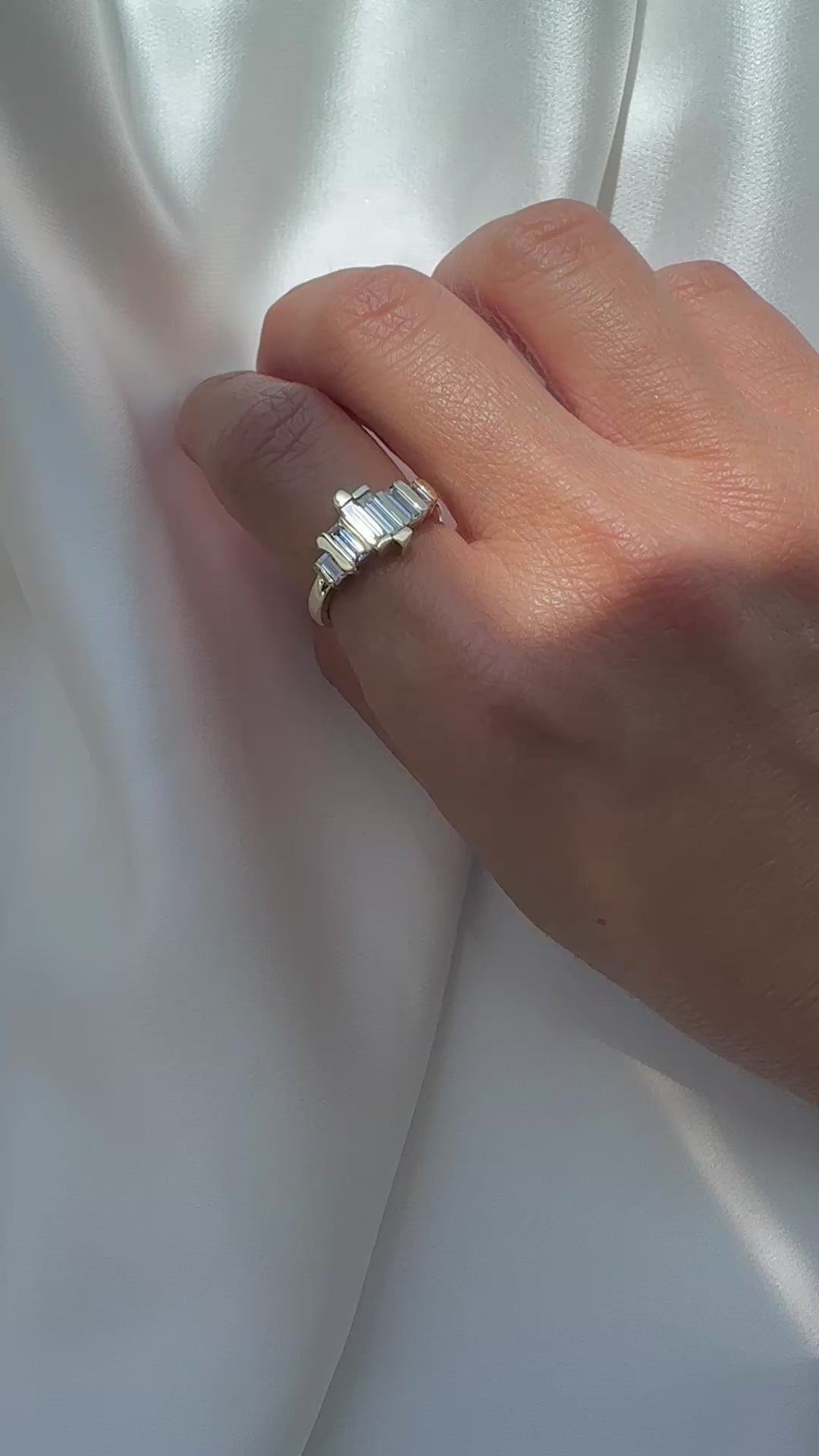 A baguette ring featuring diamonds in varied sizes and proportions.