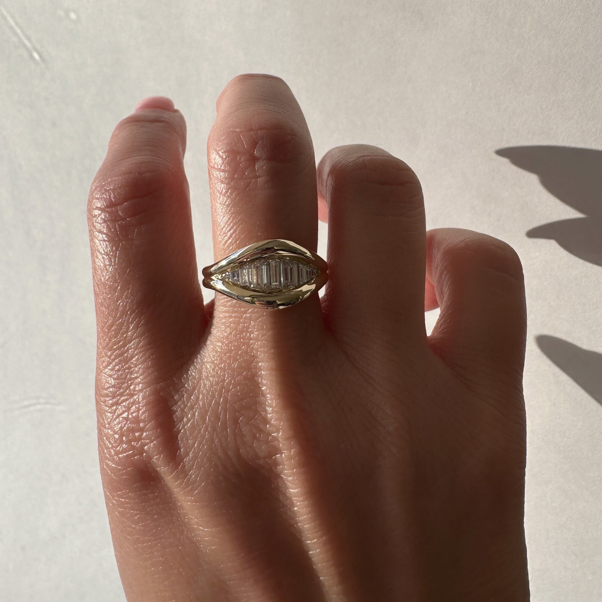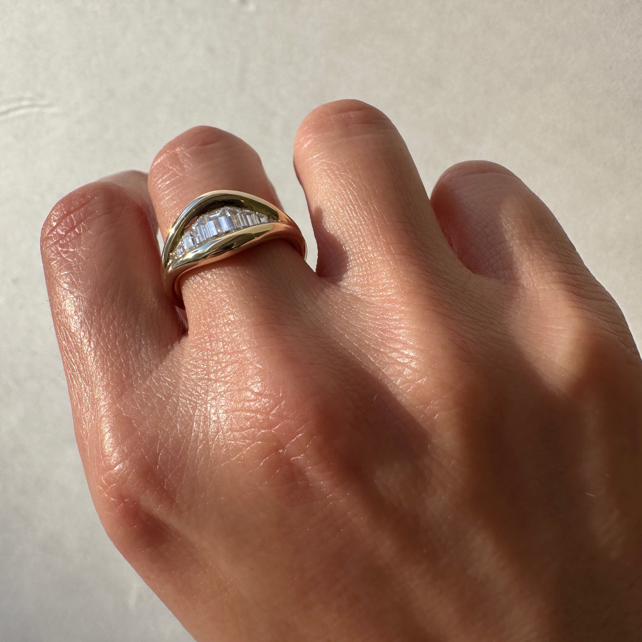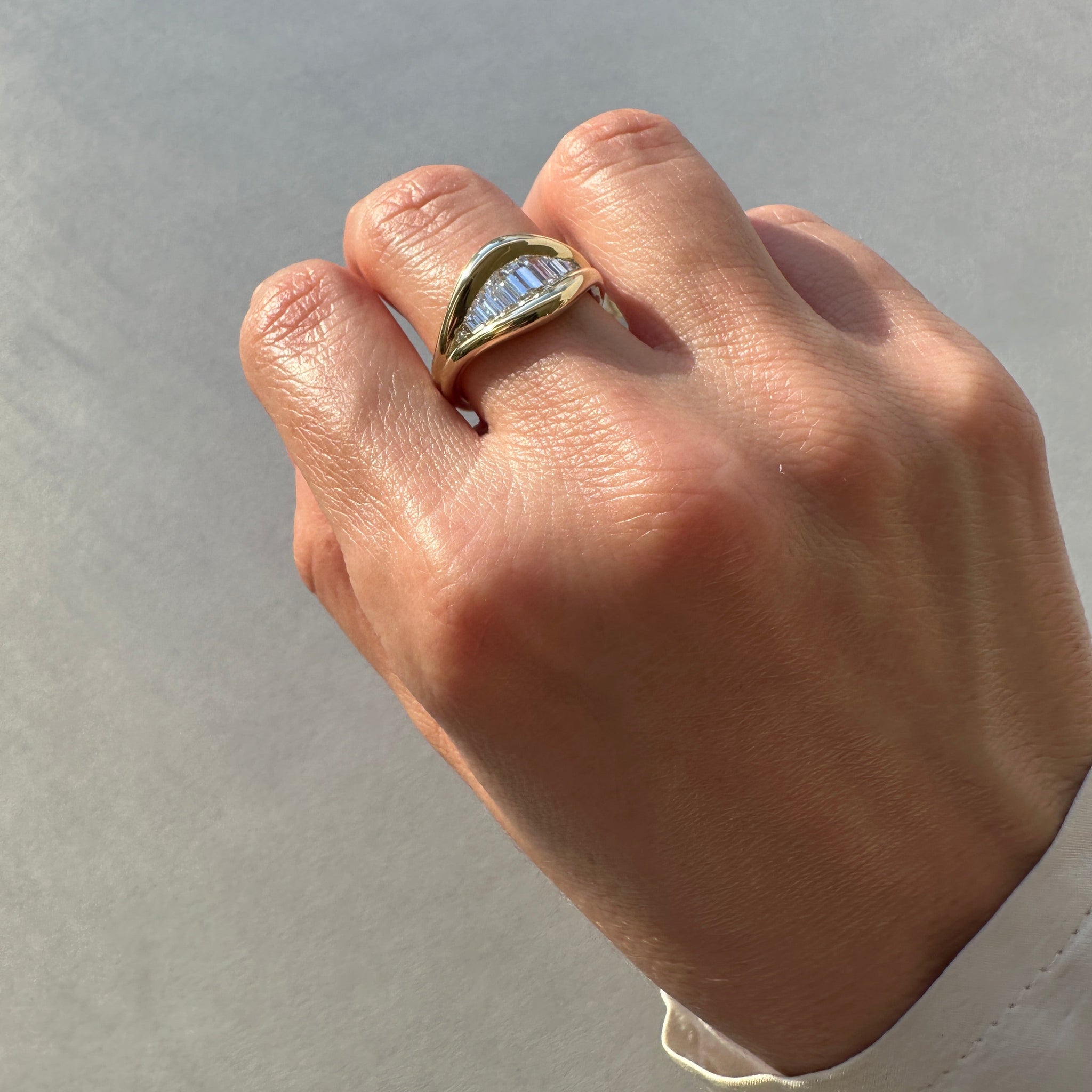 A bold ring featuring dazzling baguettes set in a smooth, chunky gold frame.
