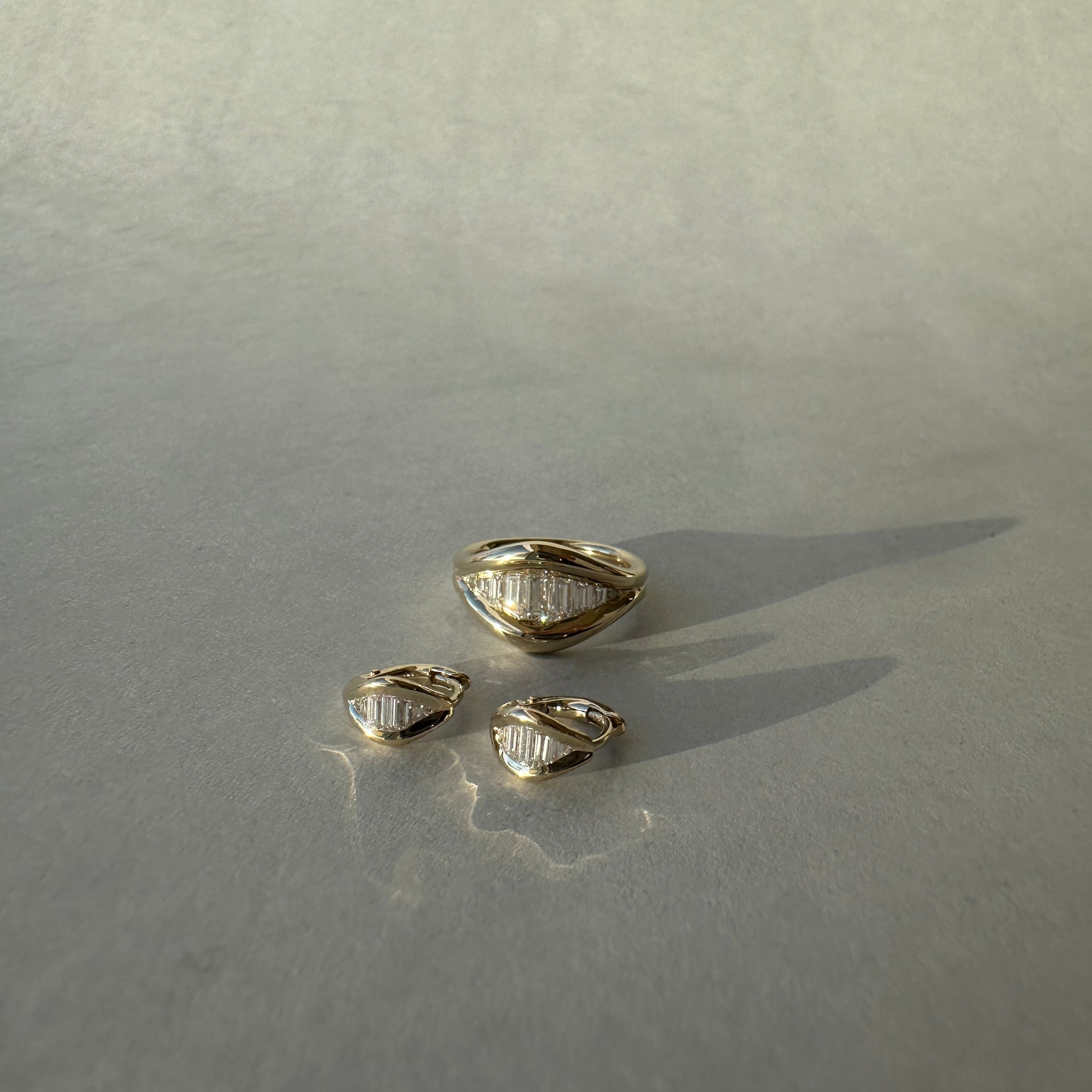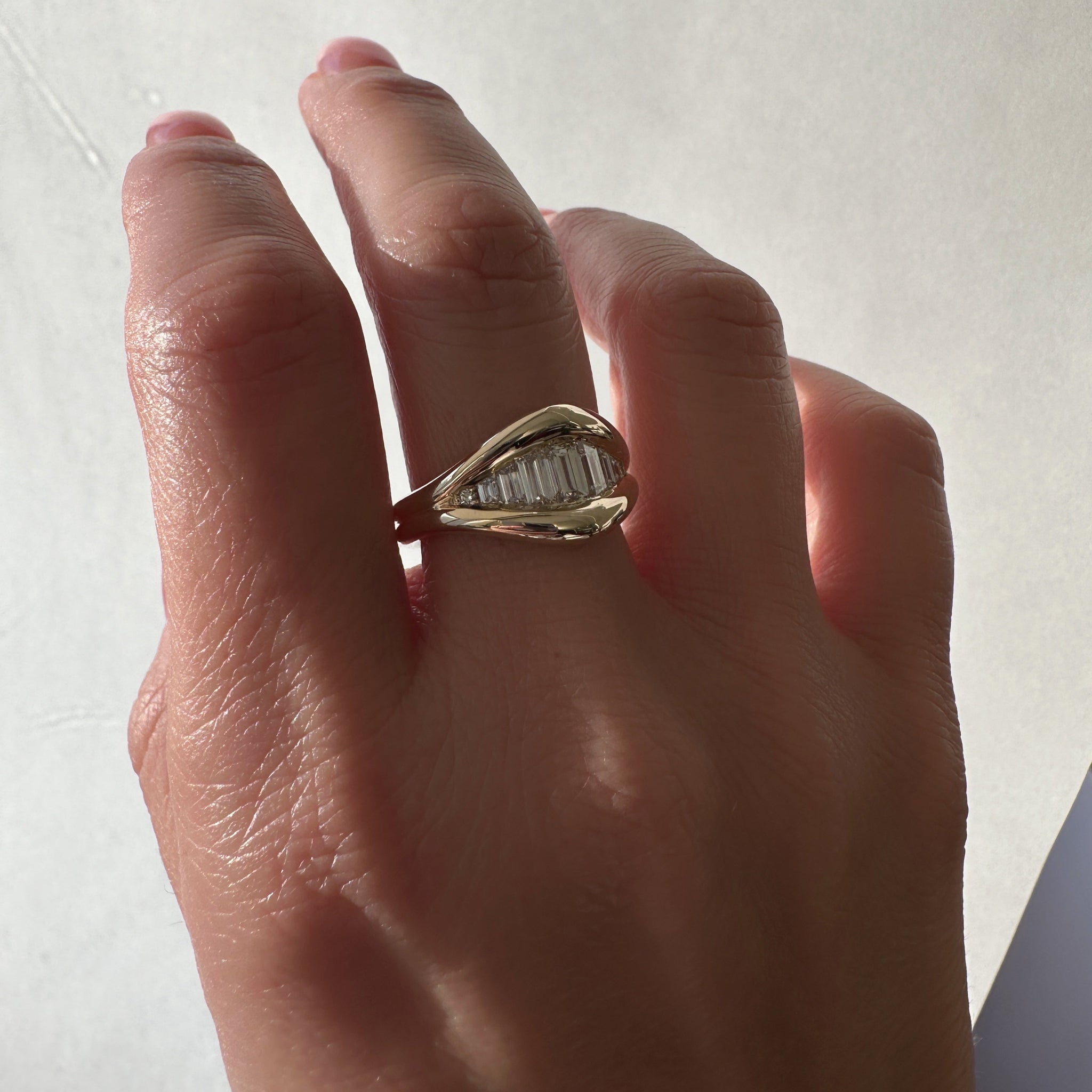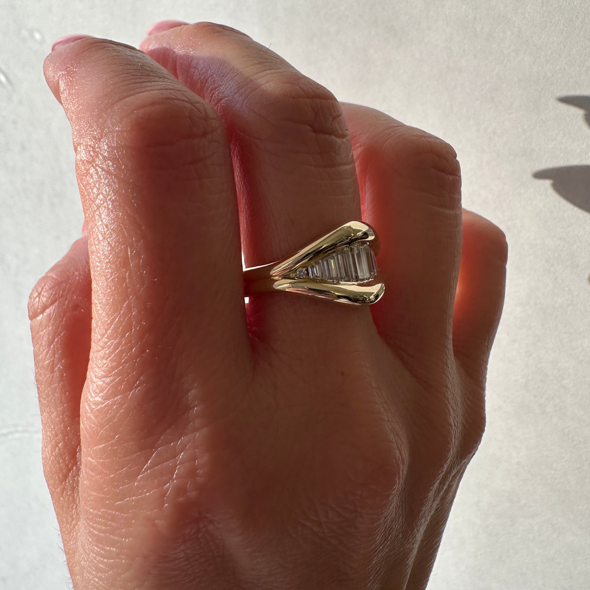A bold ring featuring dazzling baguettes set in a smooth, chunky gold frame.