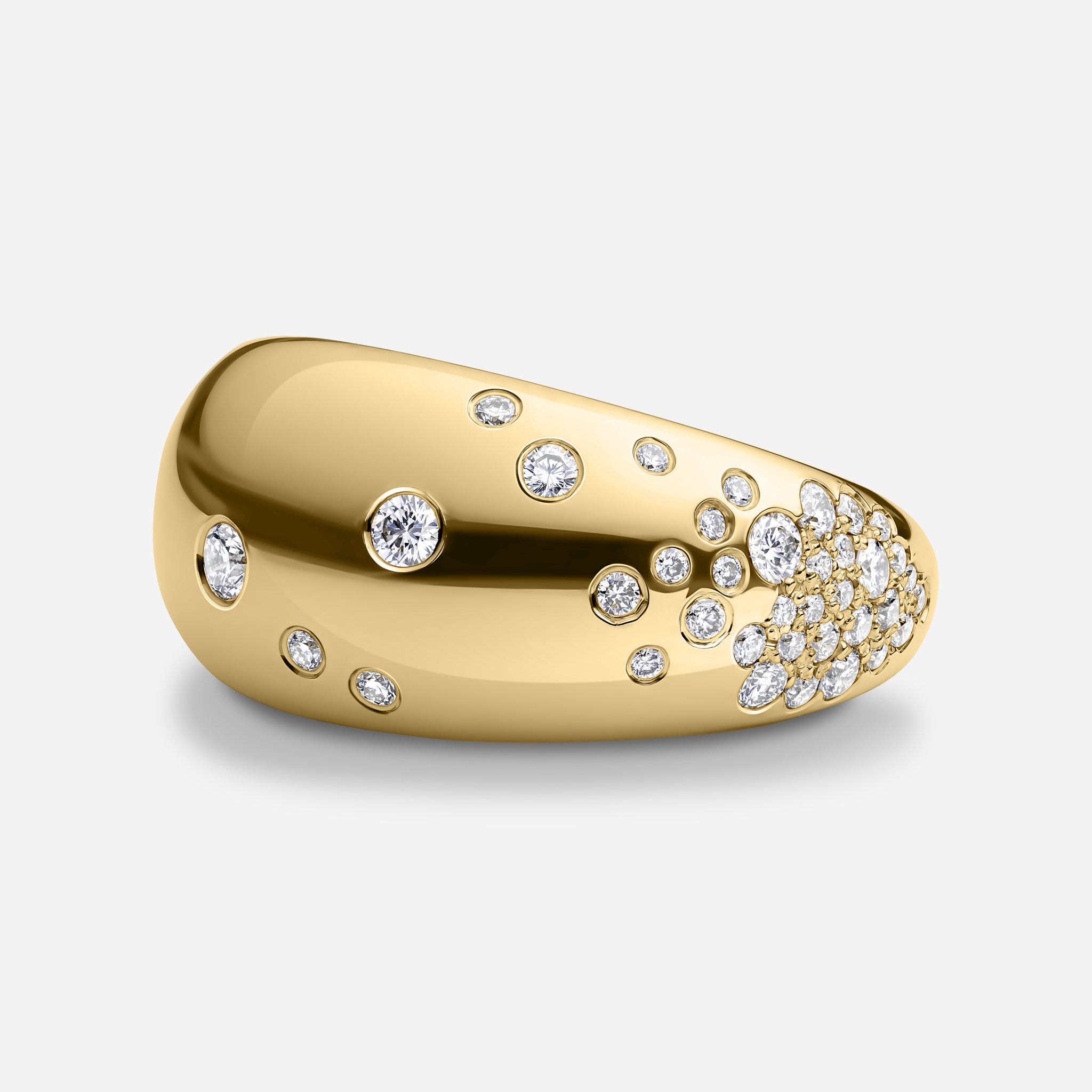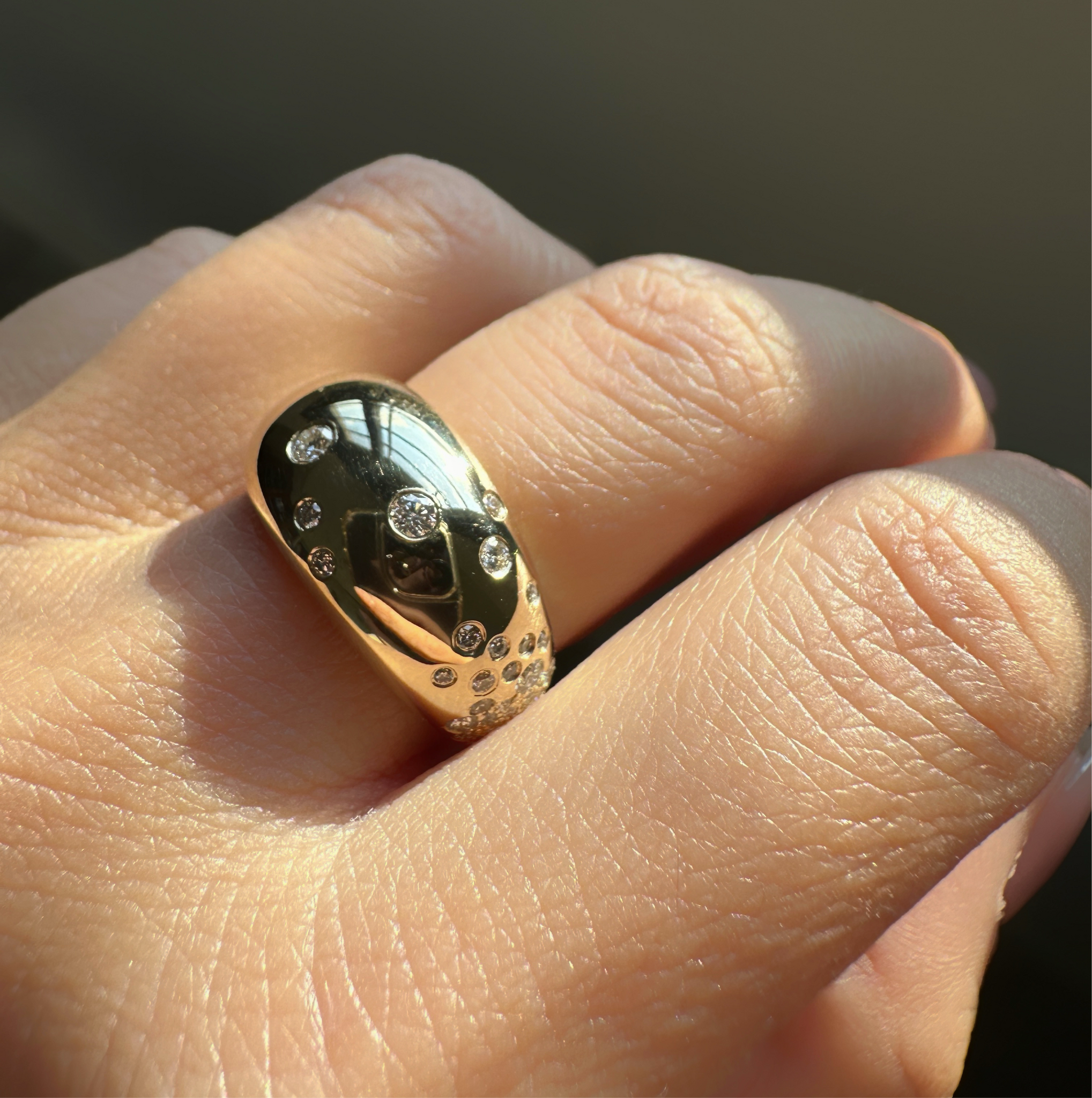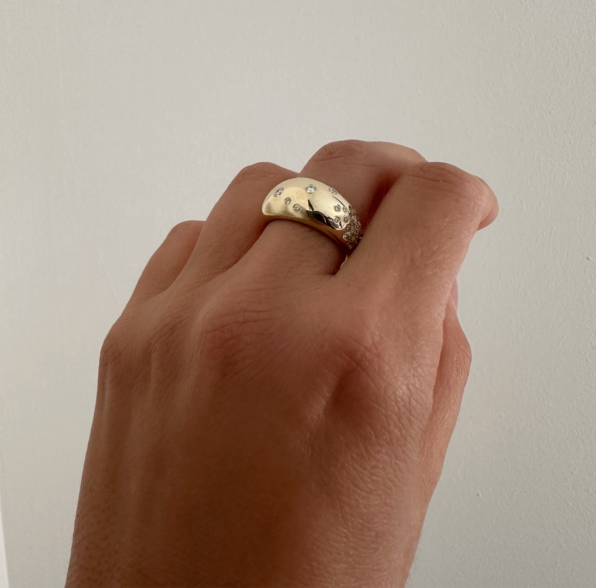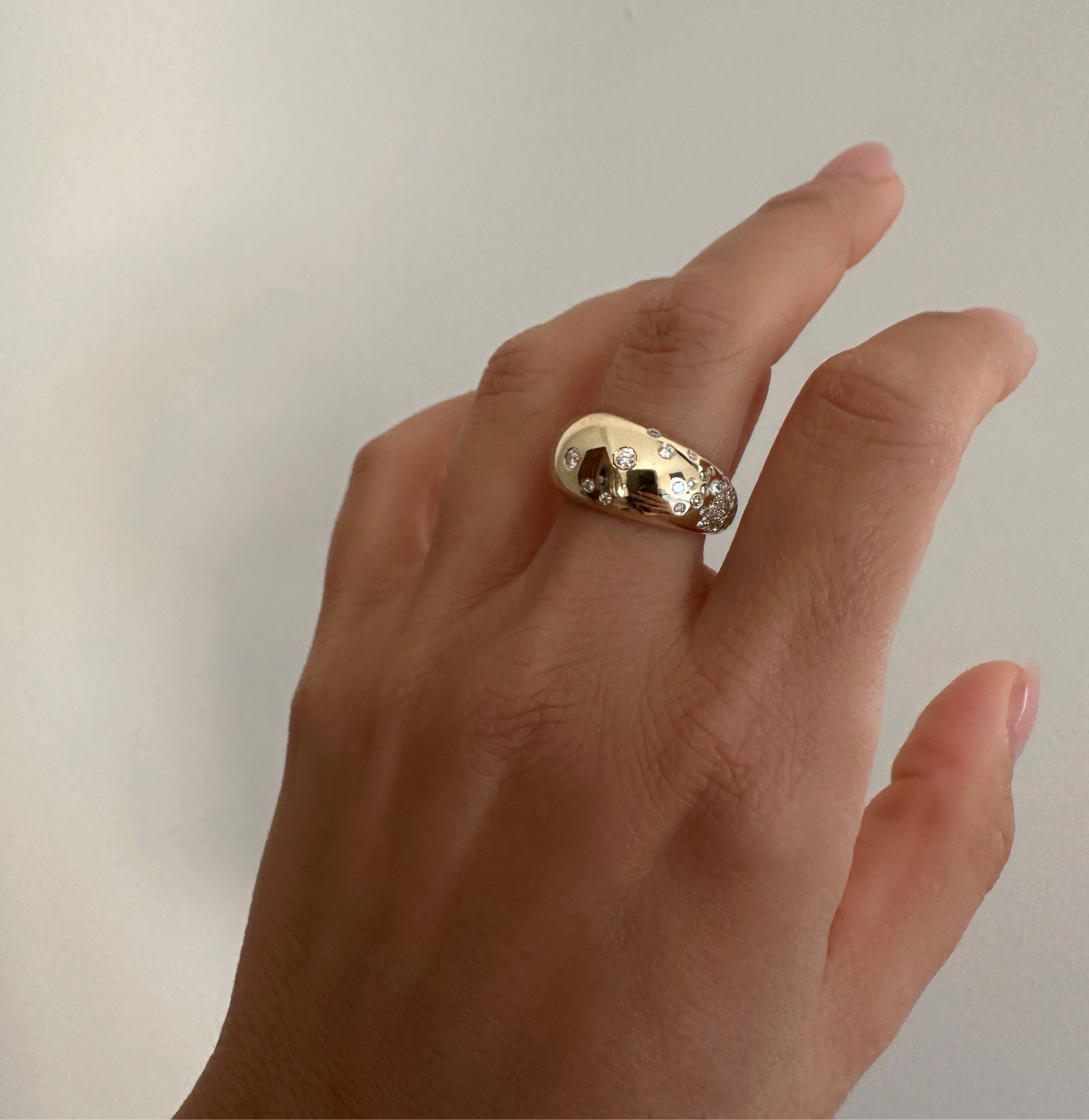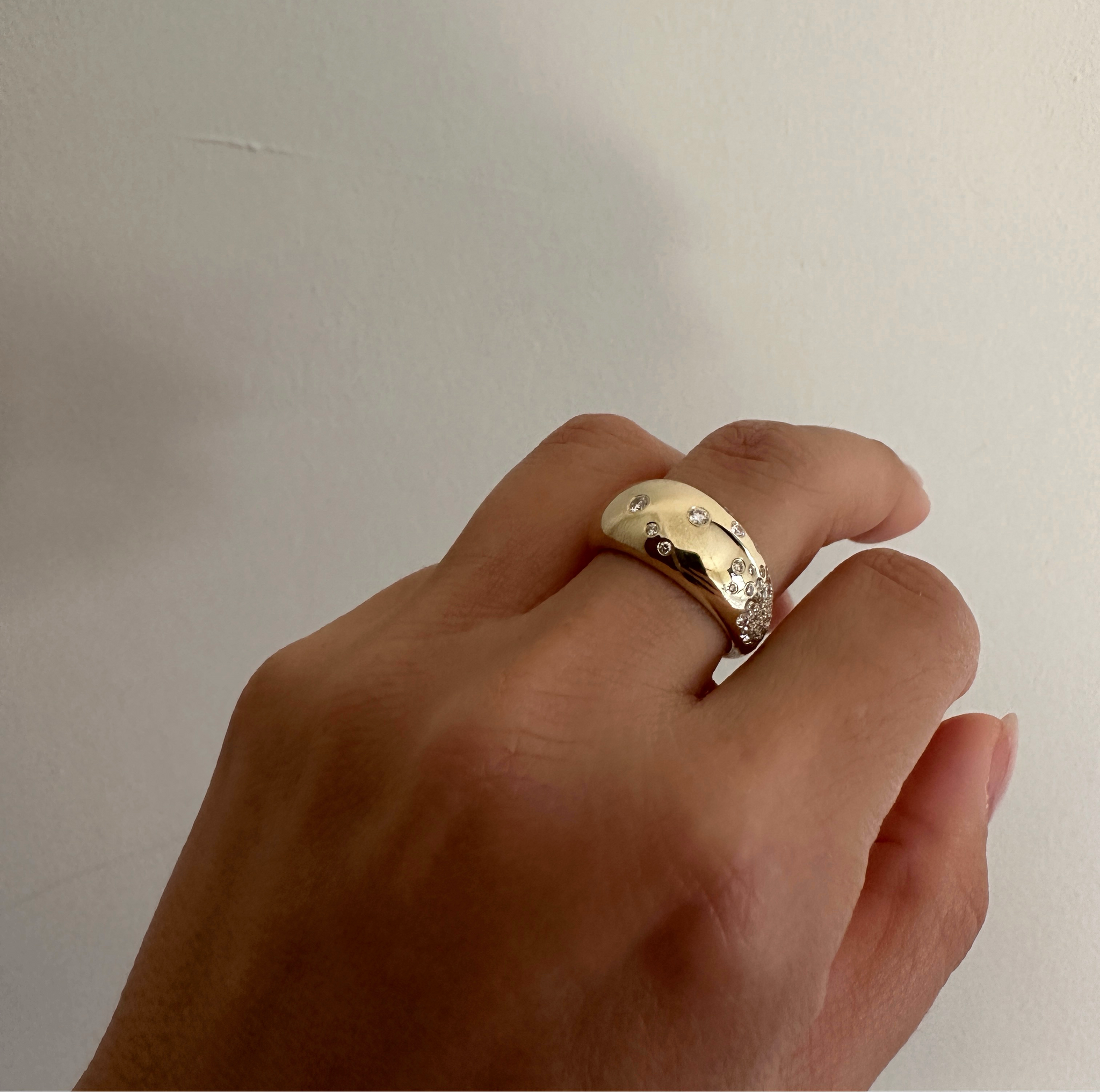A gold dome ring, set with Round Diamonds for extra fun. A bold and beautiful addition to your ring collection.