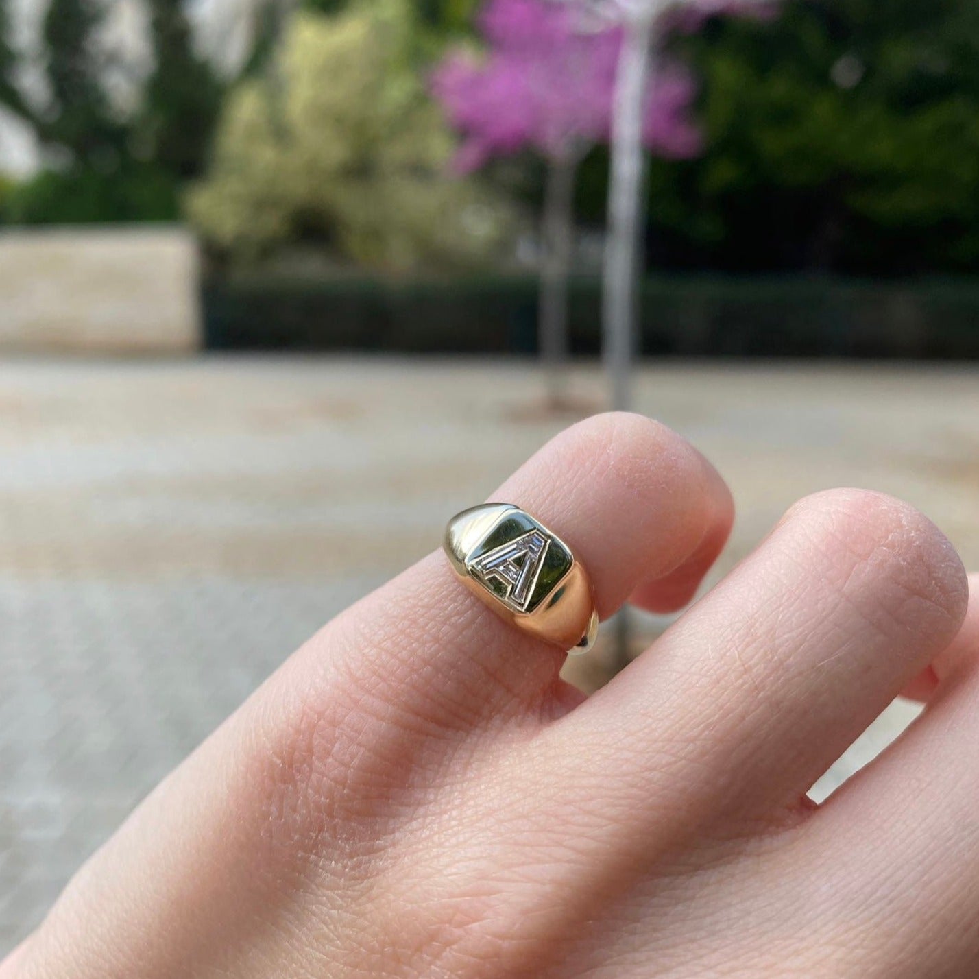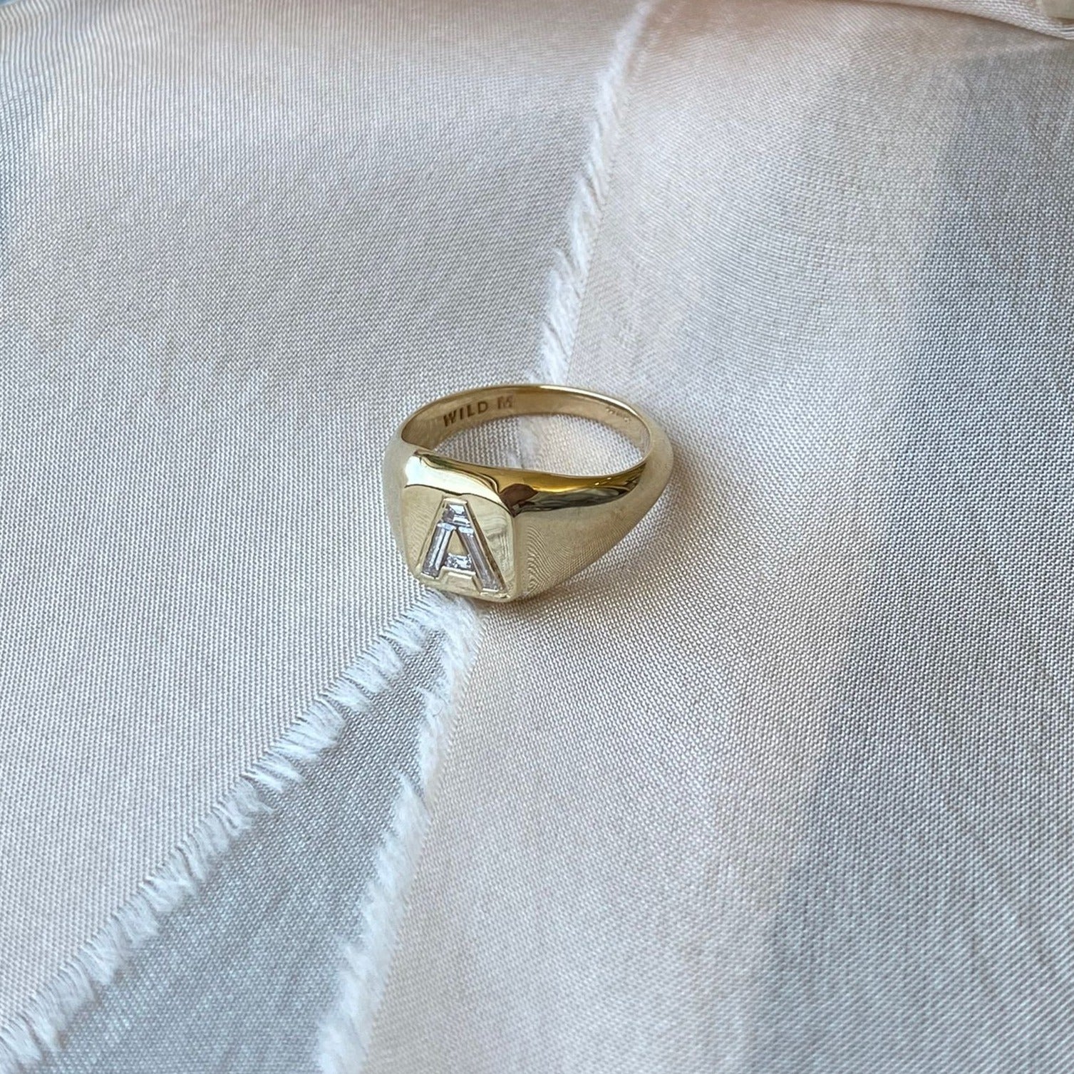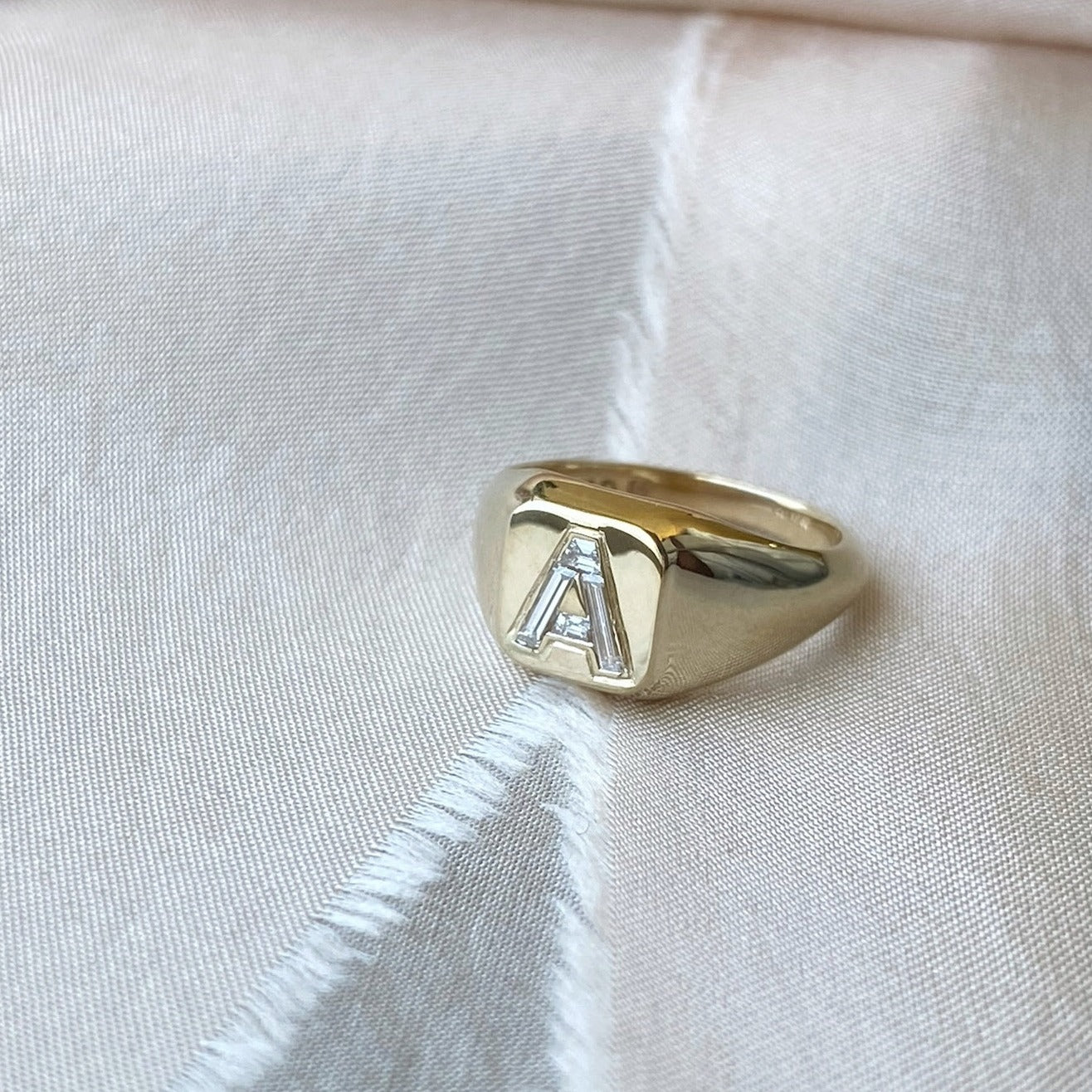 Our Pinky Signet Ring. Set with bright Baguette Diamonds especially cut to create any letter you choose.