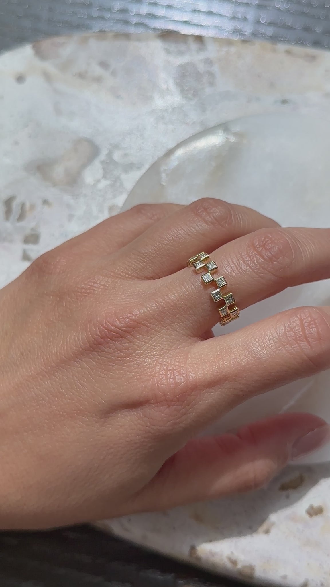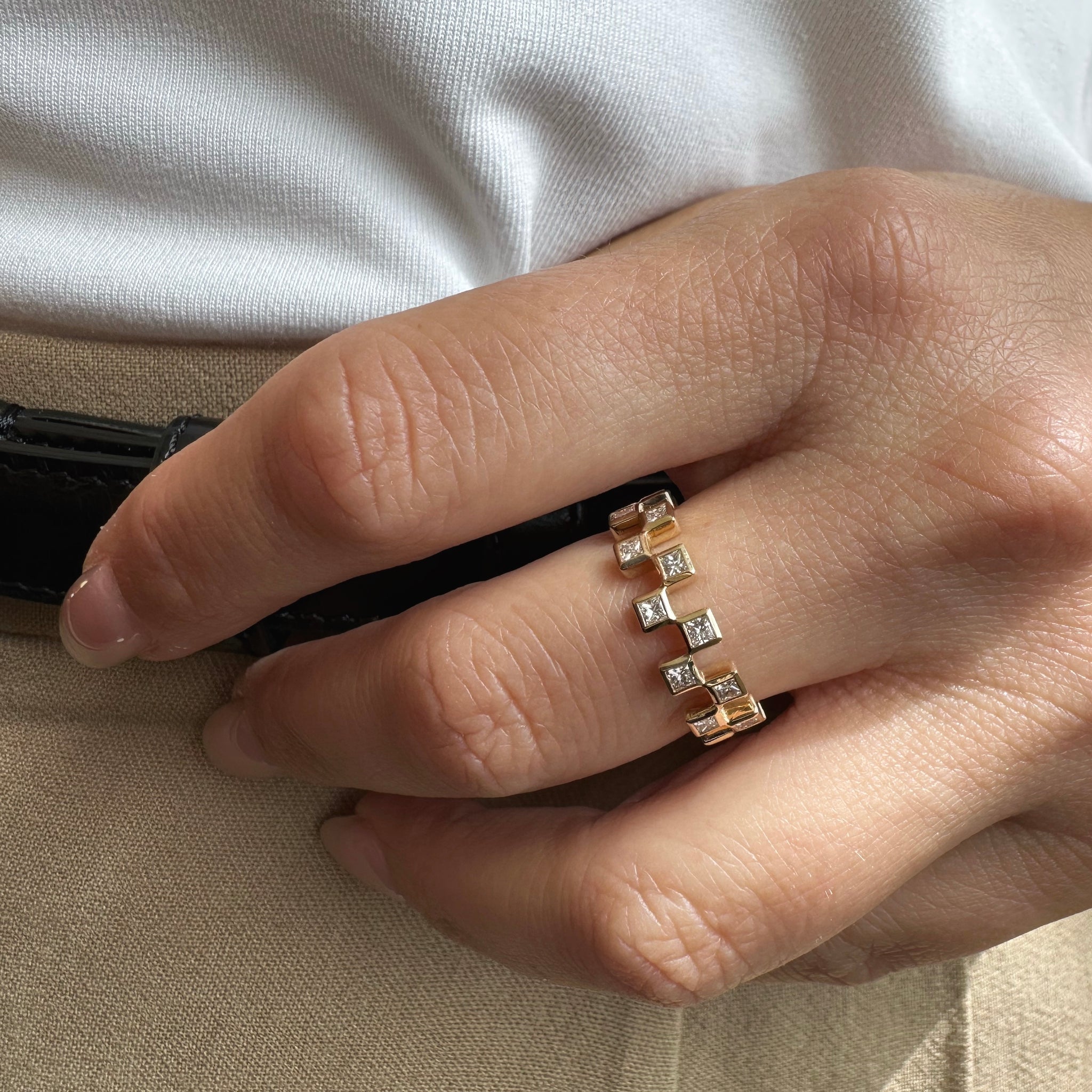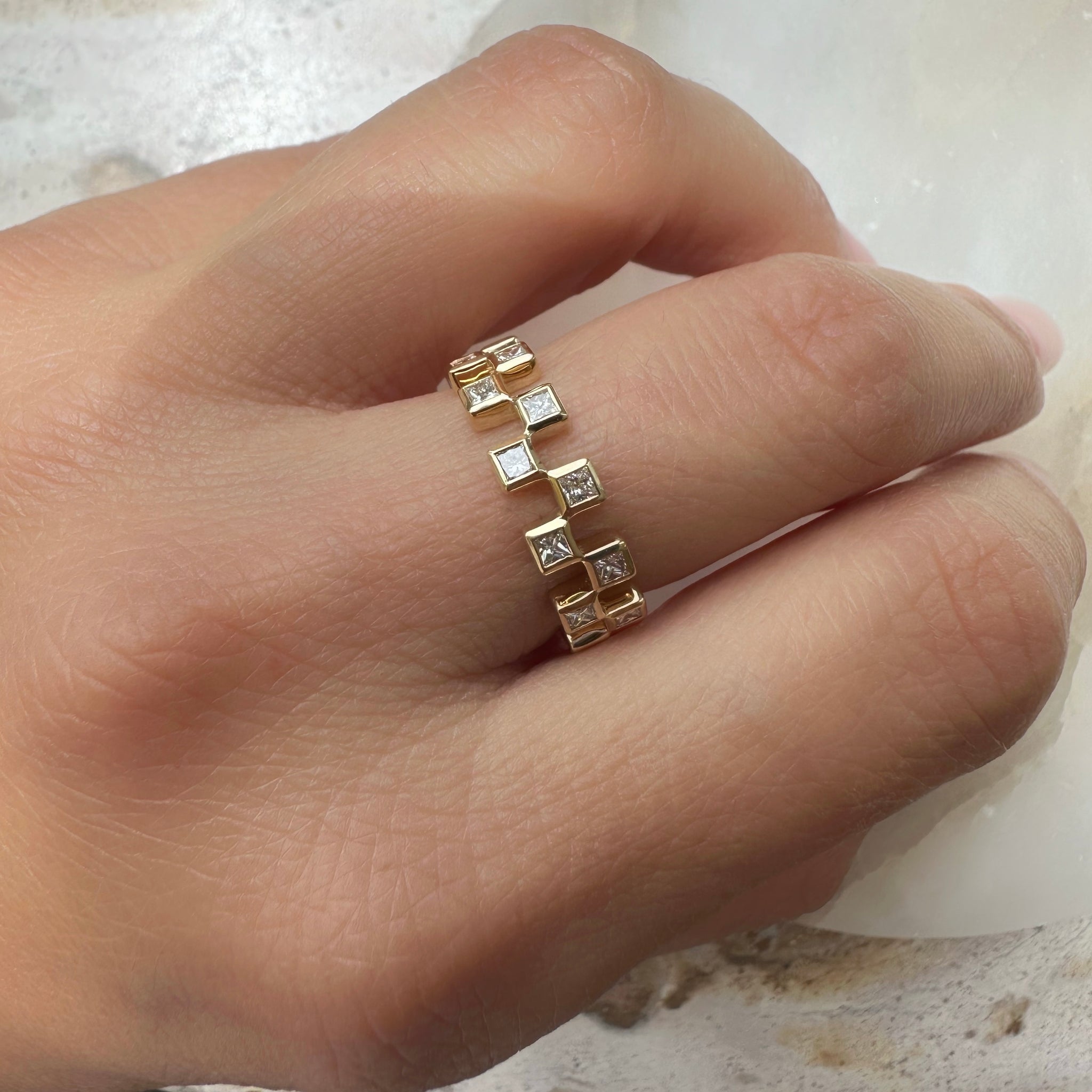 A playful ring of Princess Cut Diamonds in Bezel Setting.
