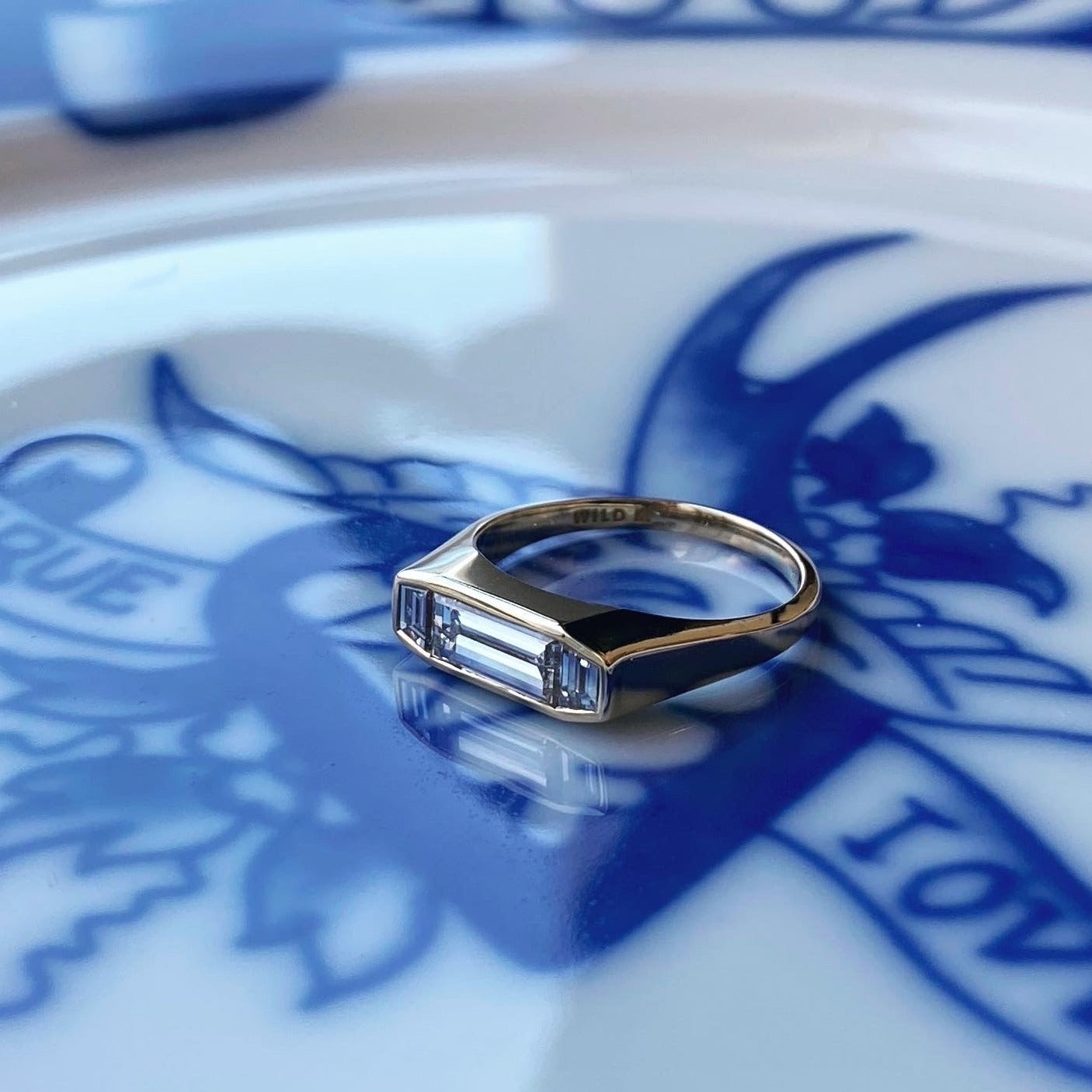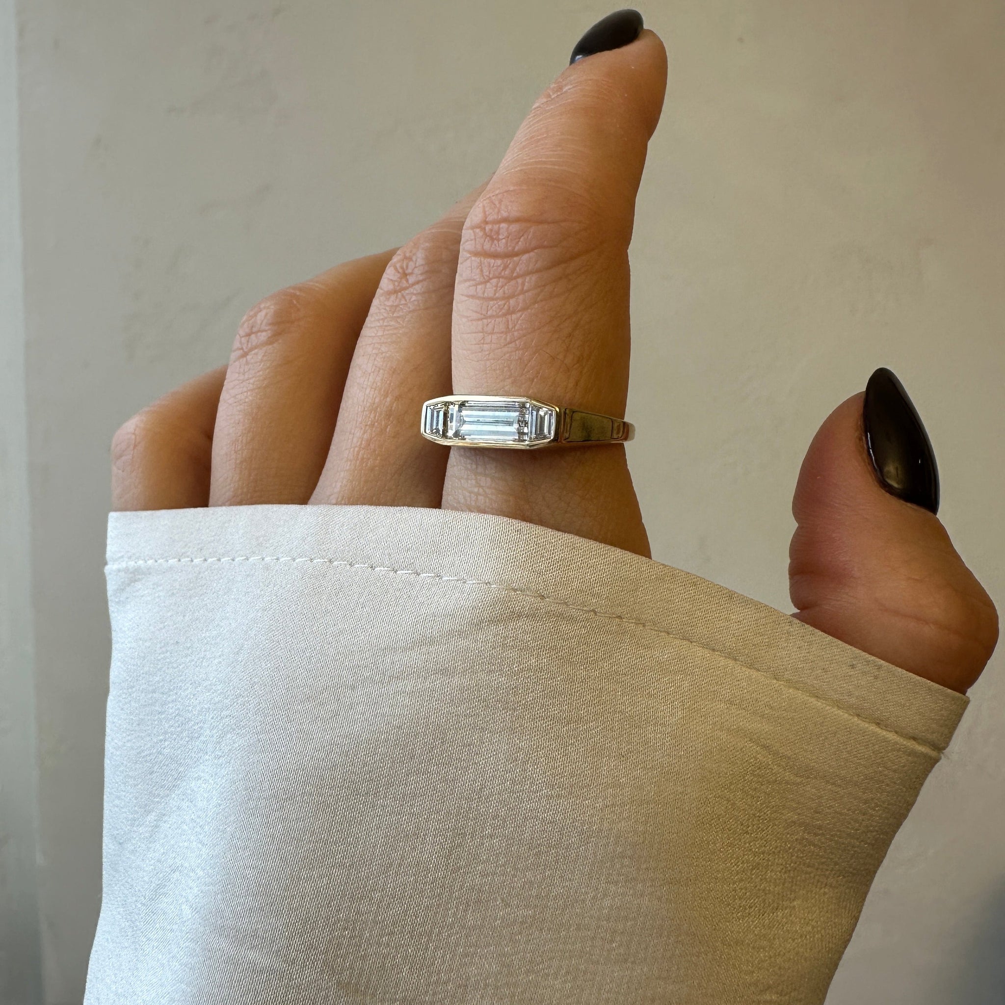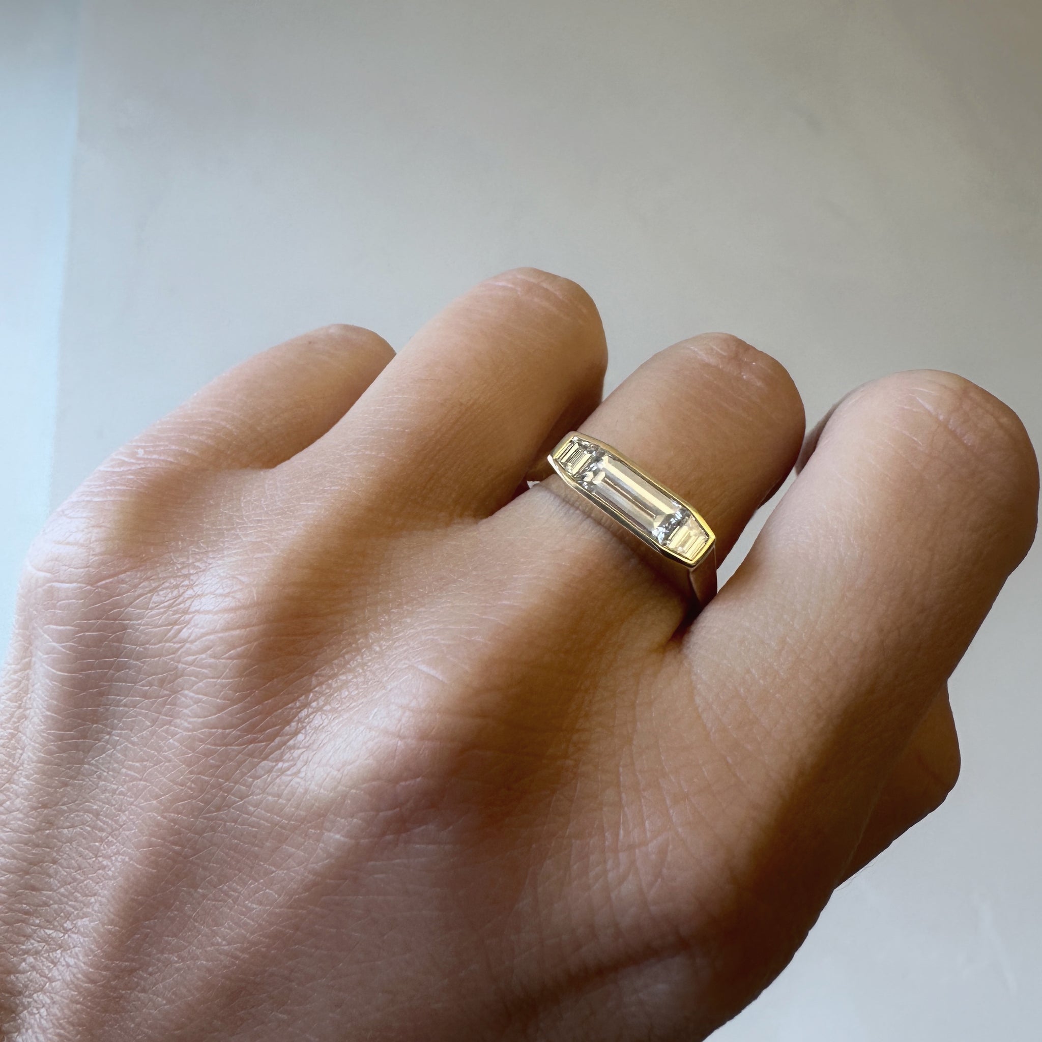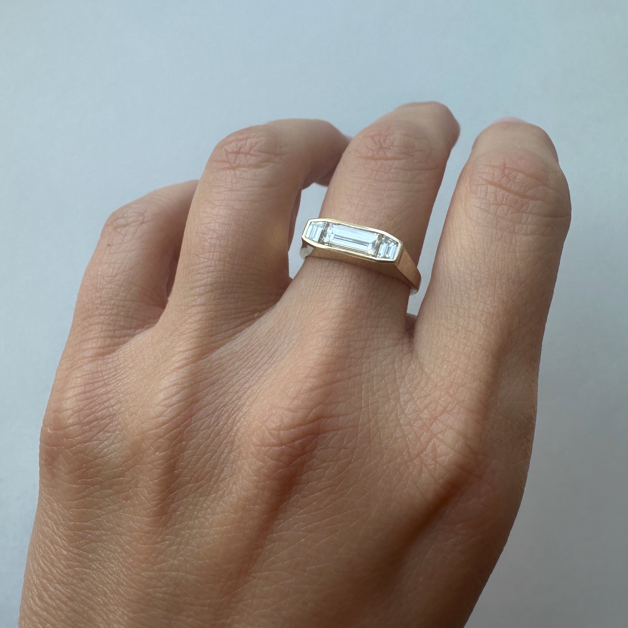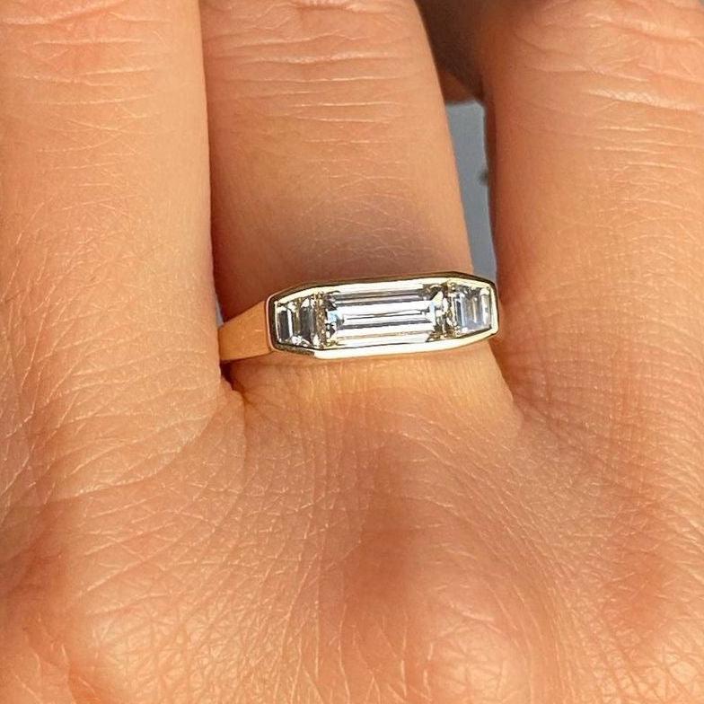 A central baguette-cut diamond set in a gold frame, with a pair of trapezoids on both sides that gives the appearance of a long unique diamond with a spectacular look.