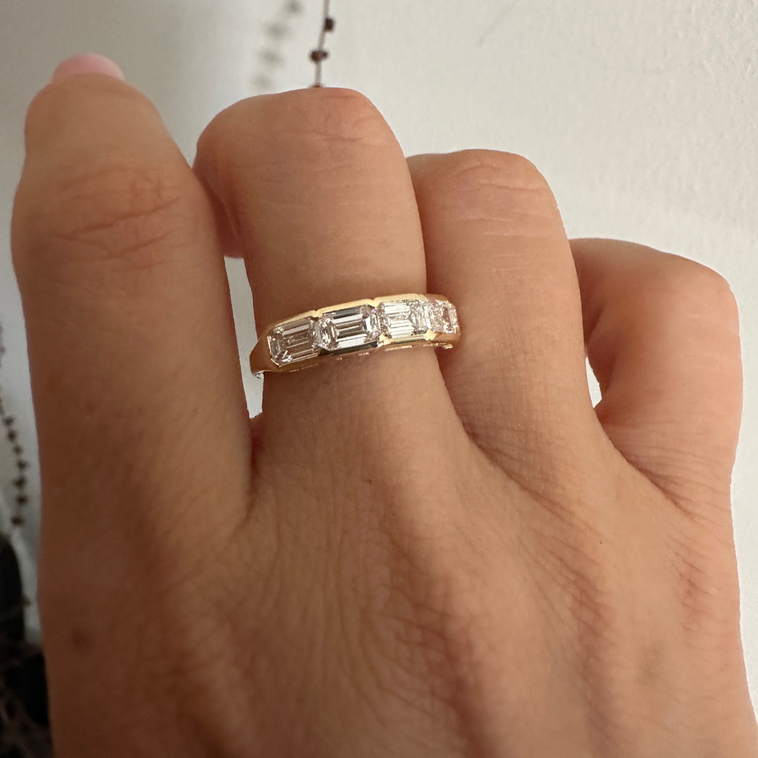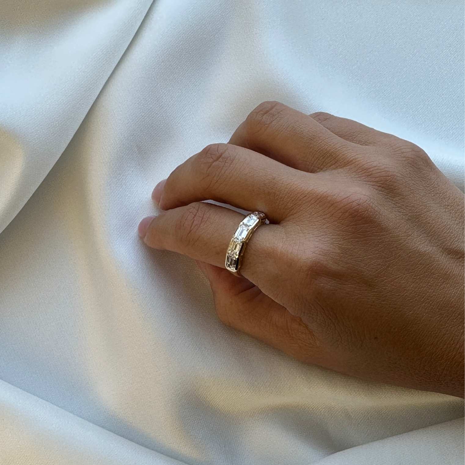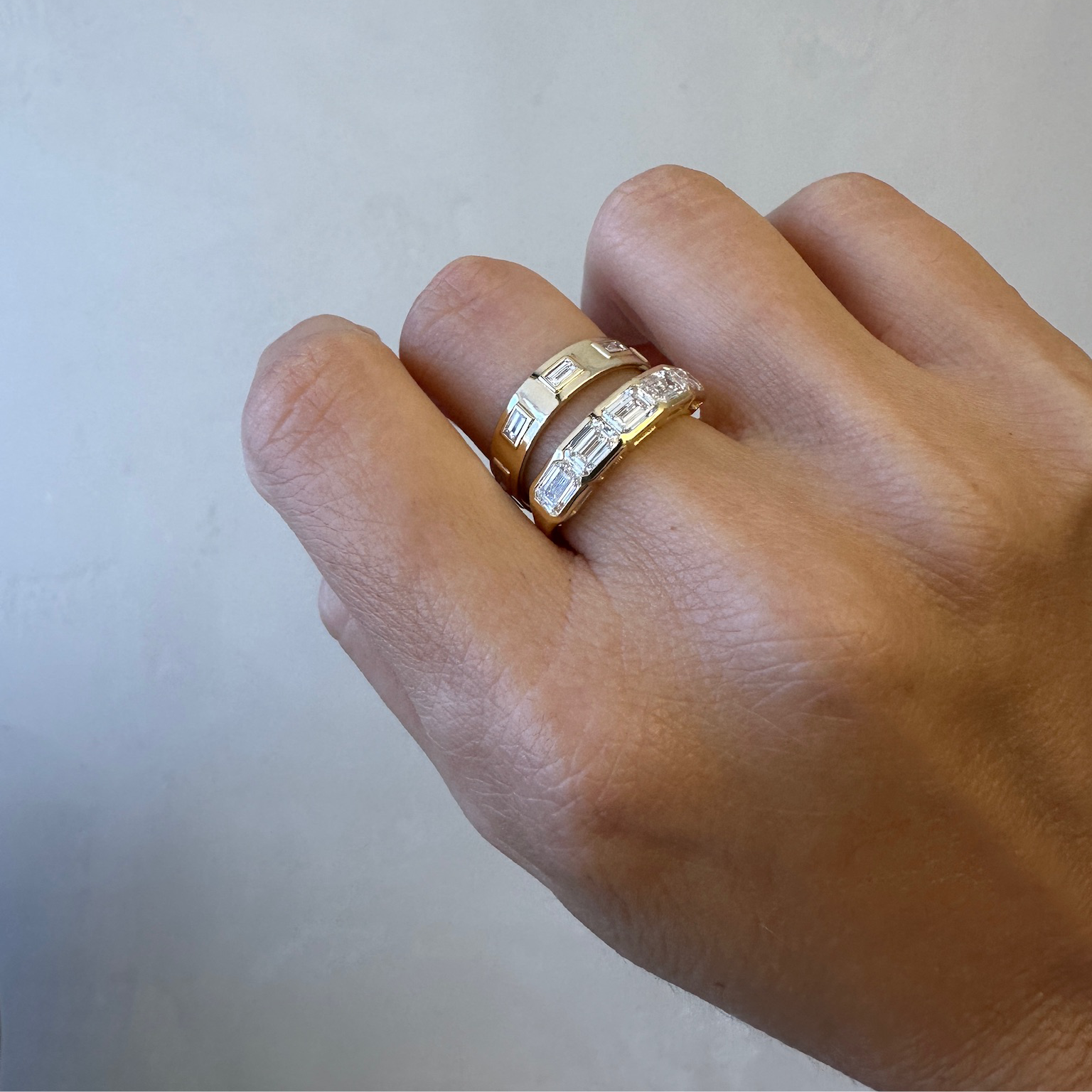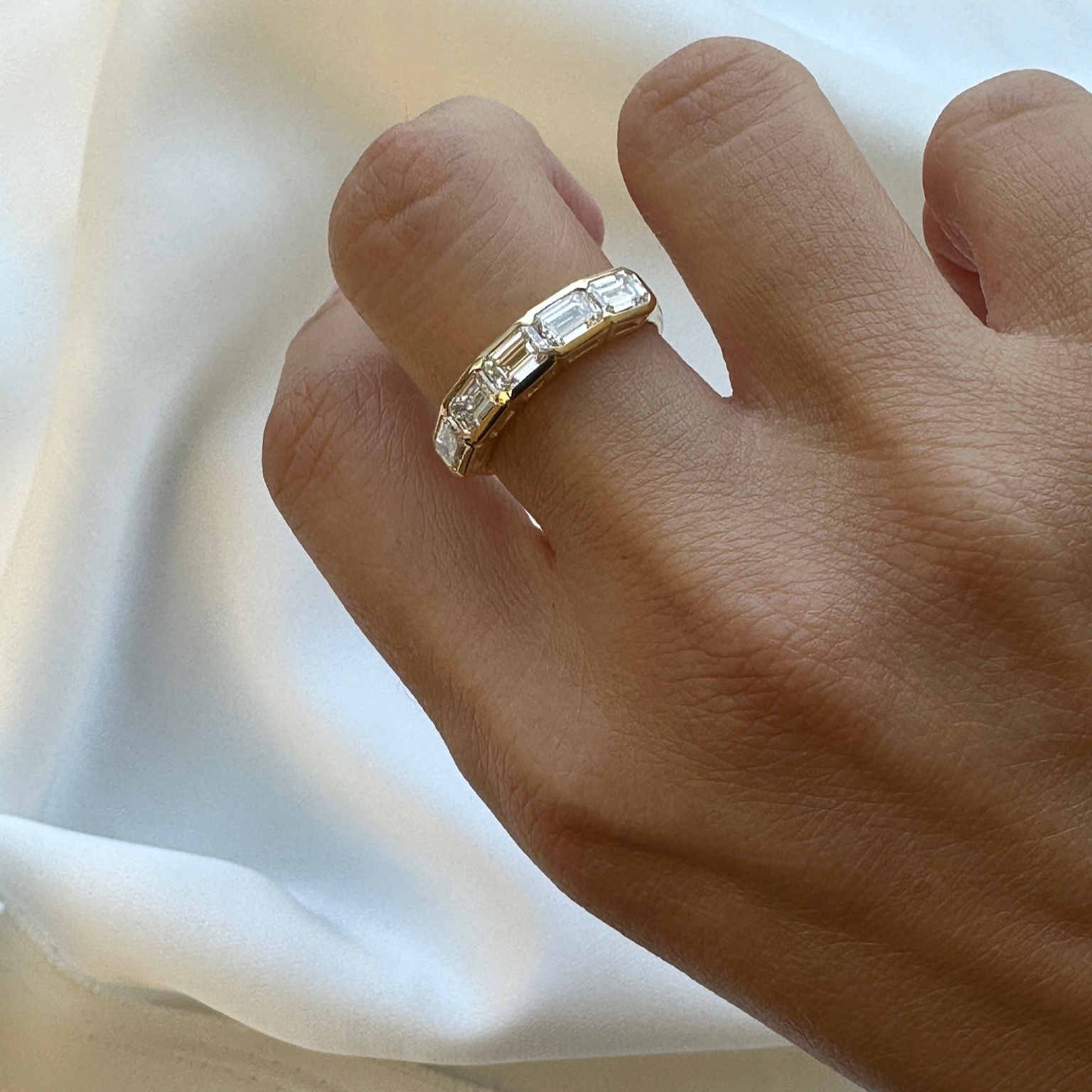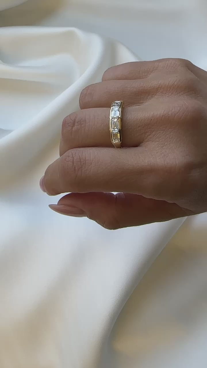 Five exquisite emerald-cut diamonds in a sleek gold bezel setting, adding a touch of bold sophistication.