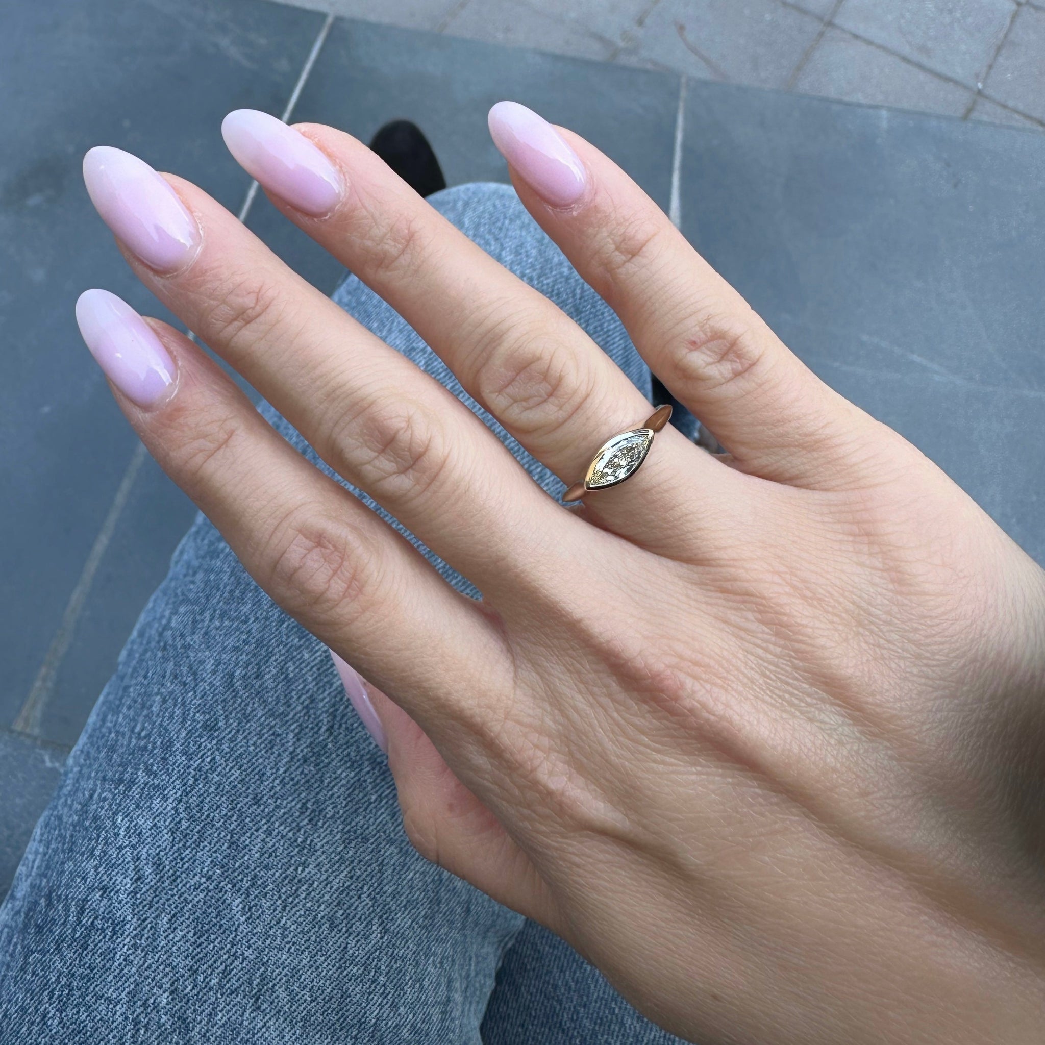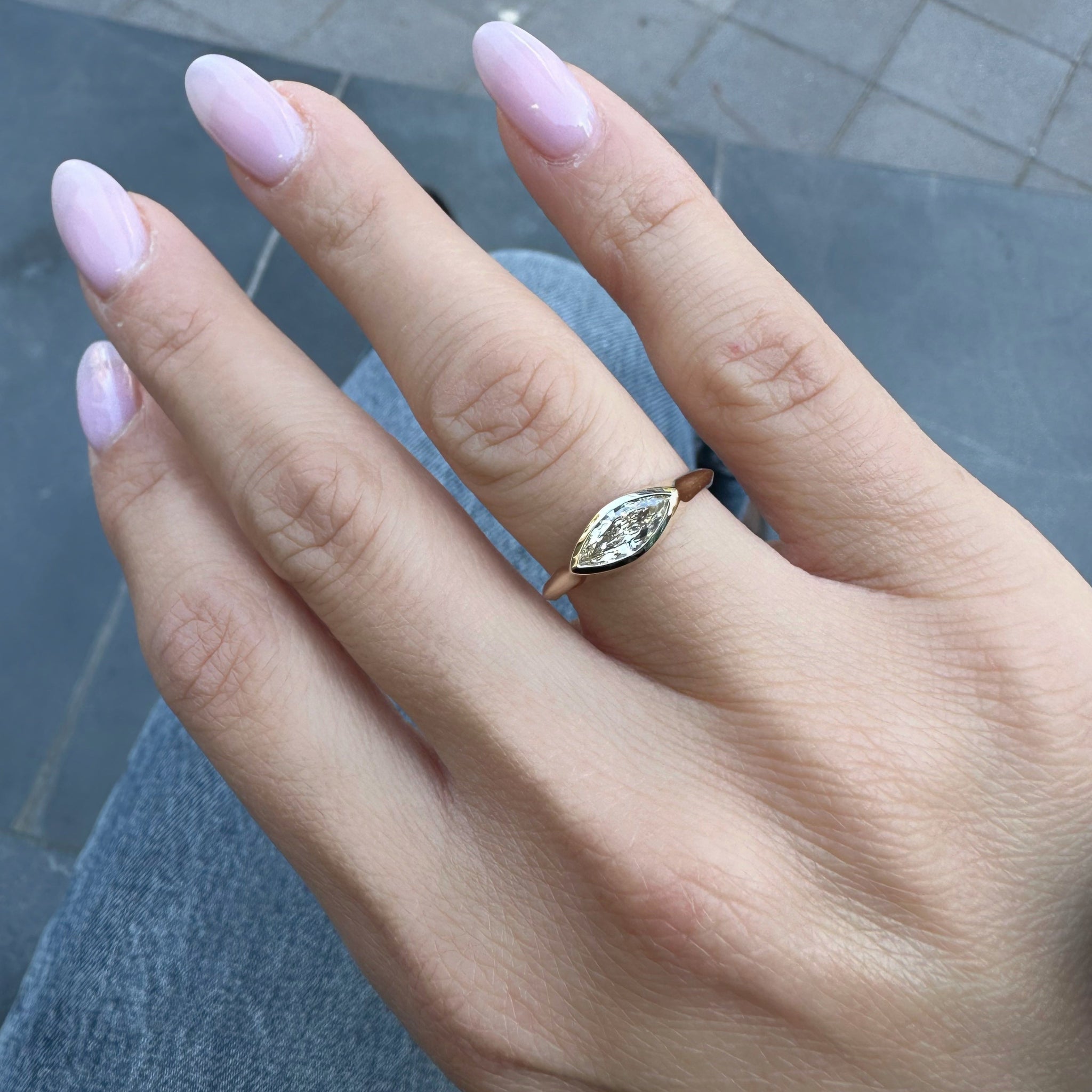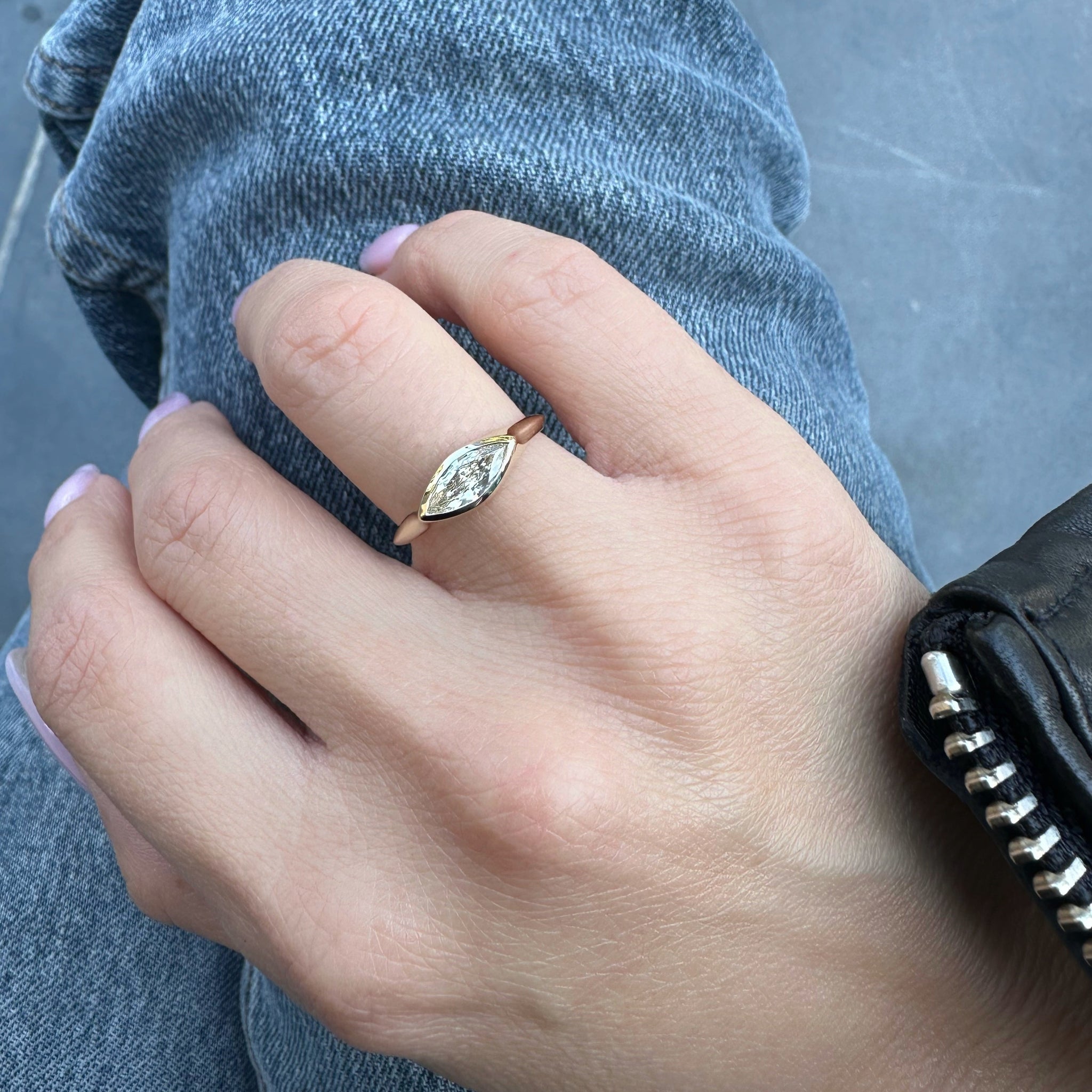 A Marquise Cut diamond set horizontally in a smooth gold bezel setting.