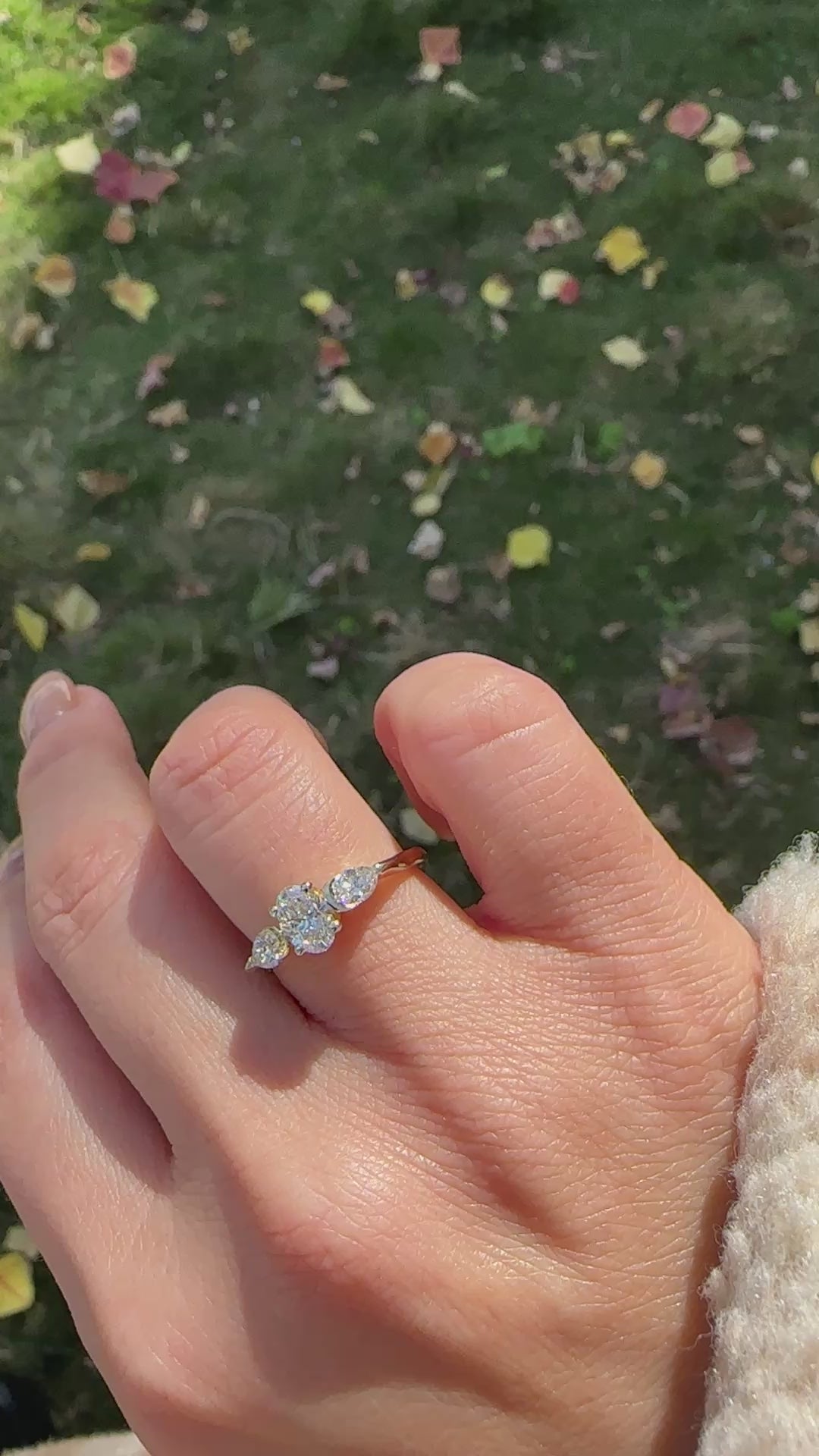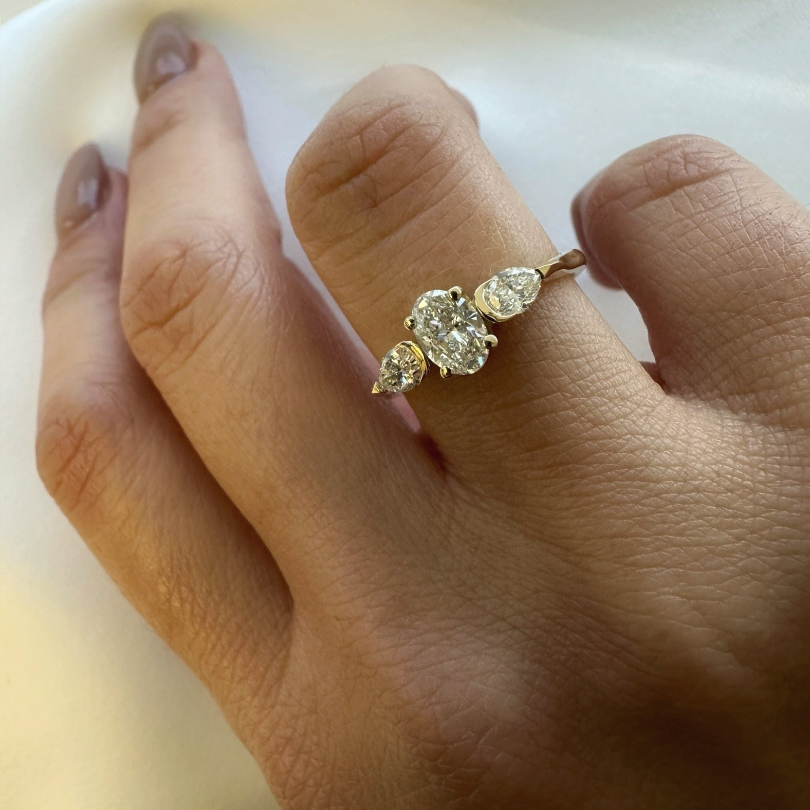 It's all in the details! An oval diamond ring with pear-shaped side stones, in a magical and unique setting.