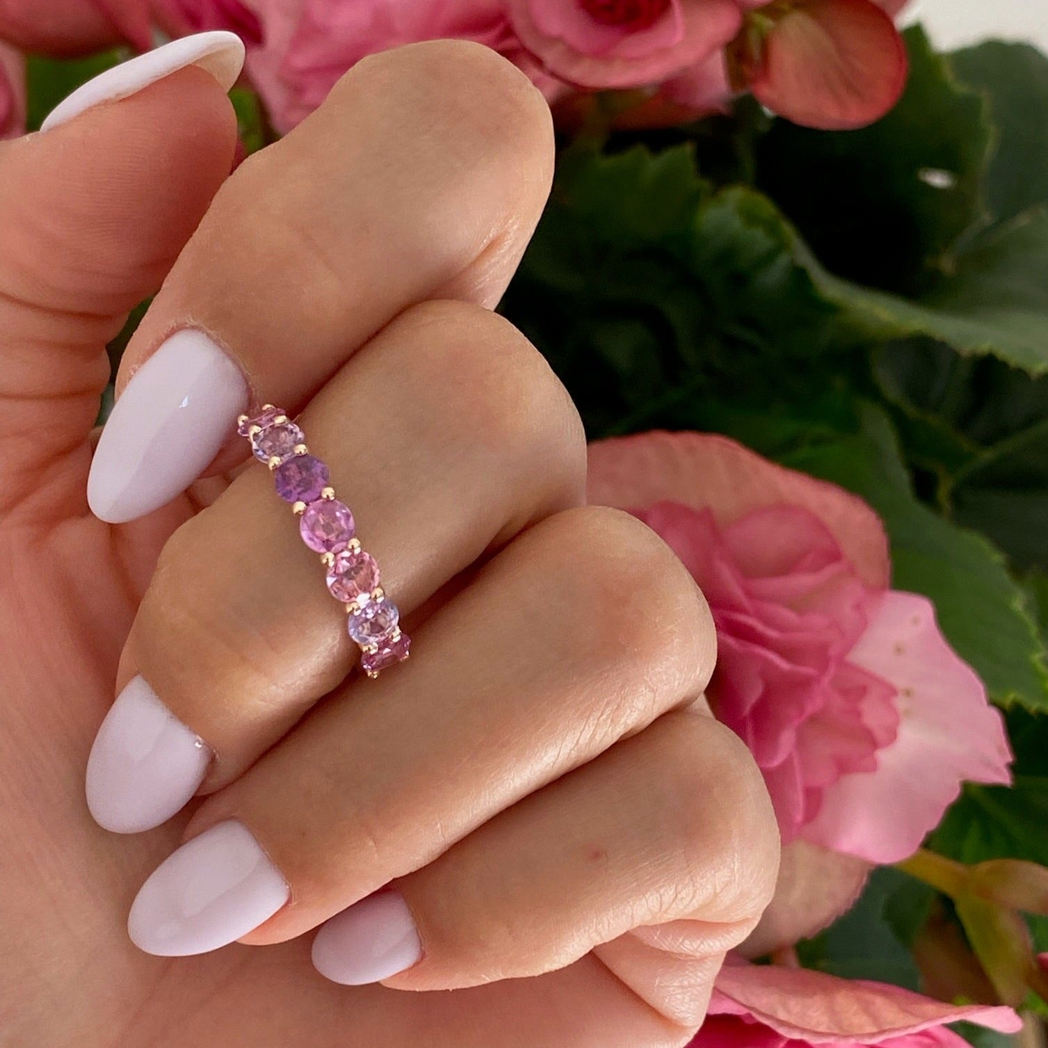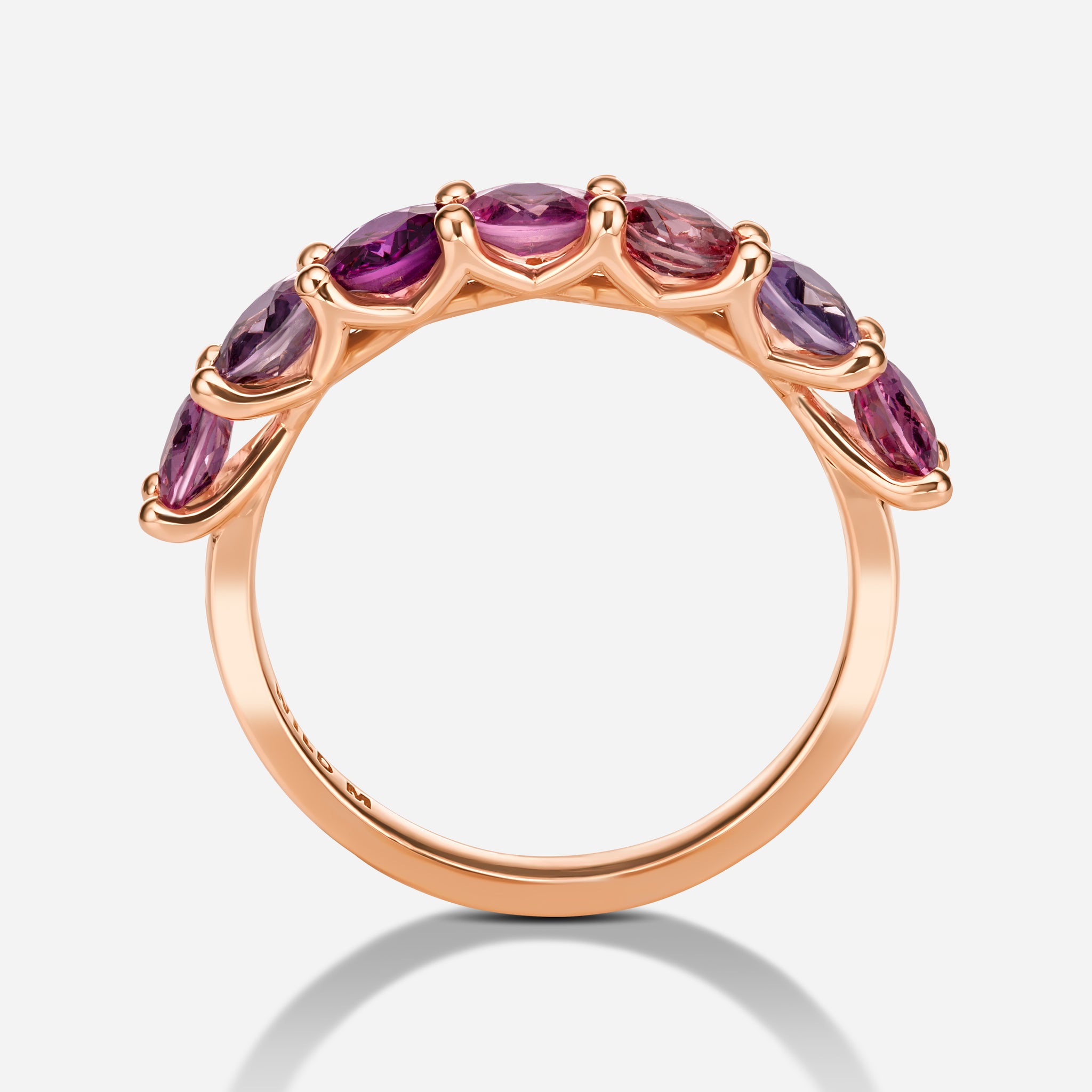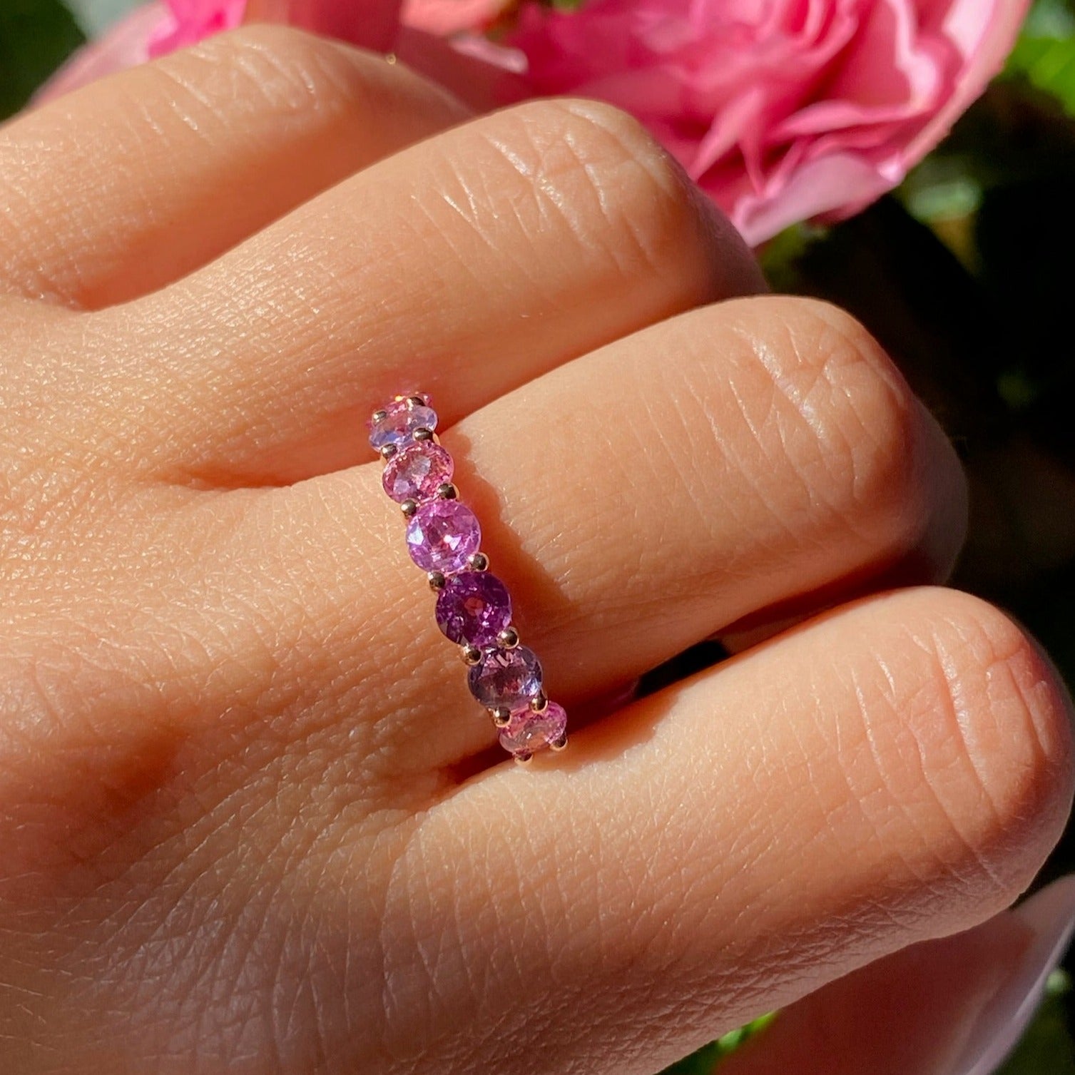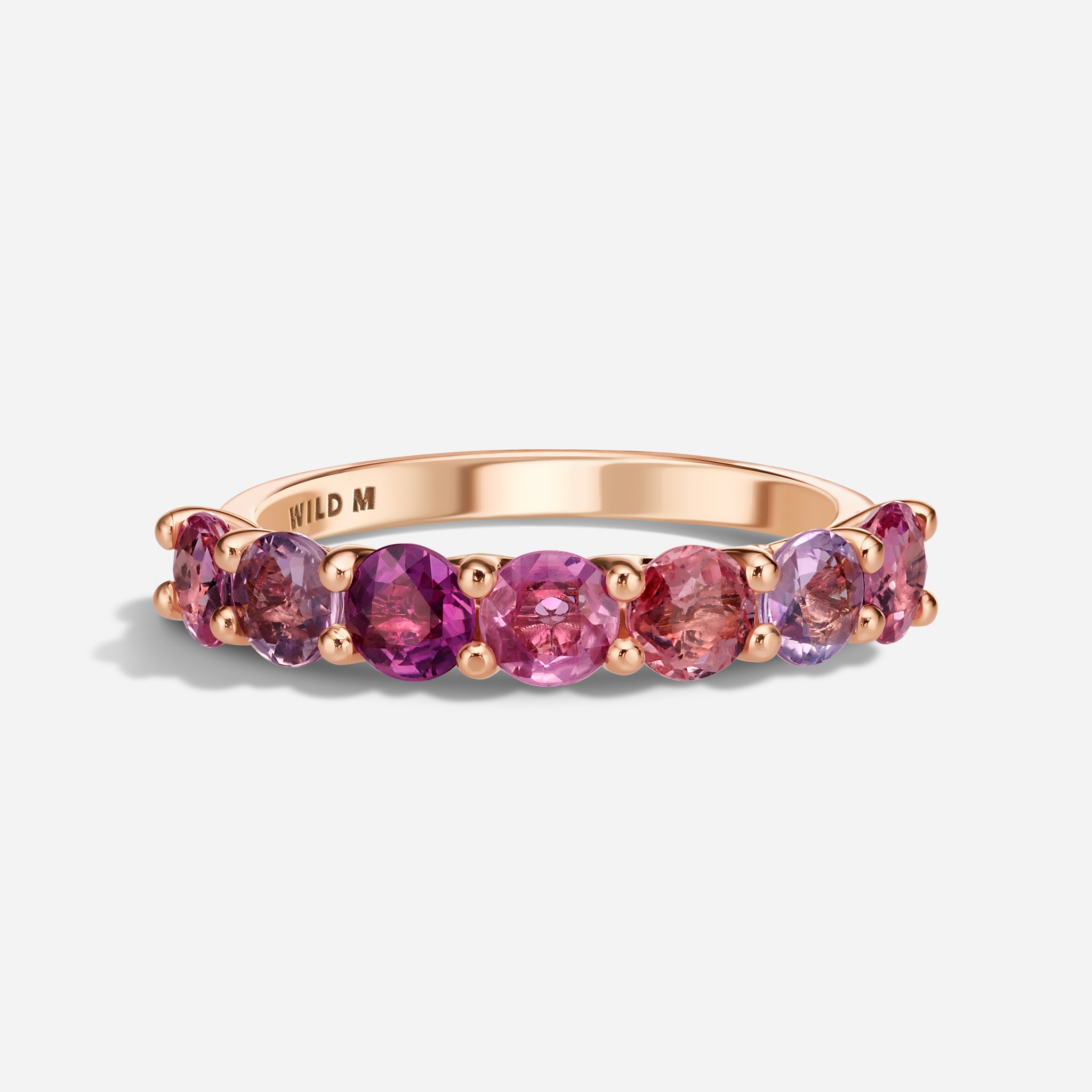 A magical ring set with 7 natural sapphires in shades of red and pink roses in U-set in rose gold.