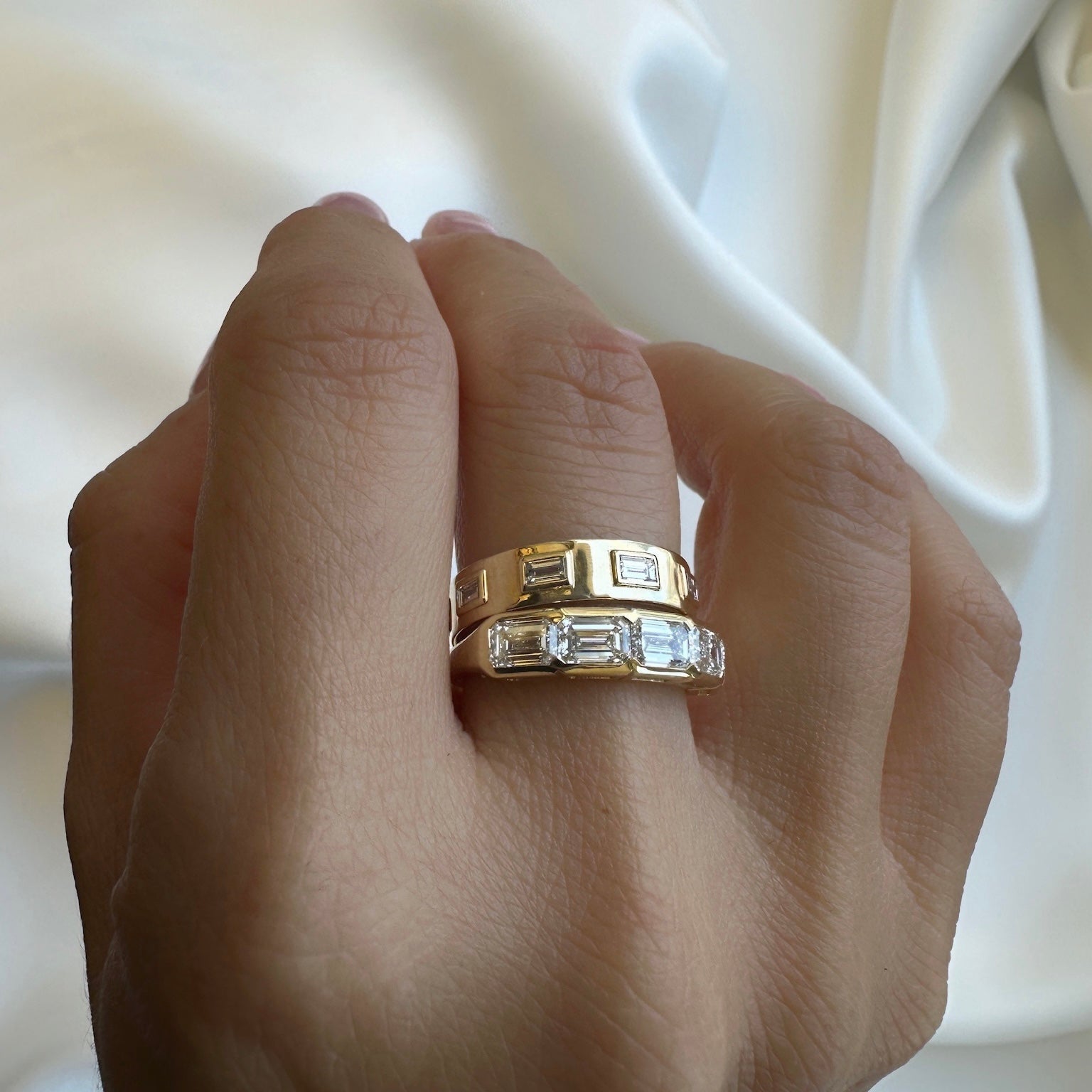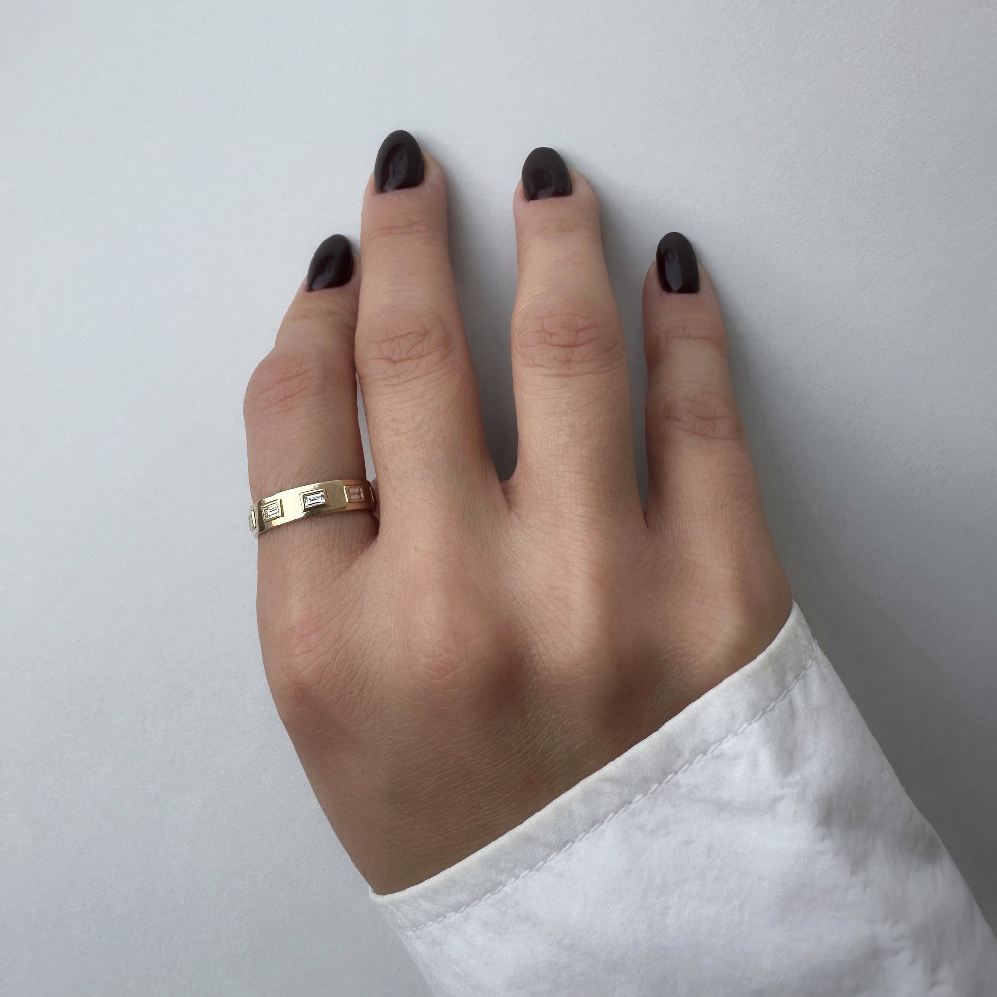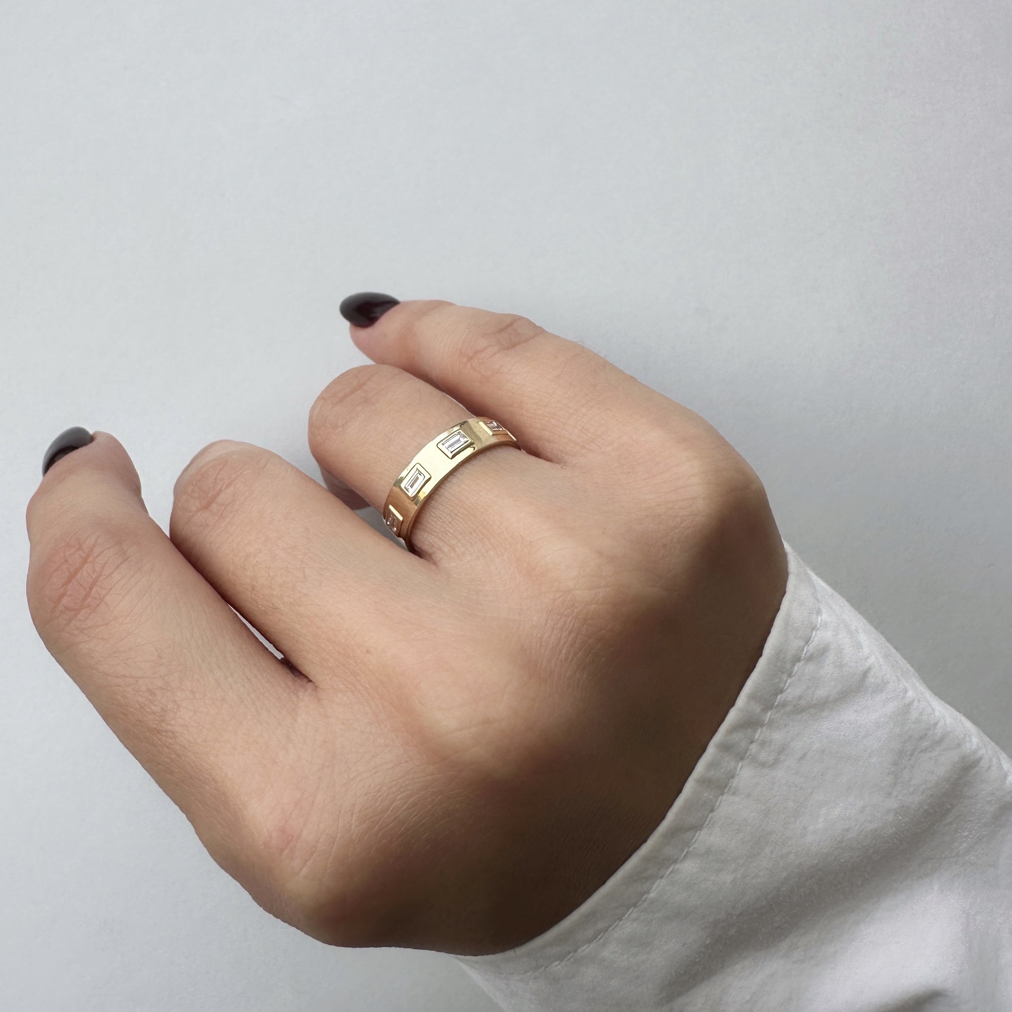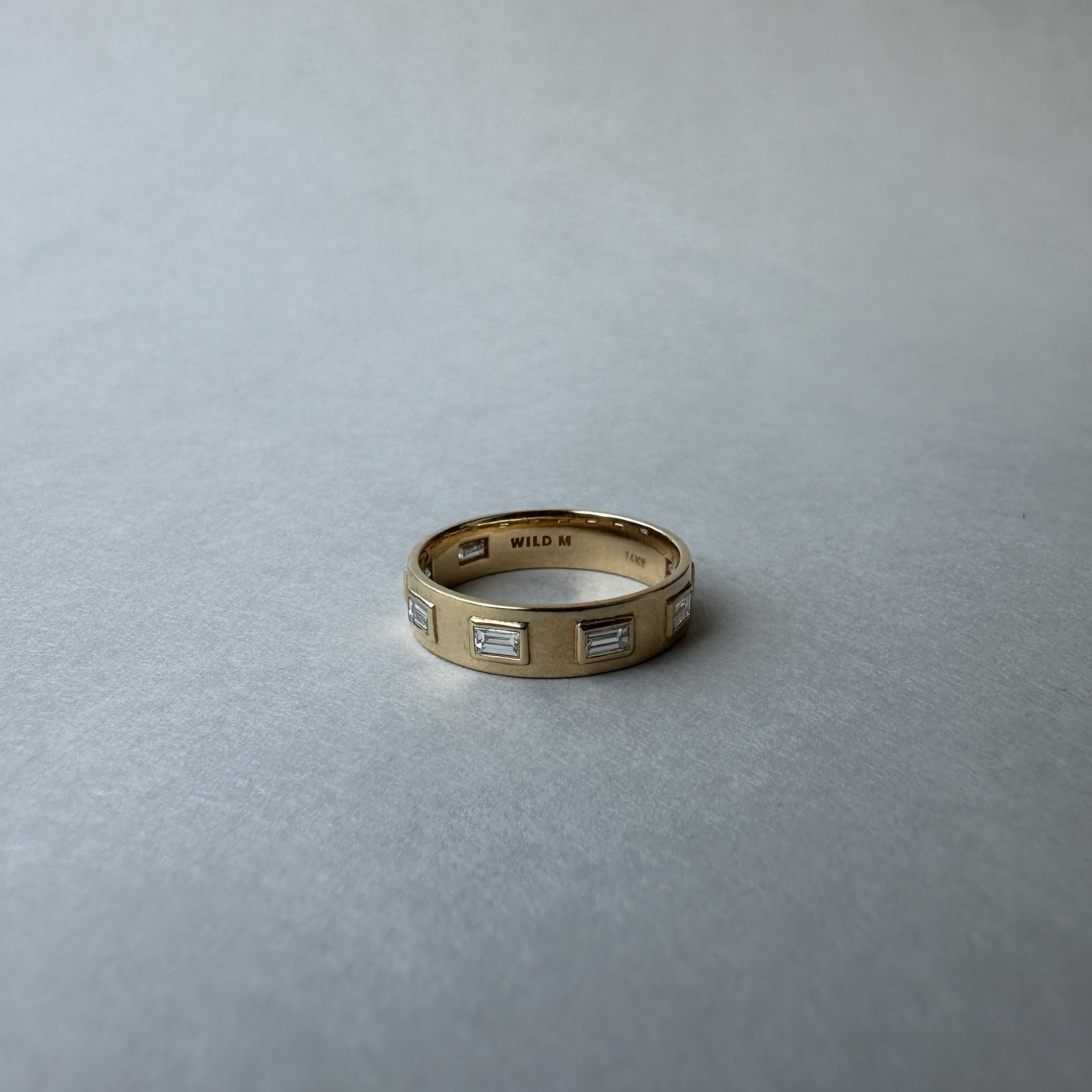 A wide and present gold ring, set with 7 sparkling baguette diamonds.