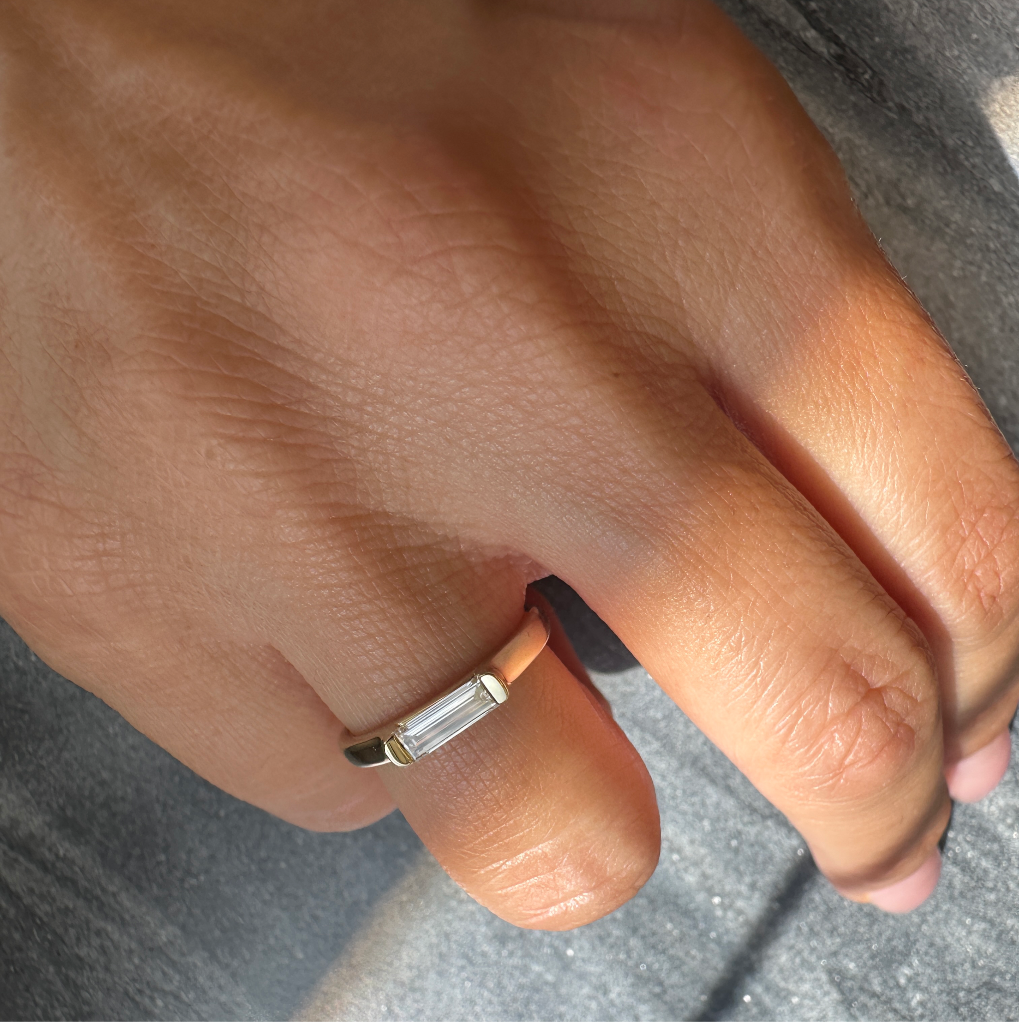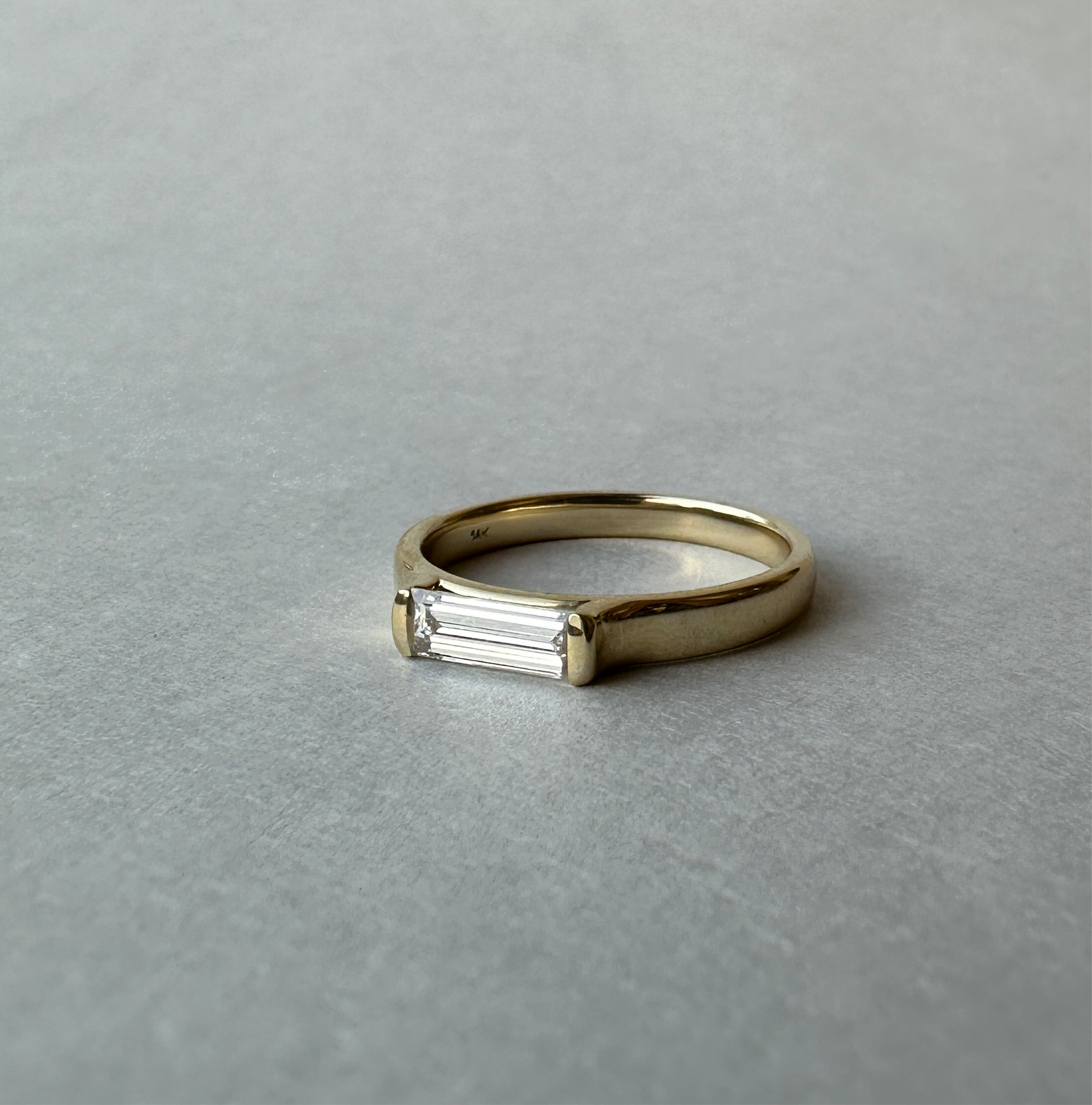 Clear and bright elongated Lab Grown Baguette Diamond, set in a sleek 14K gold ring. Exquisite, minimalistic yet remarkable.