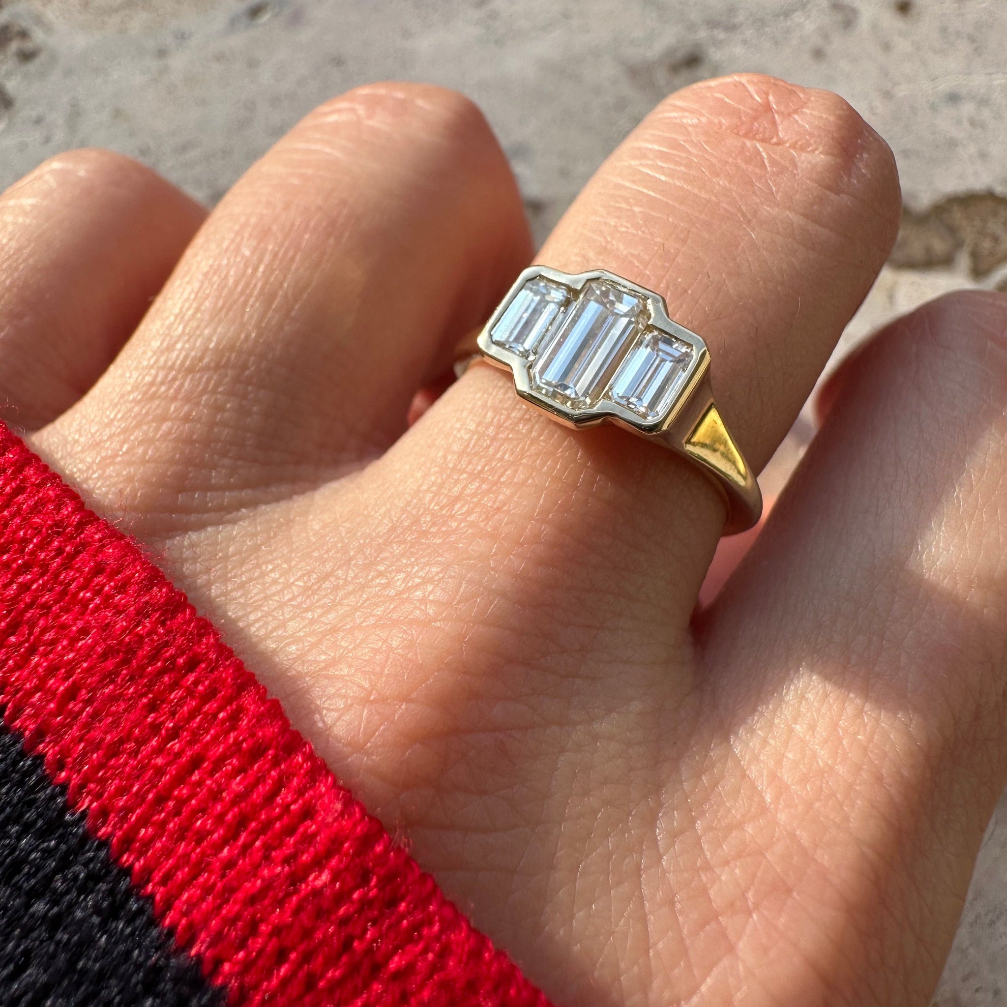 Three natural Emerald Cut Diamonds set together in a fine gold frame making an exquisite three stone ring.