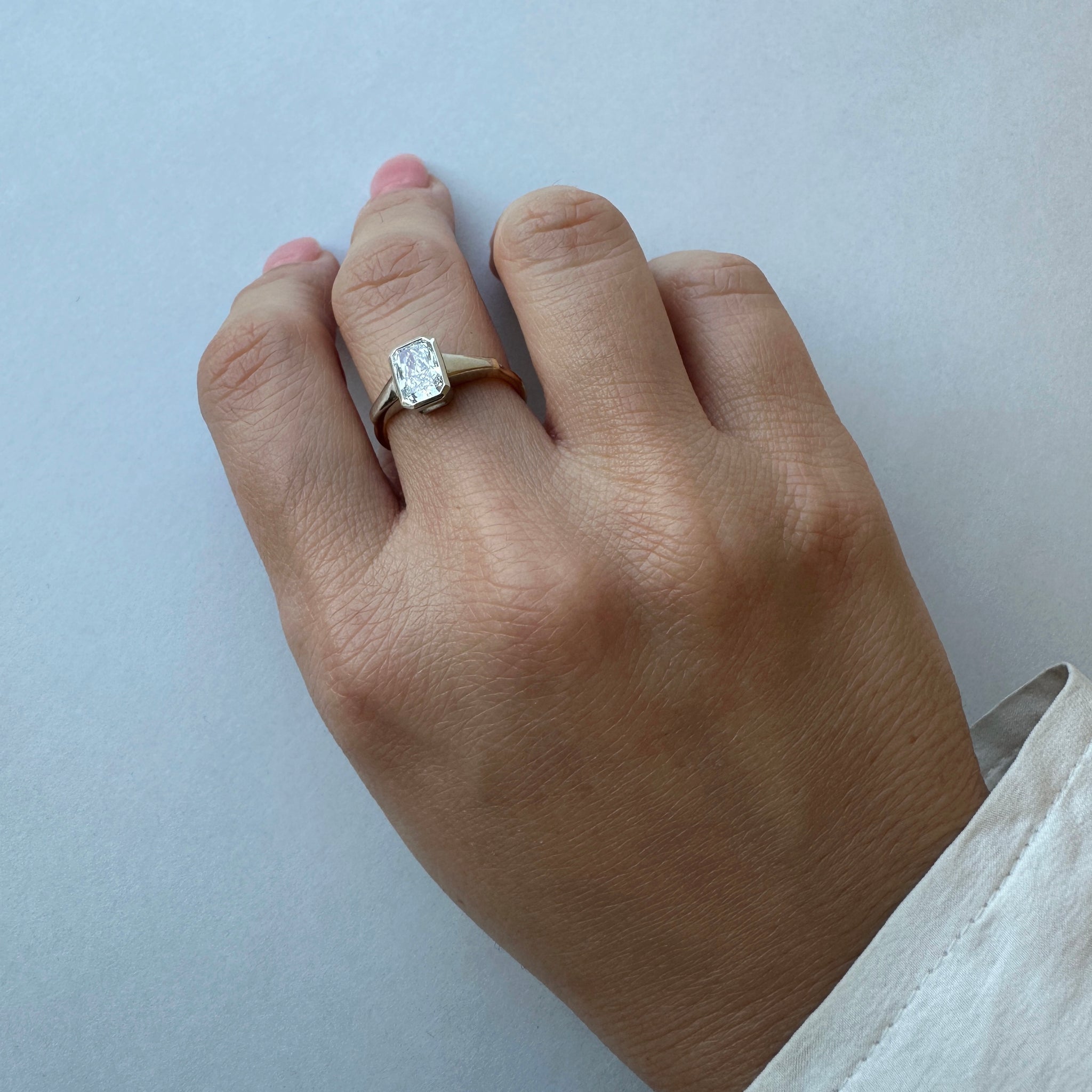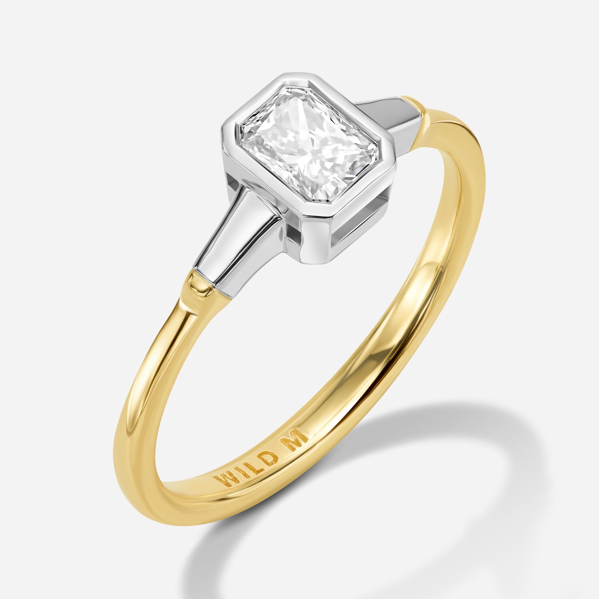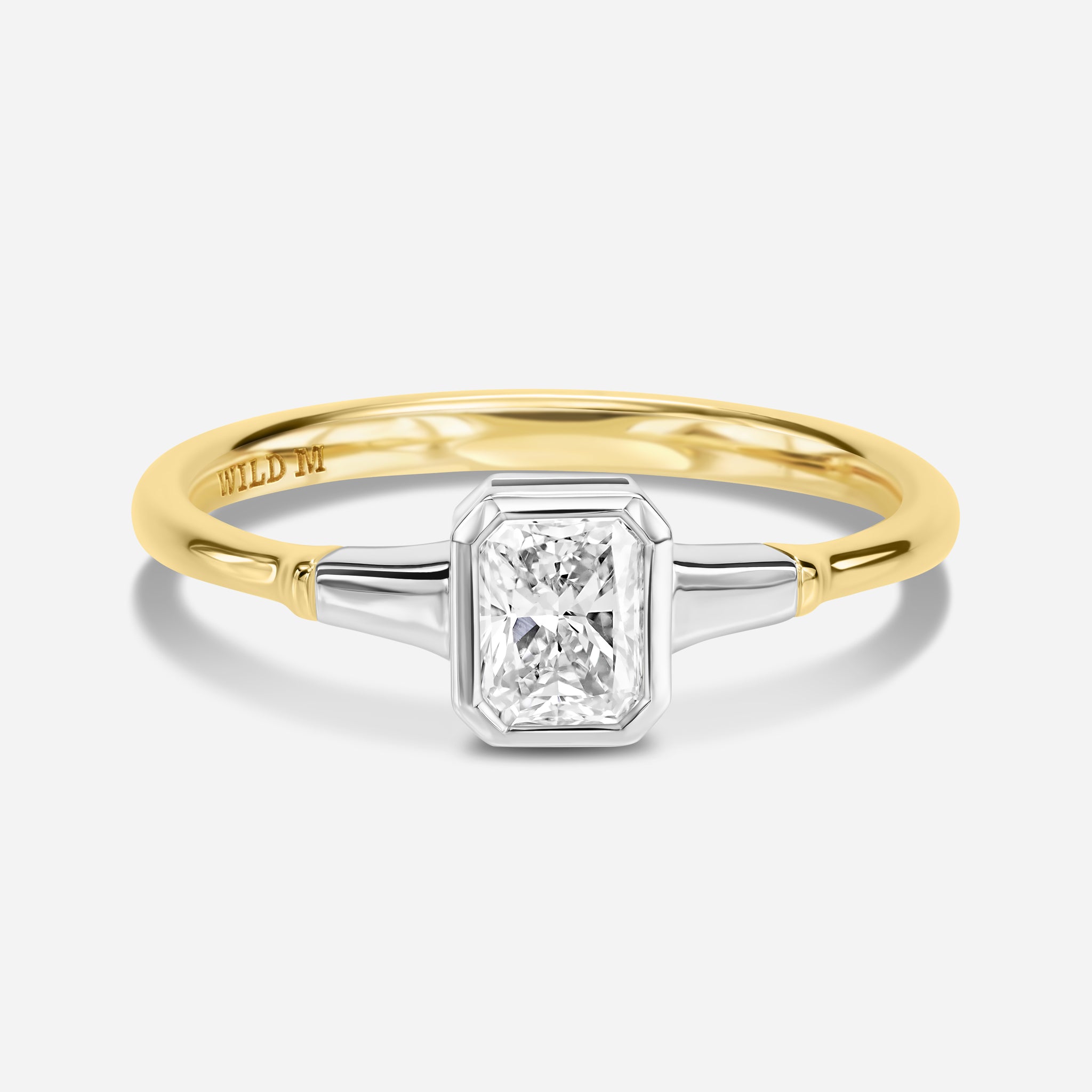 Our signature ring in a unique Two Tone version, set with a Radiant Diamond in a gold Bezel Setting.