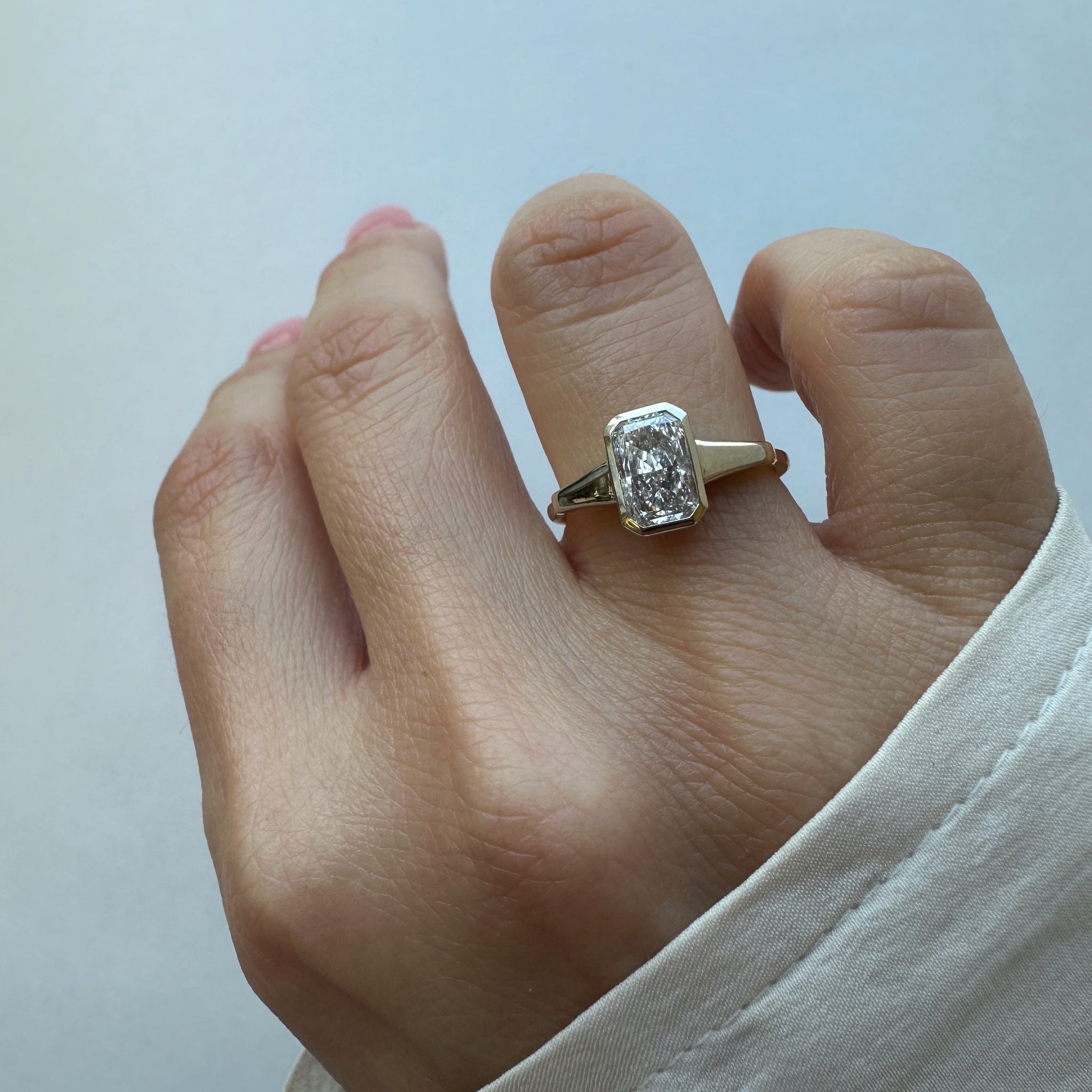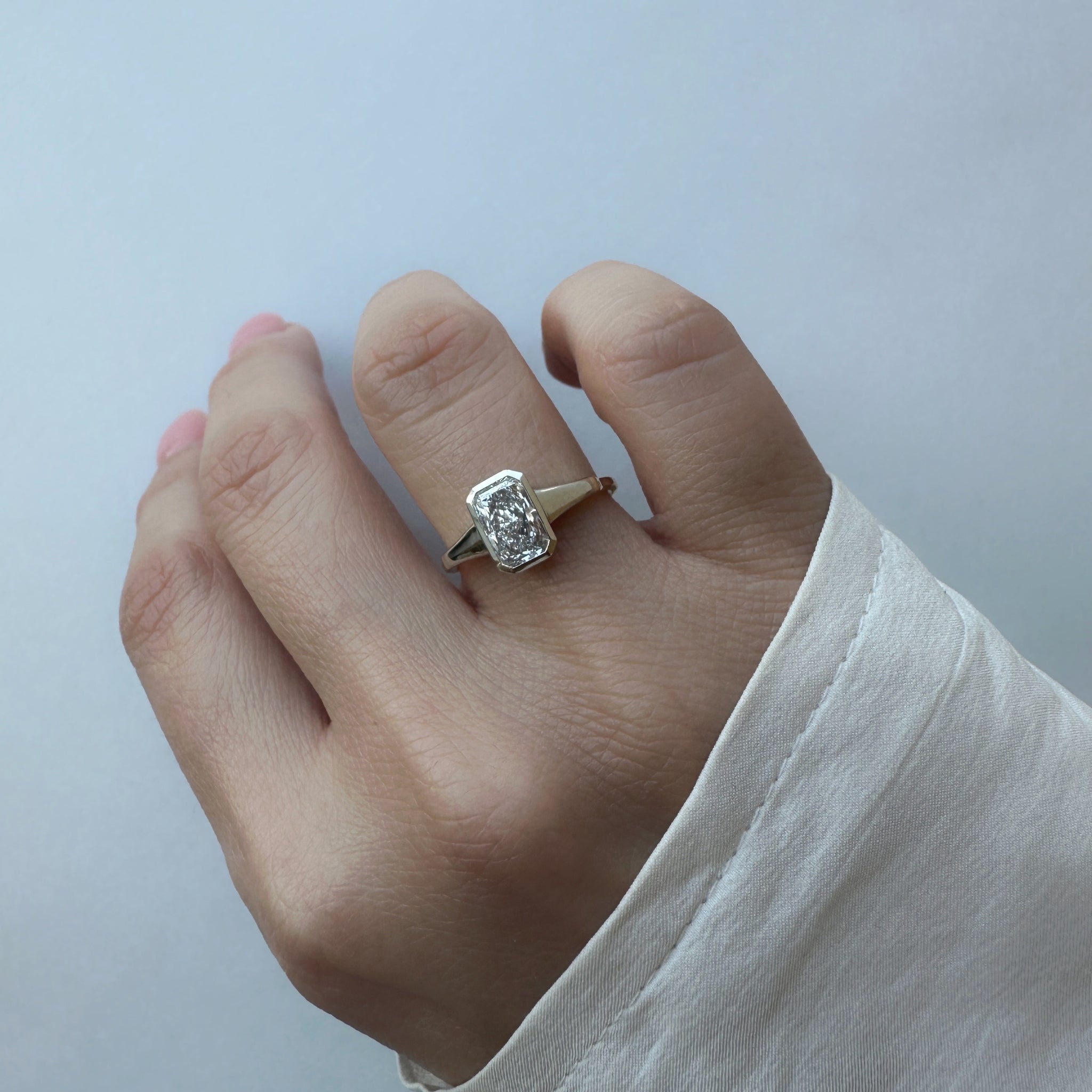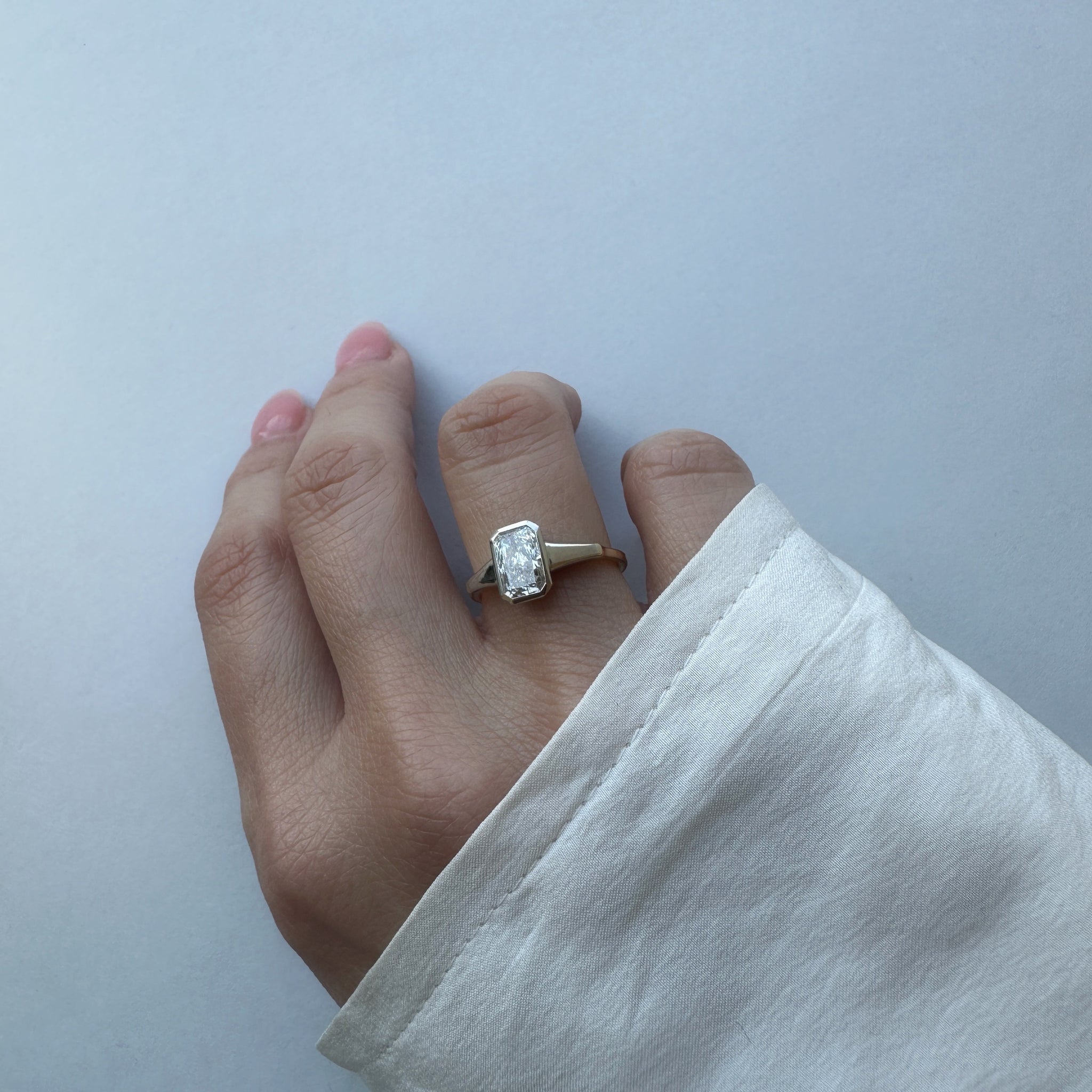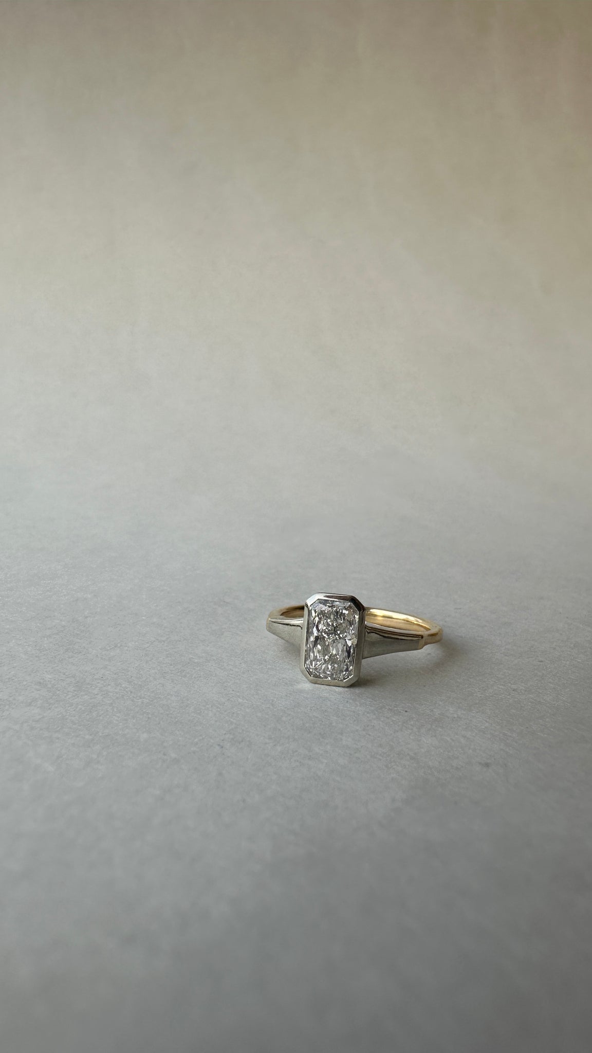 Our signature ring in a unique Two Tone version, set with a Radiant Diamond in a gold Bezel Setting.